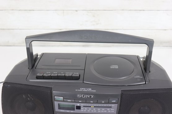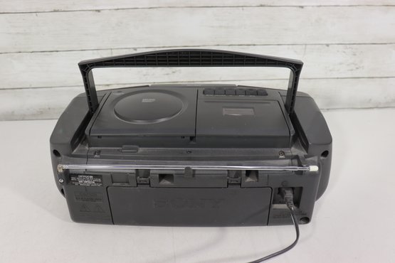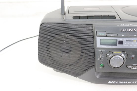 a Sony Mega Bass portable CD/cassette AM/FM radio boombox, a classic all-in-one stereo perfect for everyday use or as a nostalgic addition to a vintage audio collection.