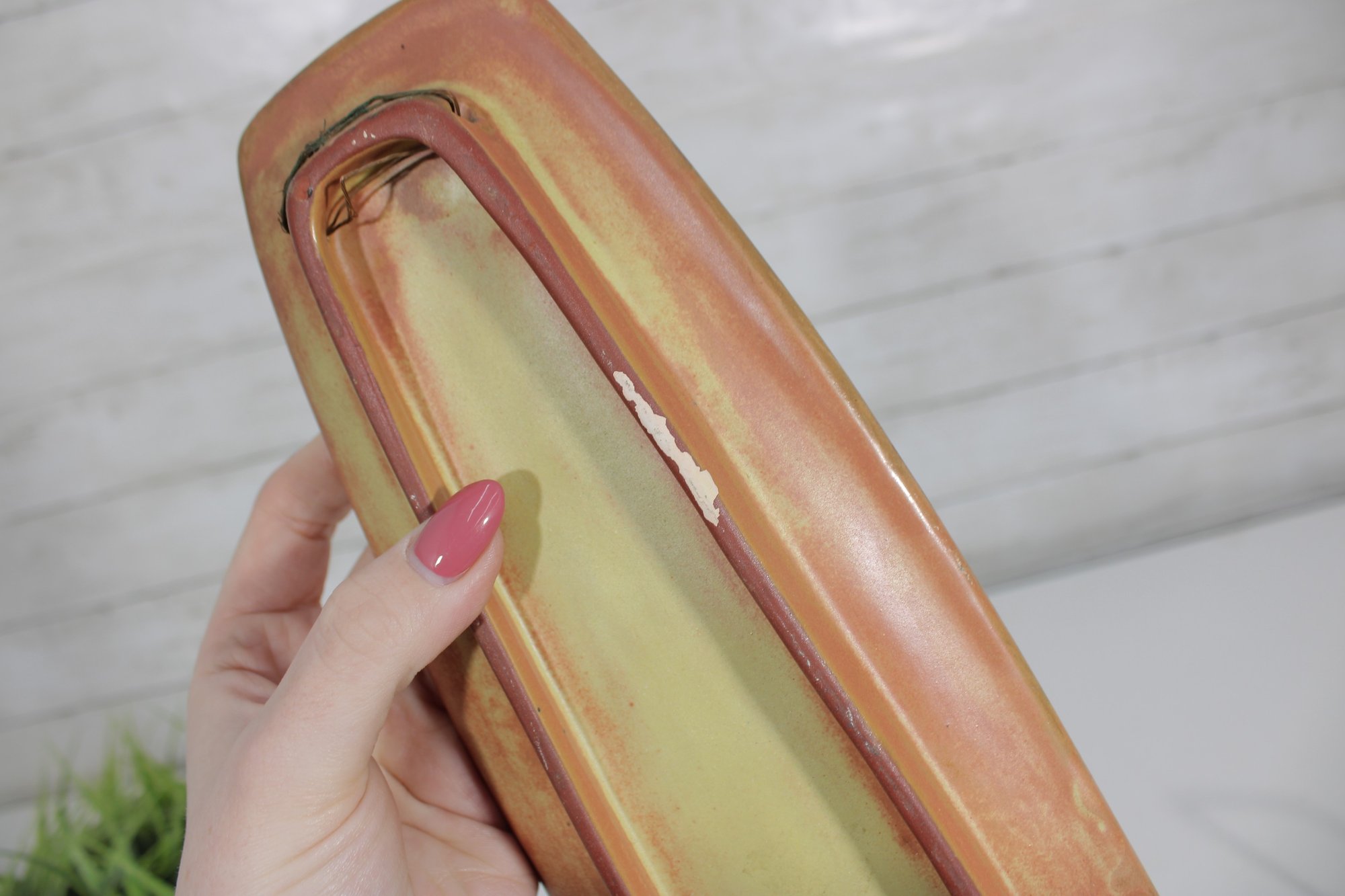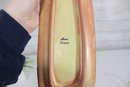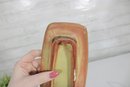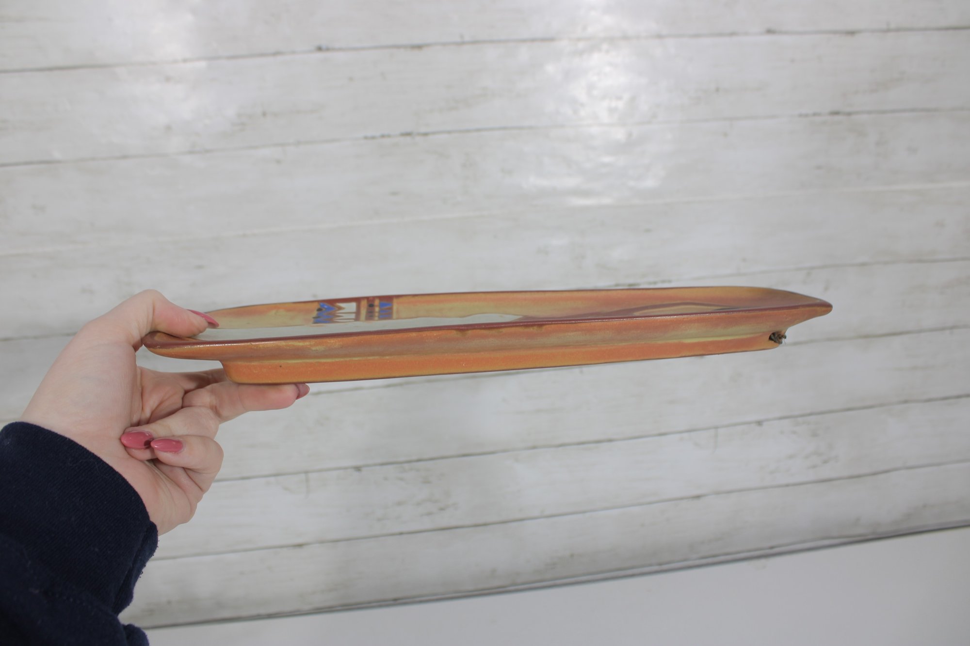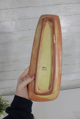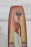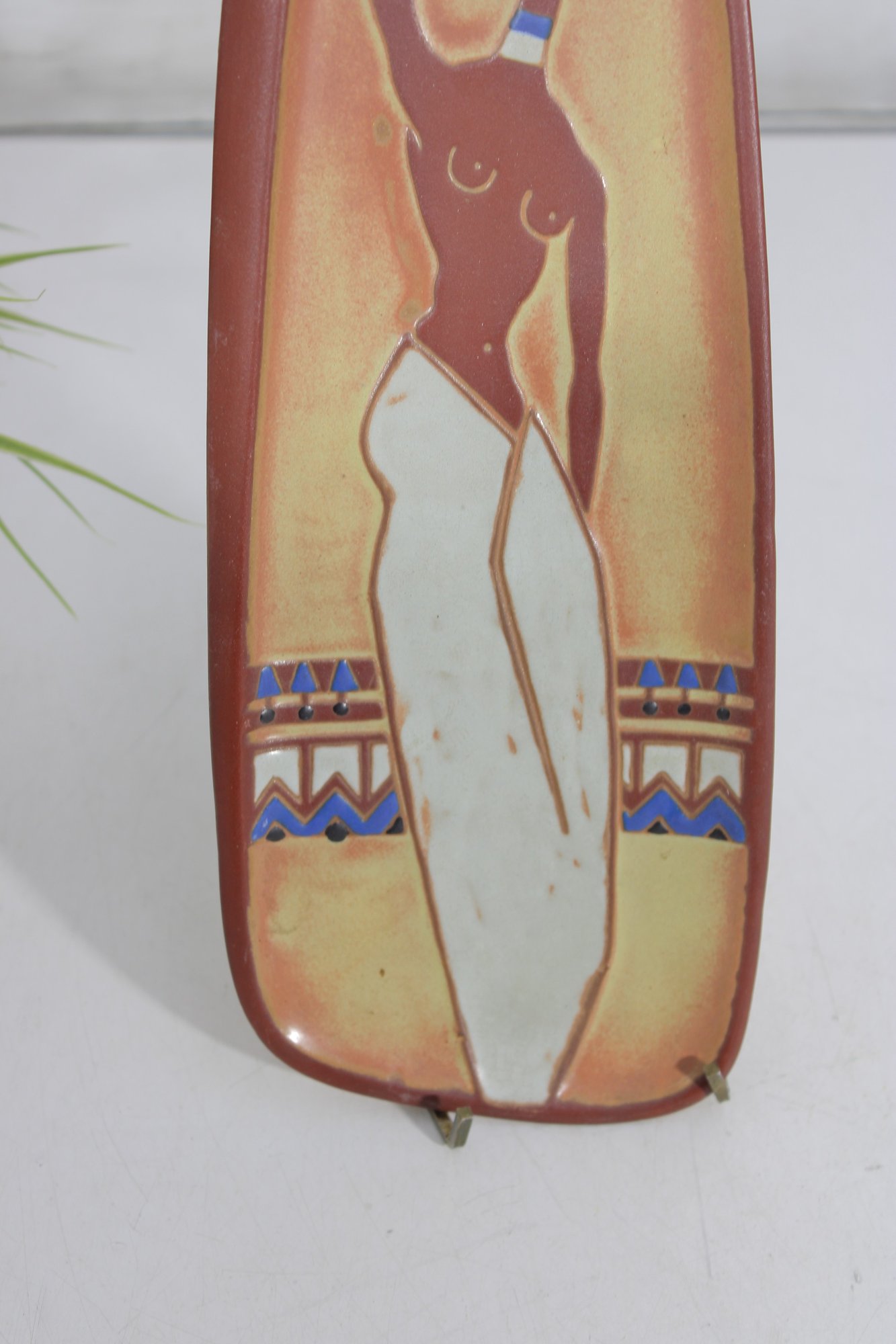 Striking South African pottery wall plate featuring a stylized African female figure carrying a vessel, rendered in warm earth tones of ochre, brown, and amber. This elongated decorative piece measures approximately 13 inches tall by 5 inches wide and has a beautifully sculpted, slightly curved form.
