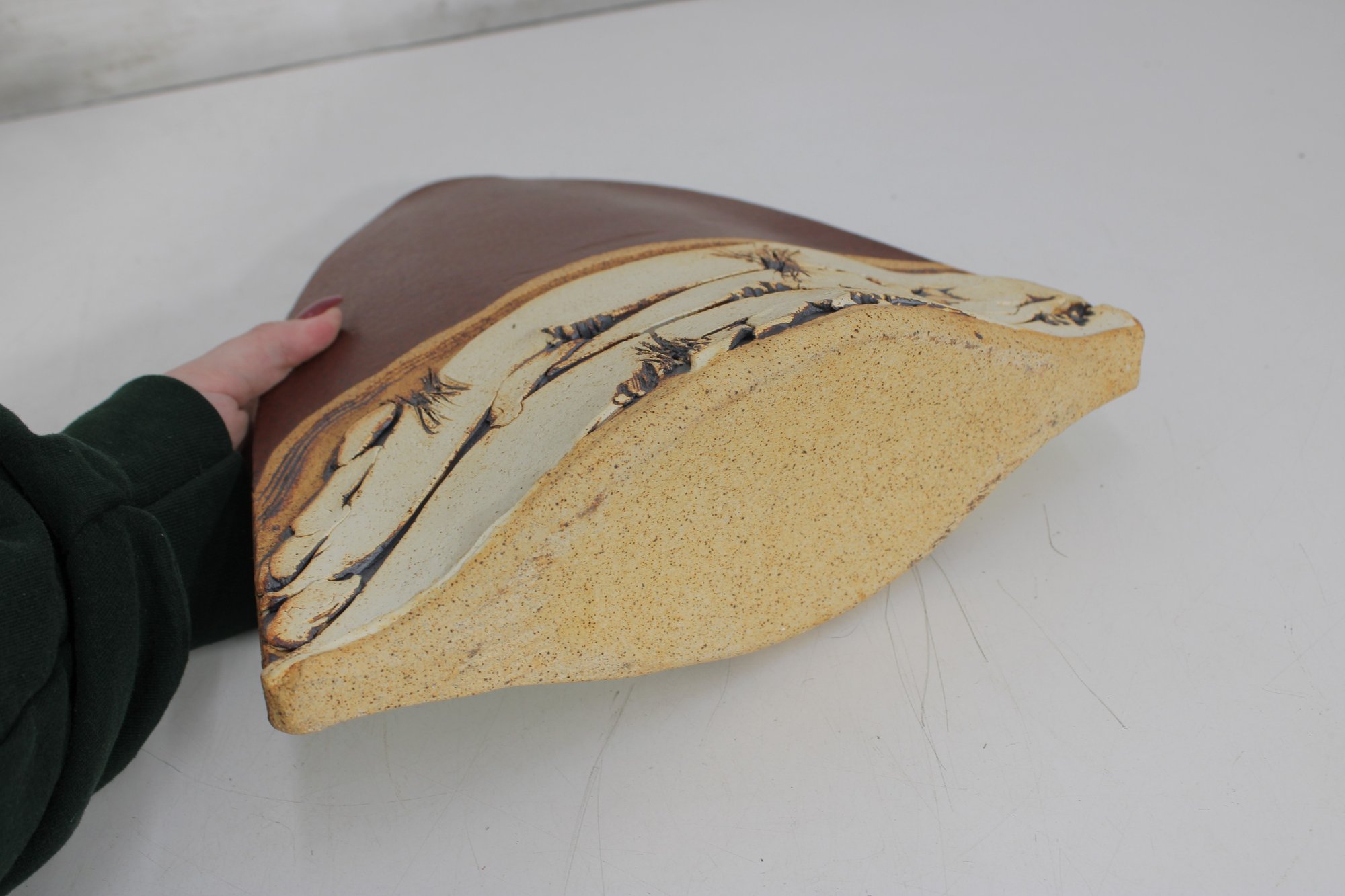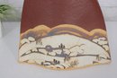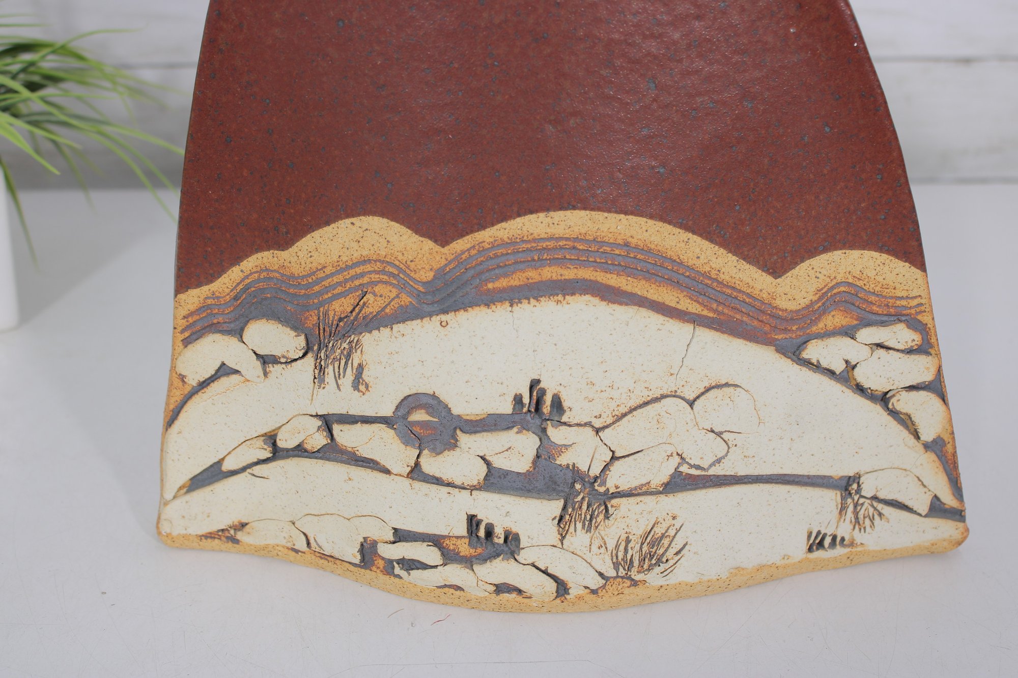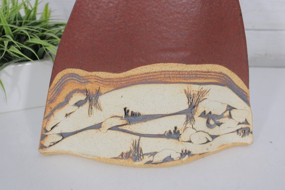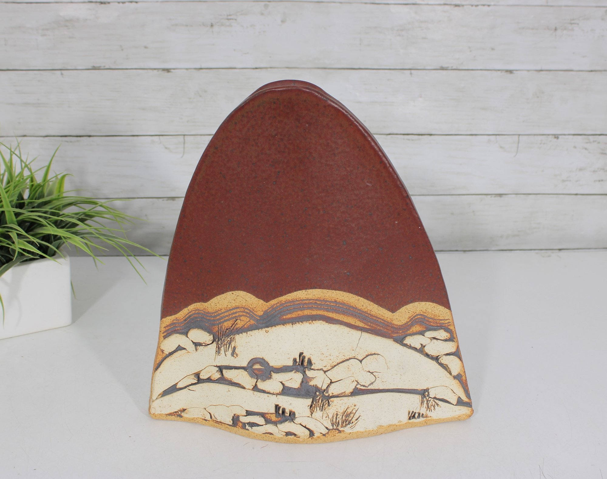 This sculptural piece has a distinctive arched silhouette and showcases a hand-decorated Southwestern scene across the front. The landscape depicts rolling desert hills, natural terrain, and stylized scenery rendered in earthy tones of rust, cream, ochre, and muted blue. The textured matte glaze and carved detailing give the piece depth and visual warmth, characteristic of Southwestern art pottery.