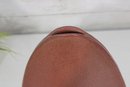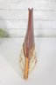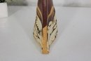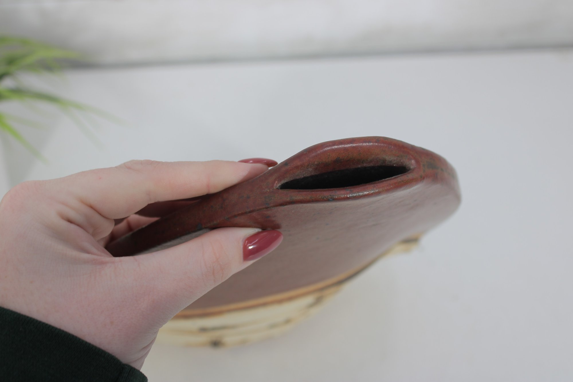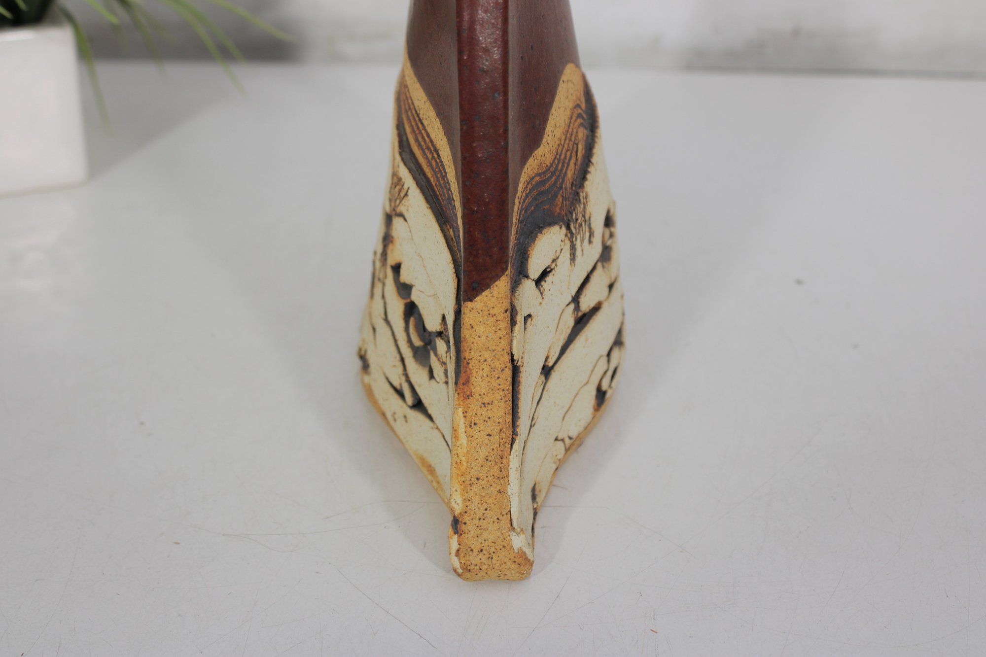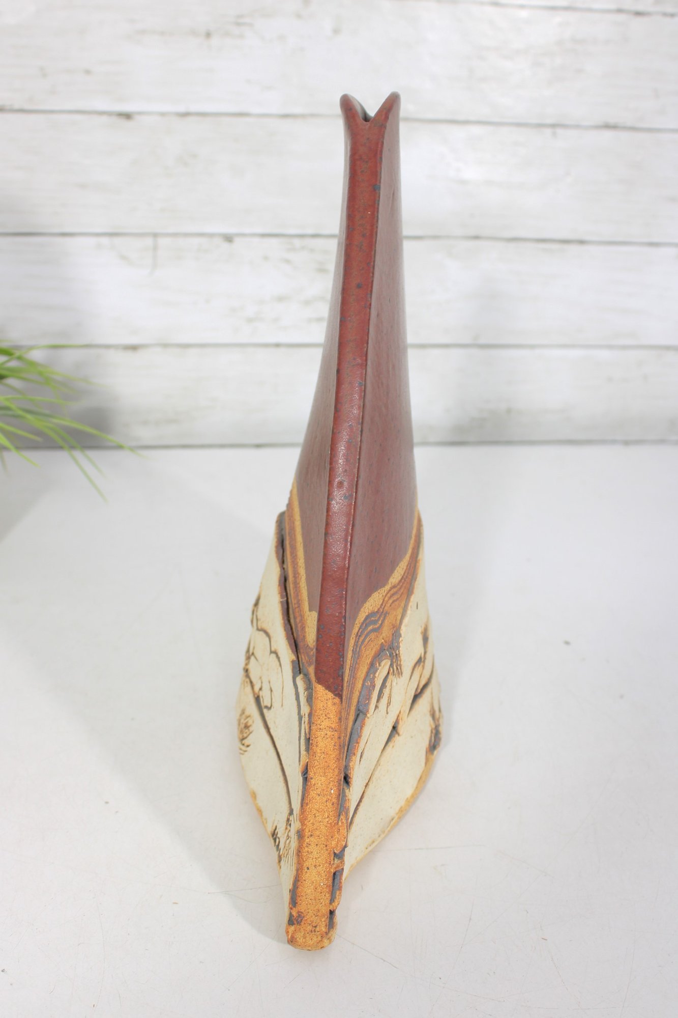 The vase has a narrow opening at the top, making it ideal as a decorative art object or for displaying dried botanicals. The back and body feature a rich, textured rust-colored glaze, while the base remains unglazed, showing the natural clay body.
