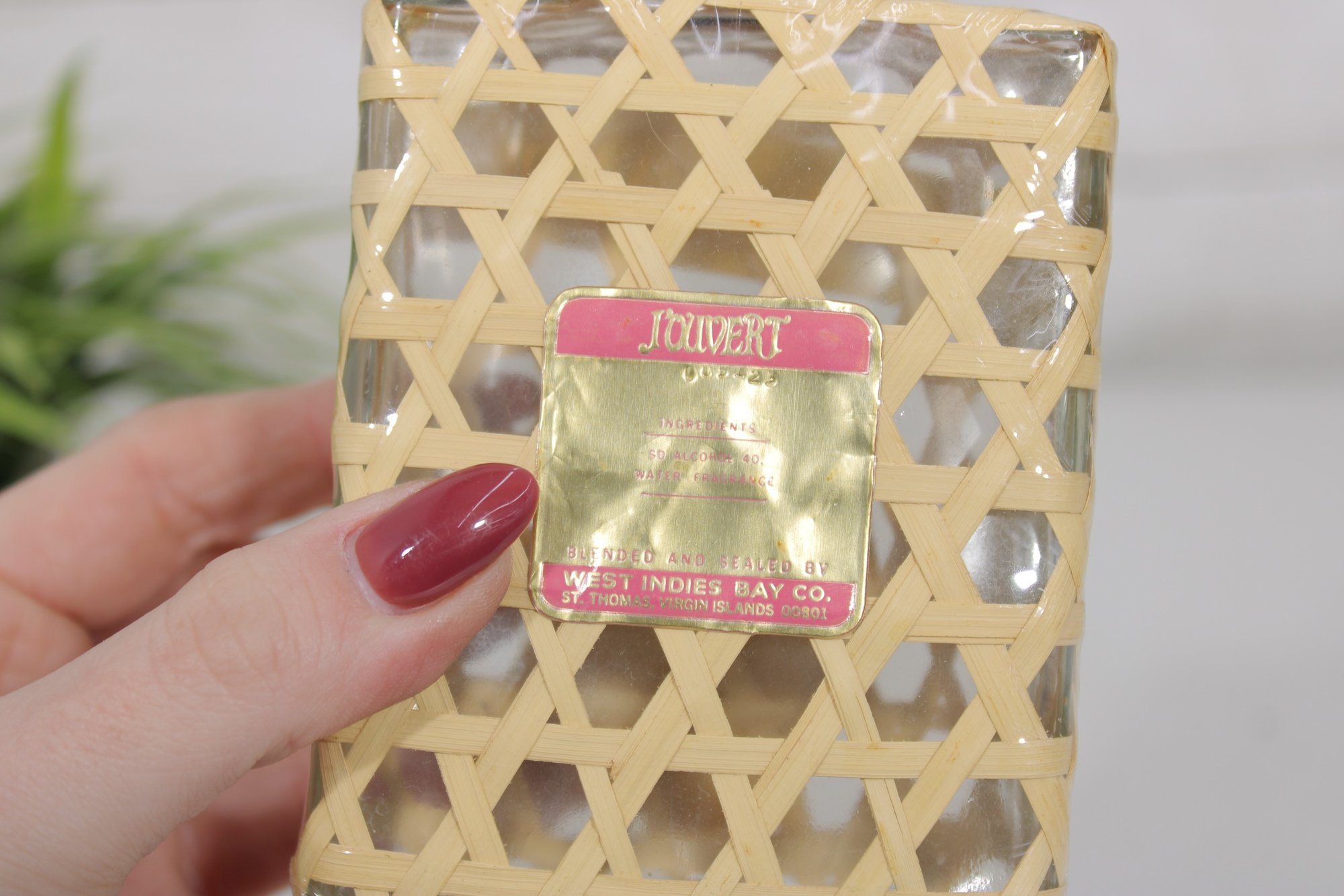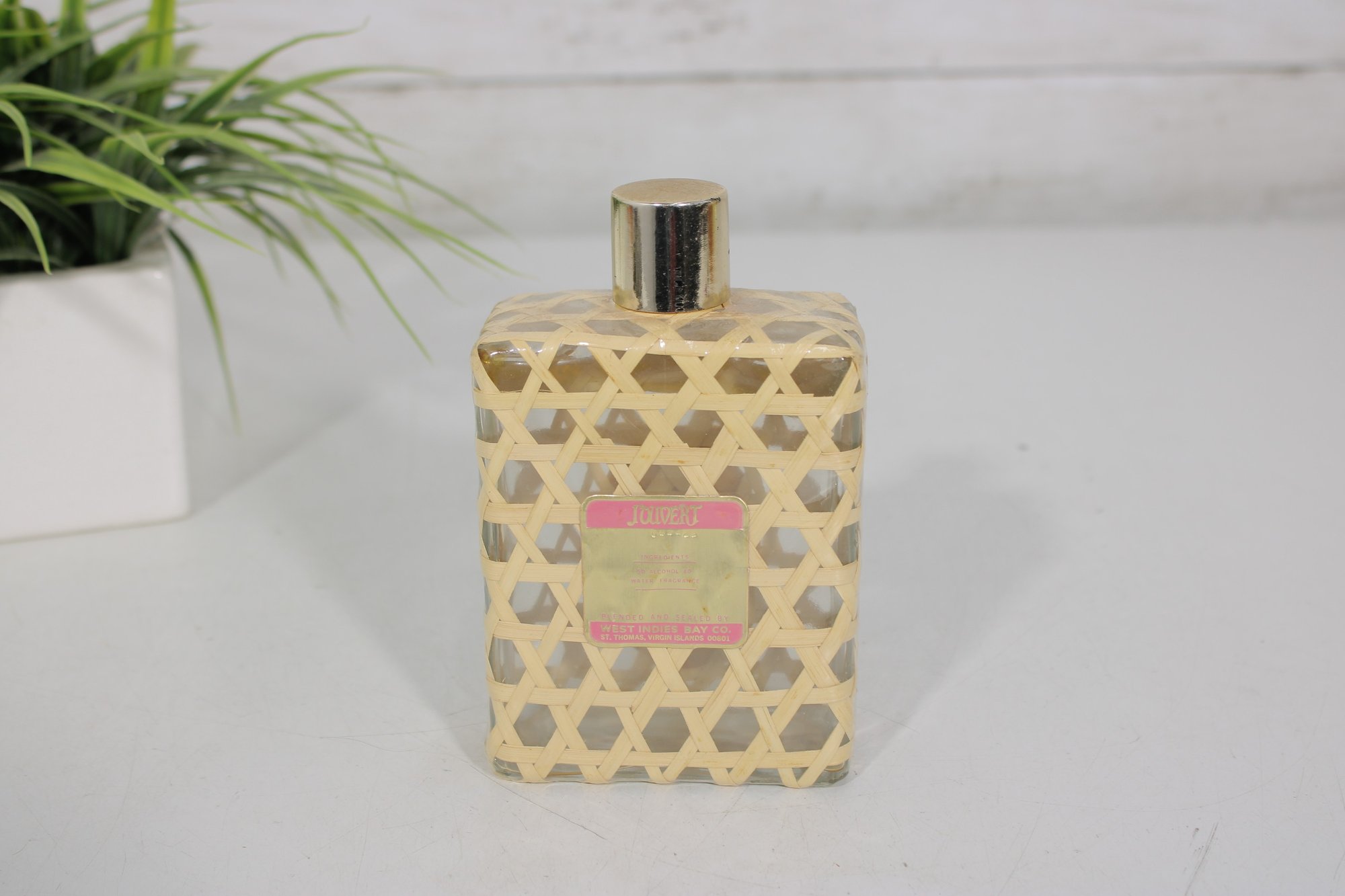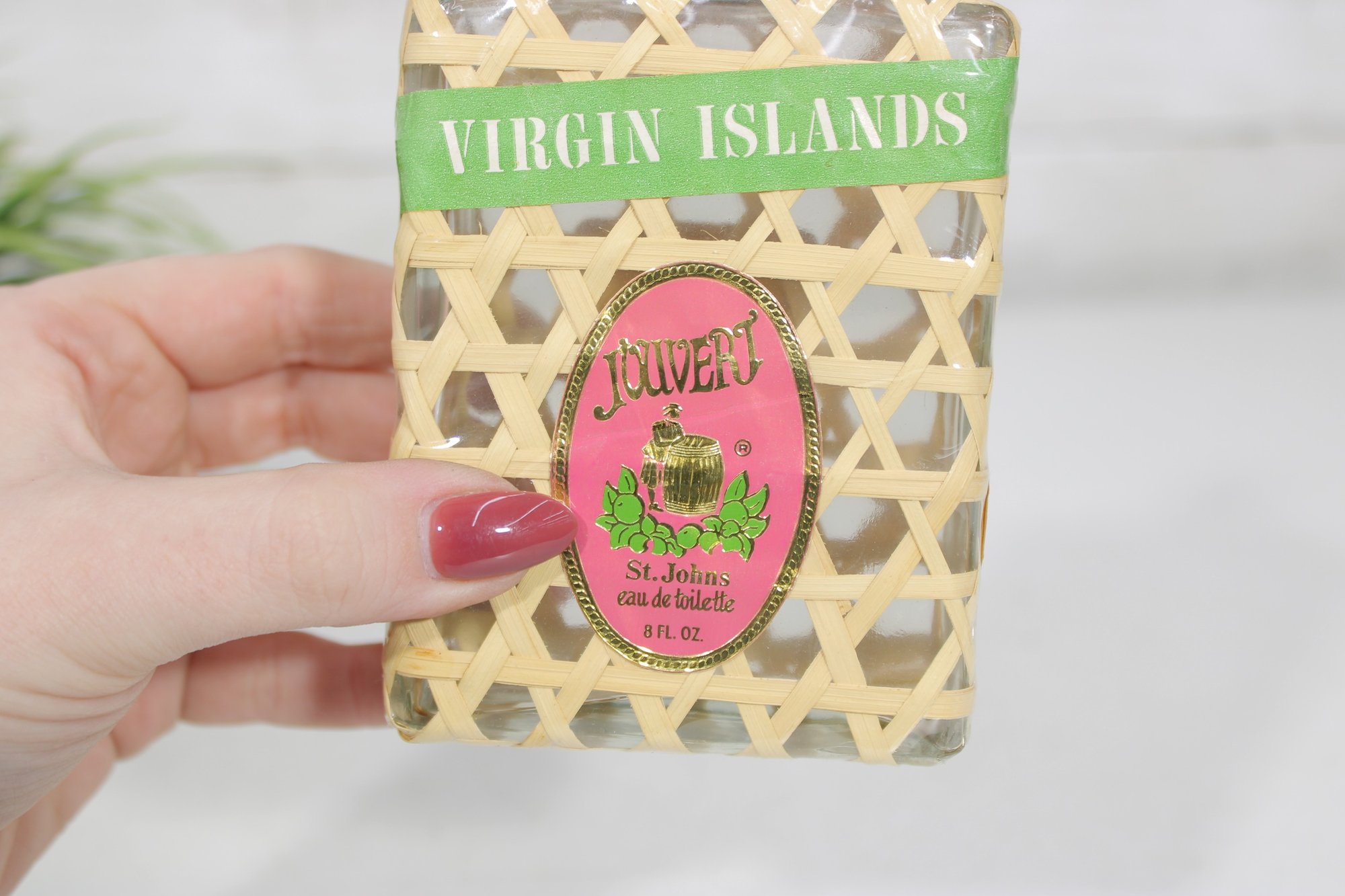 This classic Caribbean fragrance comes in its signature woven wicker-covered bottle, giving it a distinctive island-inspired look. The front label features the iconic pink and green St. John’s design, and the green “Virgin Islands” banner across the top adds to its authentic presentation.