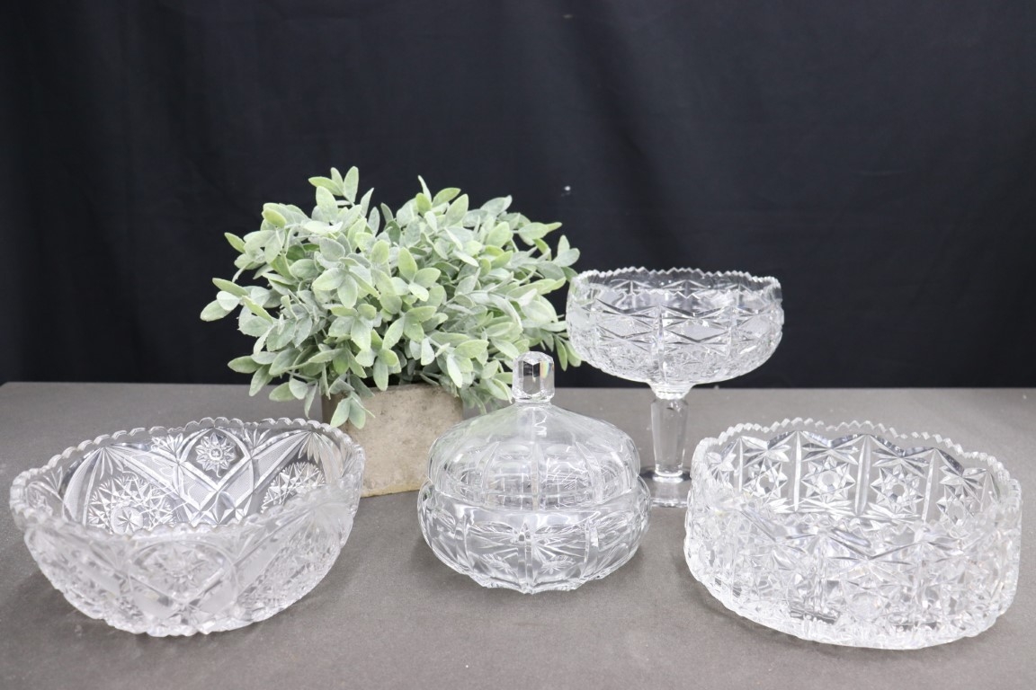 Stars, Diamond, And Scallops: Four Cut Crystal Glass Bowls - Flats, Pedestal, And Covered