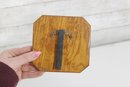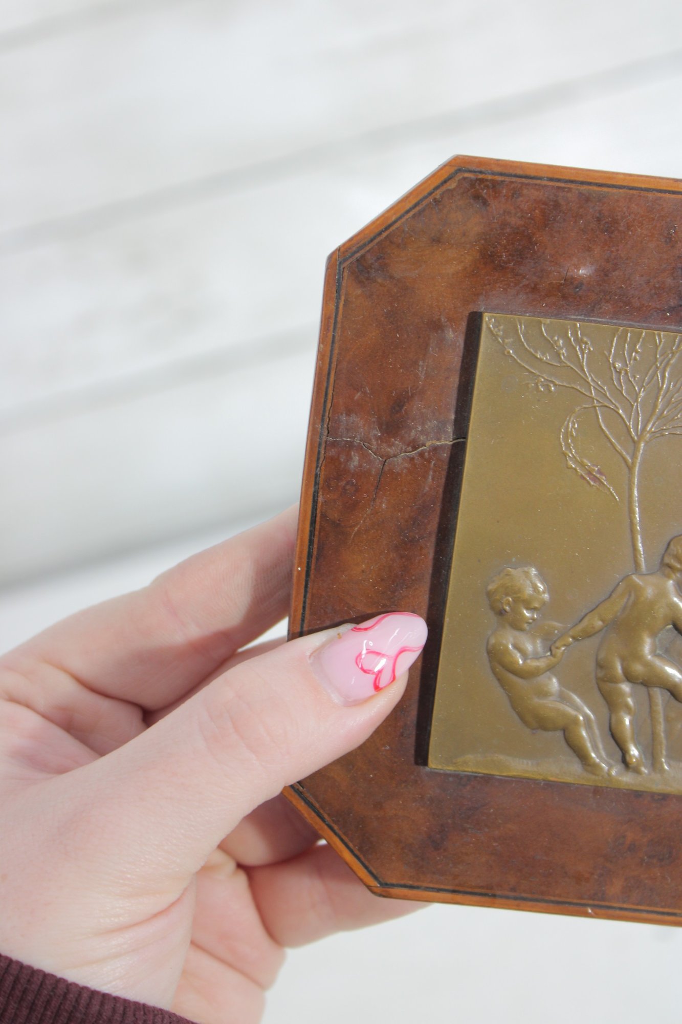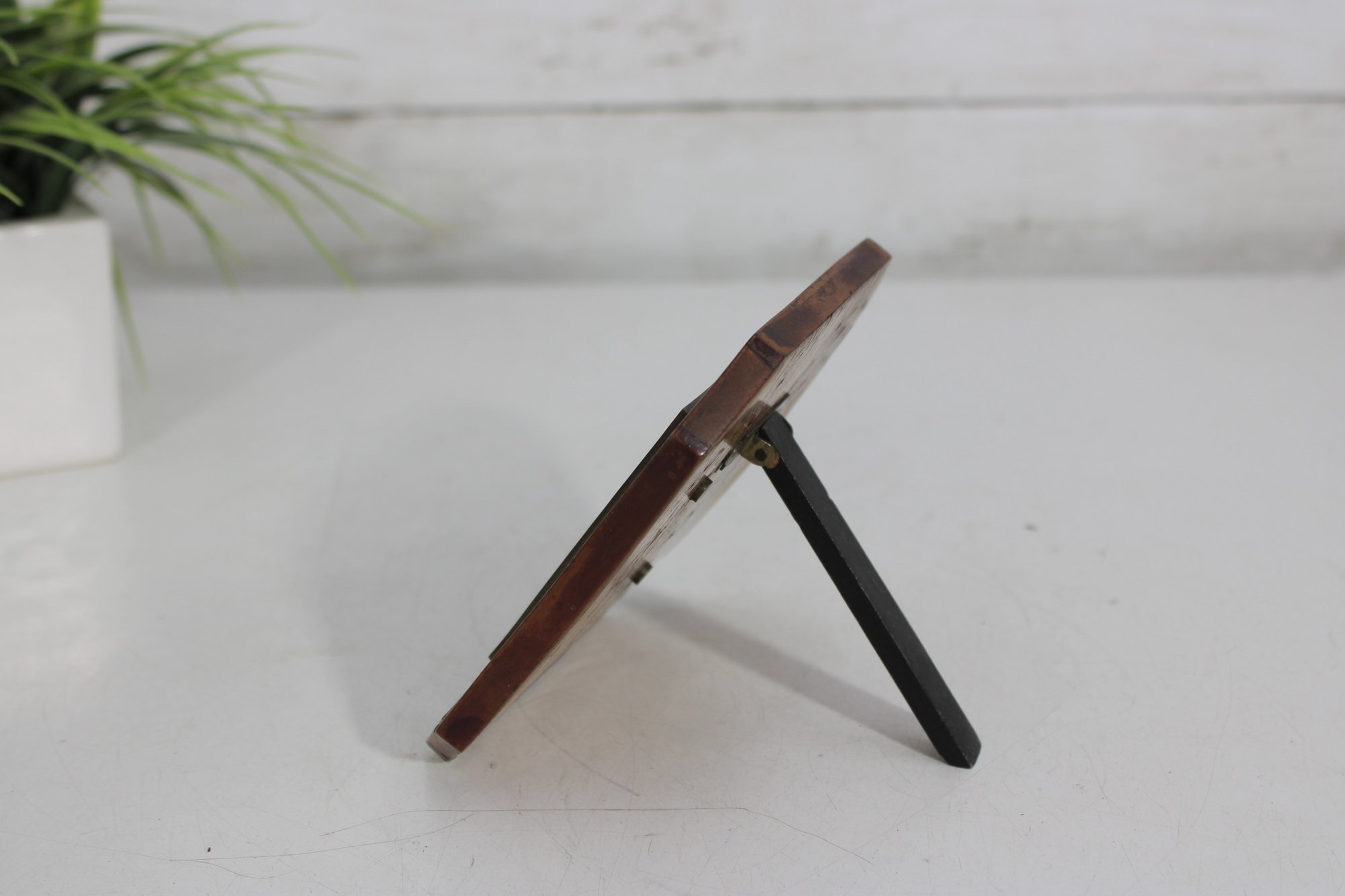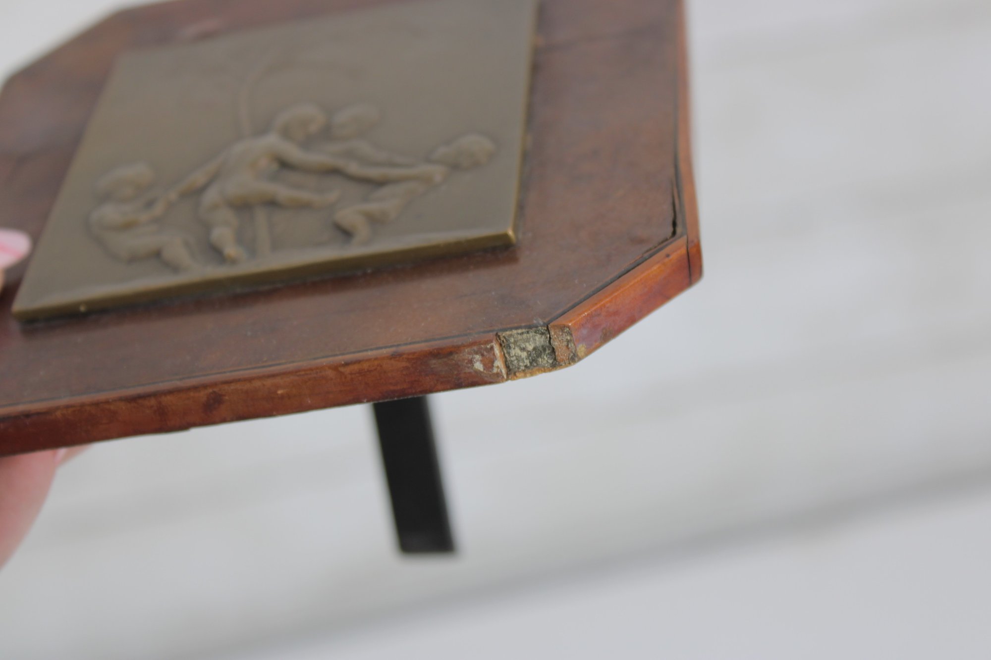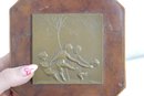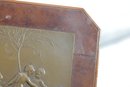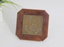 The bronze plaque is mounted within a beveled wooden frame featuring a warm burl-style finish. The piece is fitted with a rear easel stand for tabletop display.