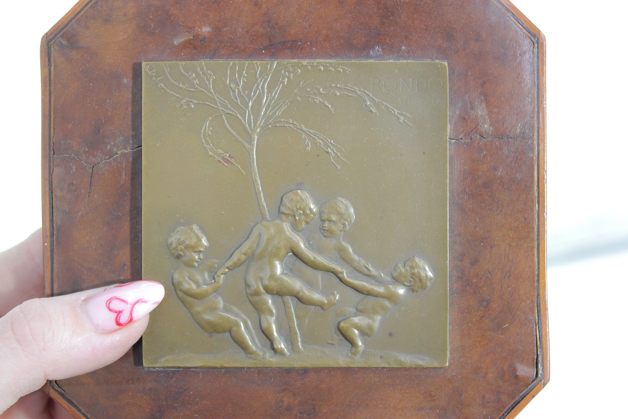 Charming bronze relief plaque titled “Rondo” by noted sculptor Stefan Schwartz, depicting a lively scene of dancing putti beneath a tree. The composition captures four cherubic figures in motion, holding hands in a joyful circular dance, rendered in soft sculptural relief.