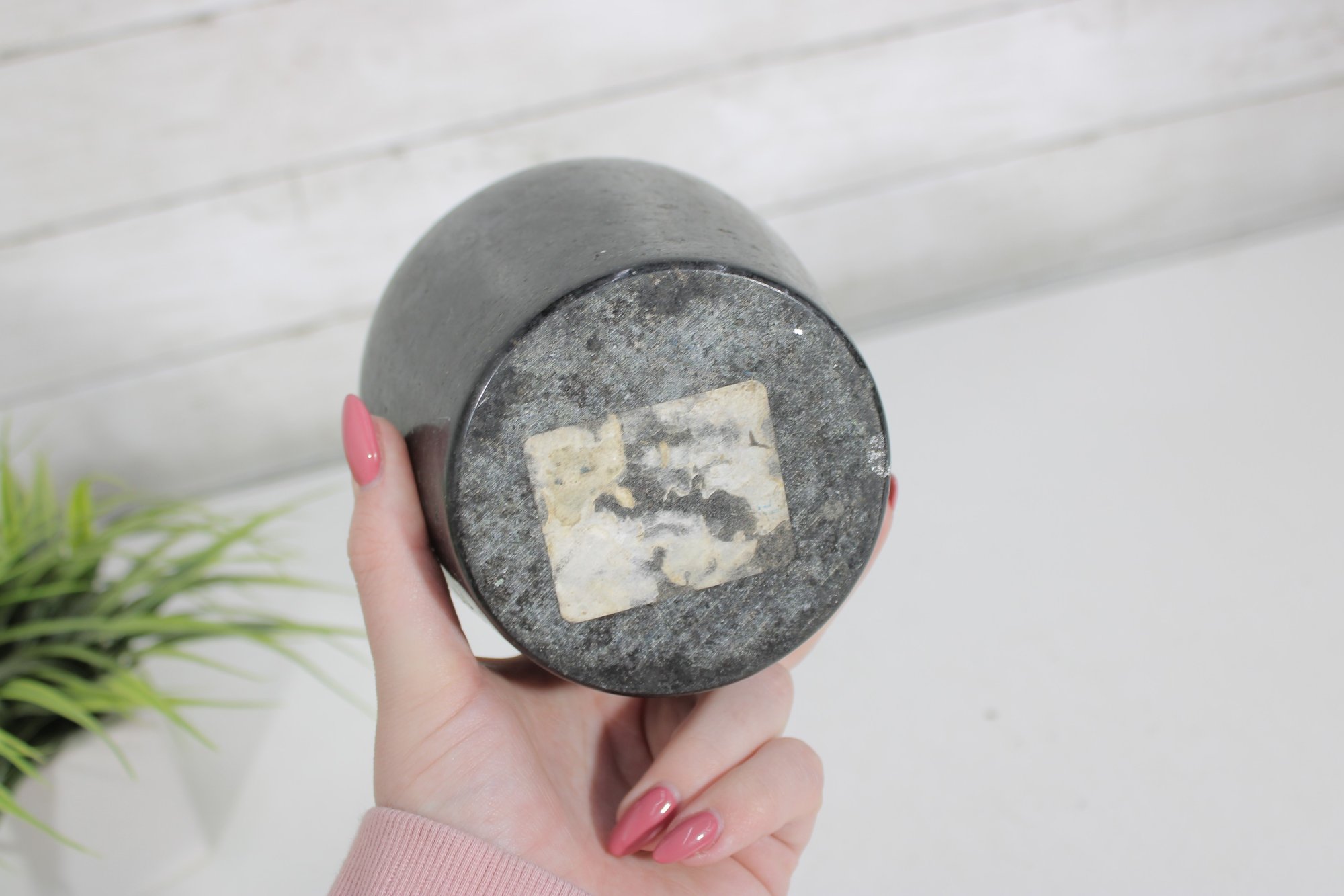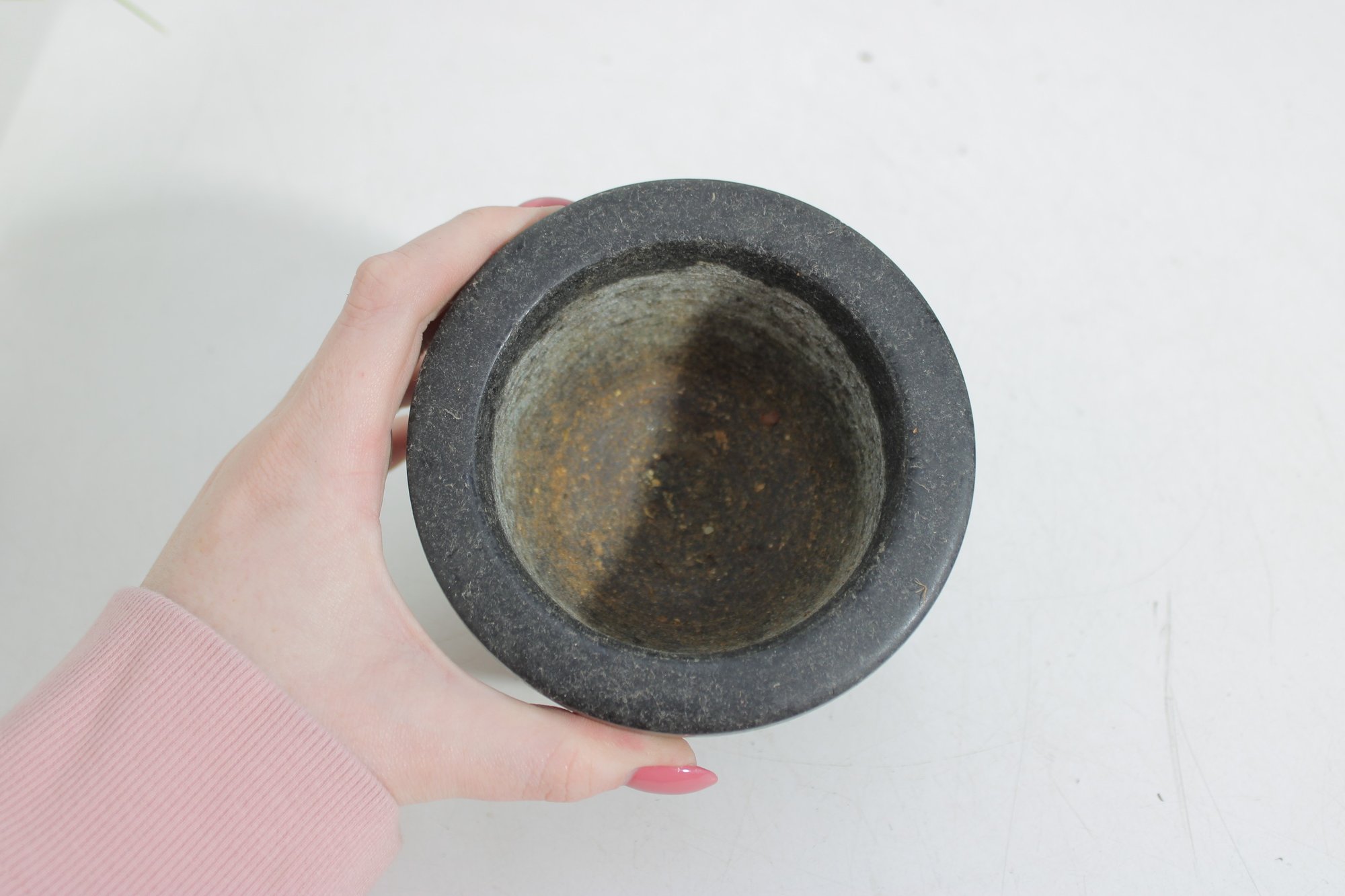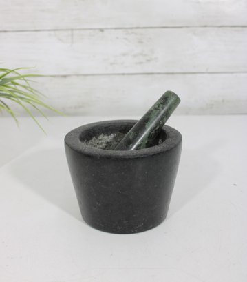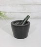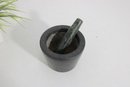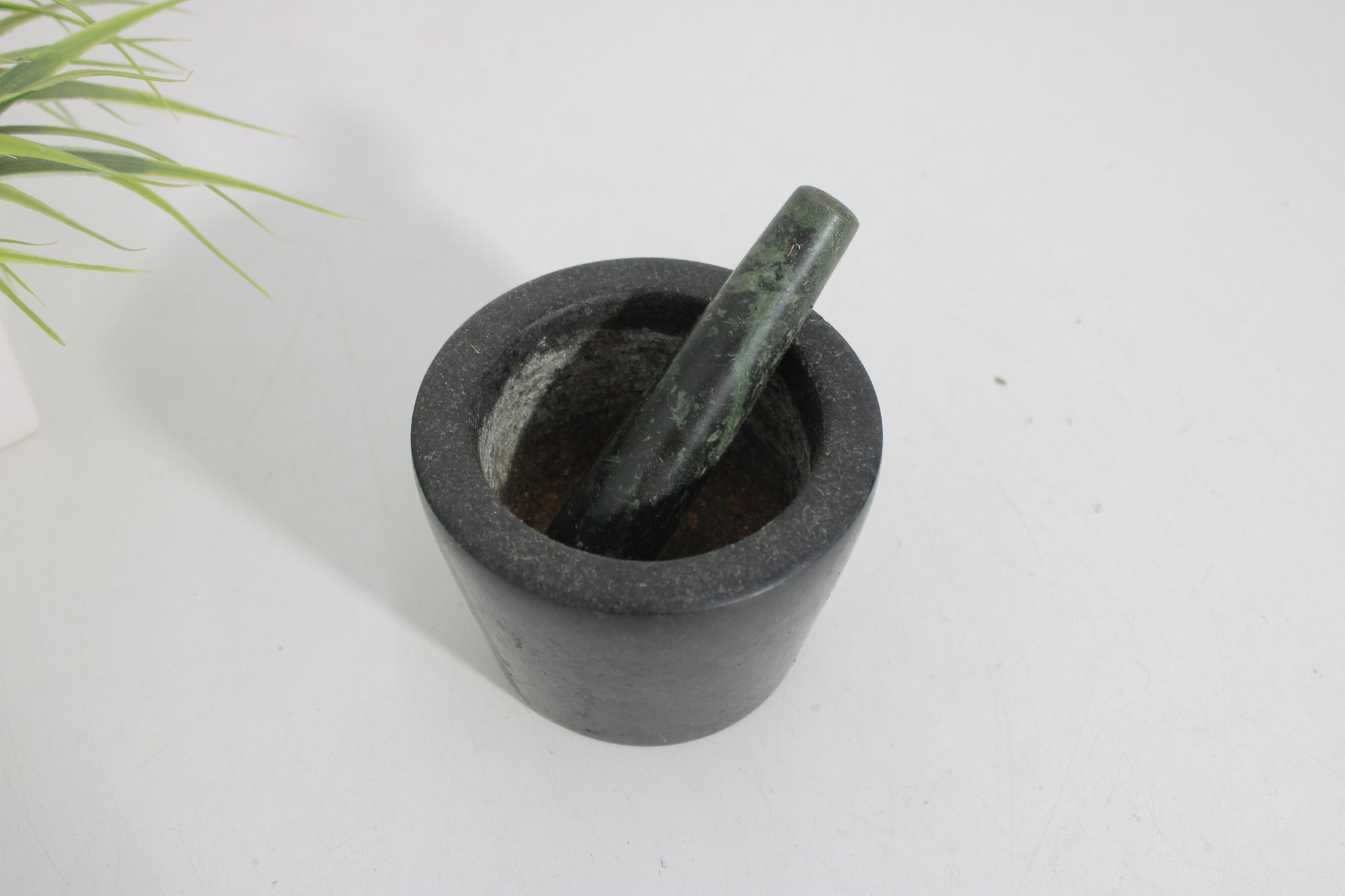 Classic stone mortar and pestle set, featuring a solid black stone bowl paired with a contrasting green marble pestle. The sturdy construction makes it ideal for grinding herbs, spices, and small ingredients, while also serving as a decorative kitchen accent.