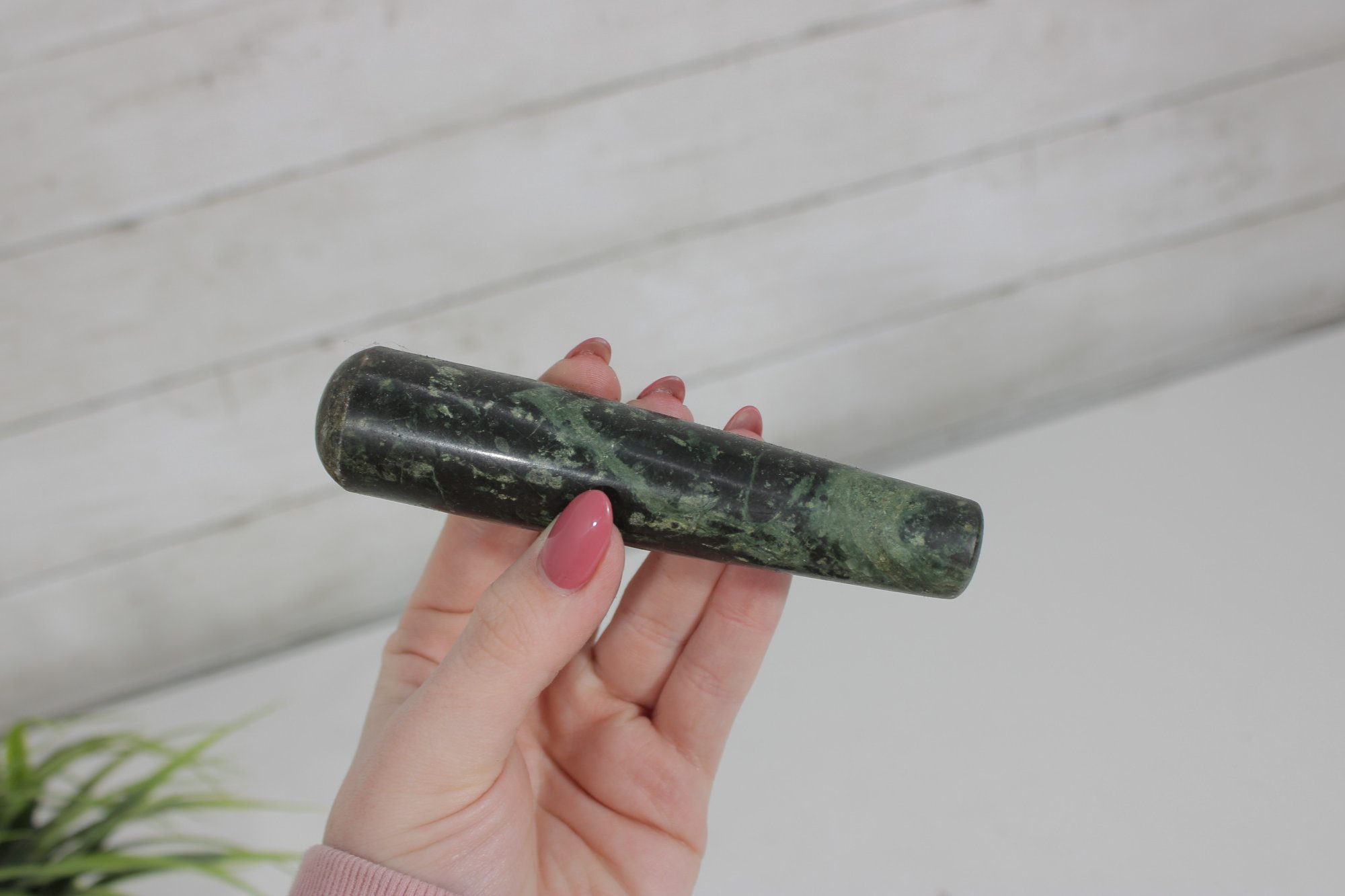 The interior of the mortar shows natural wear from prior use, adding character and authenticity. The pestle has a smooth, cylindrical form with attractive green marbling.