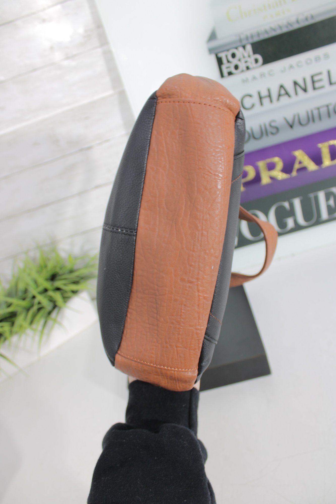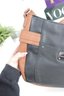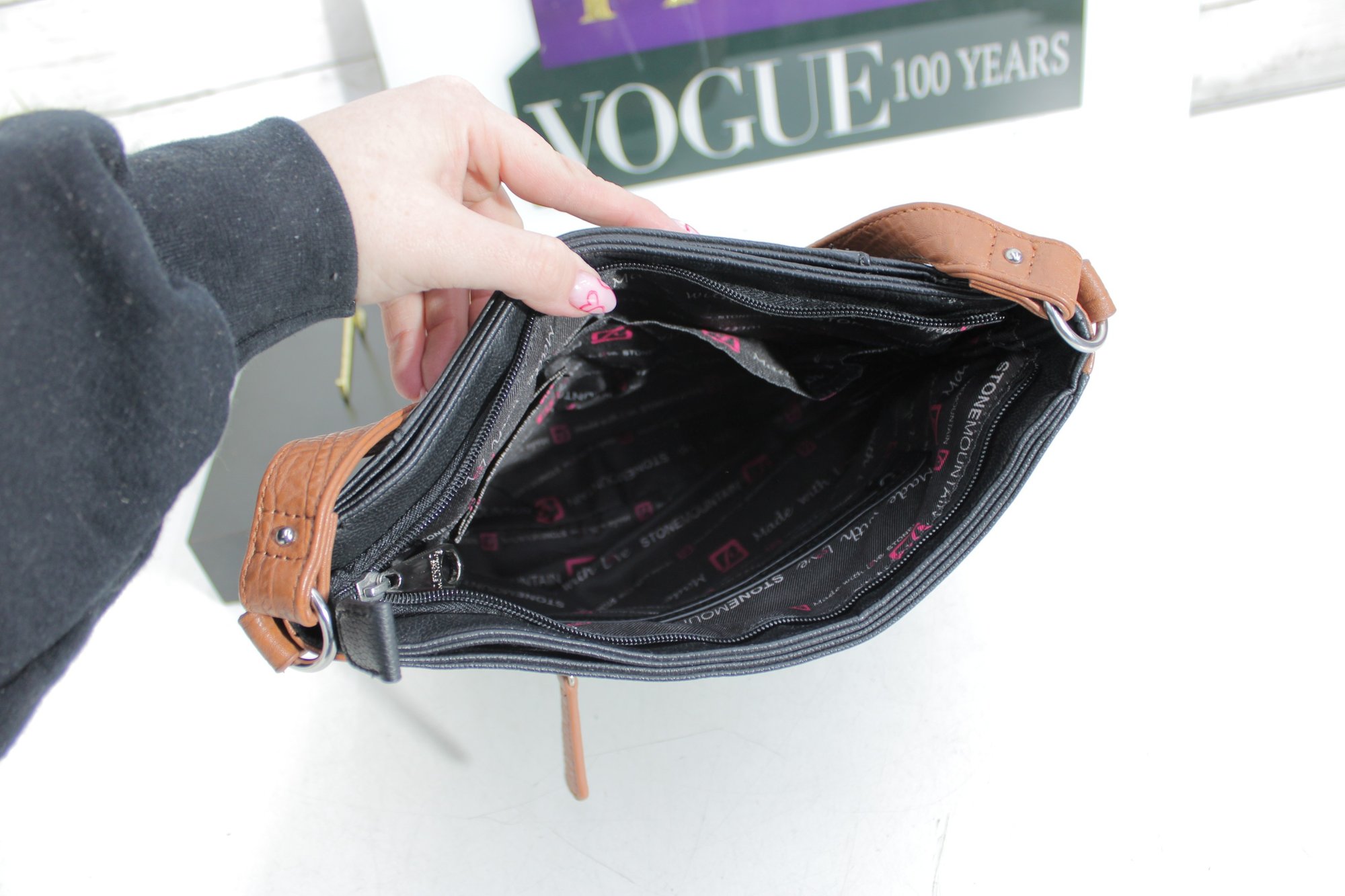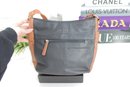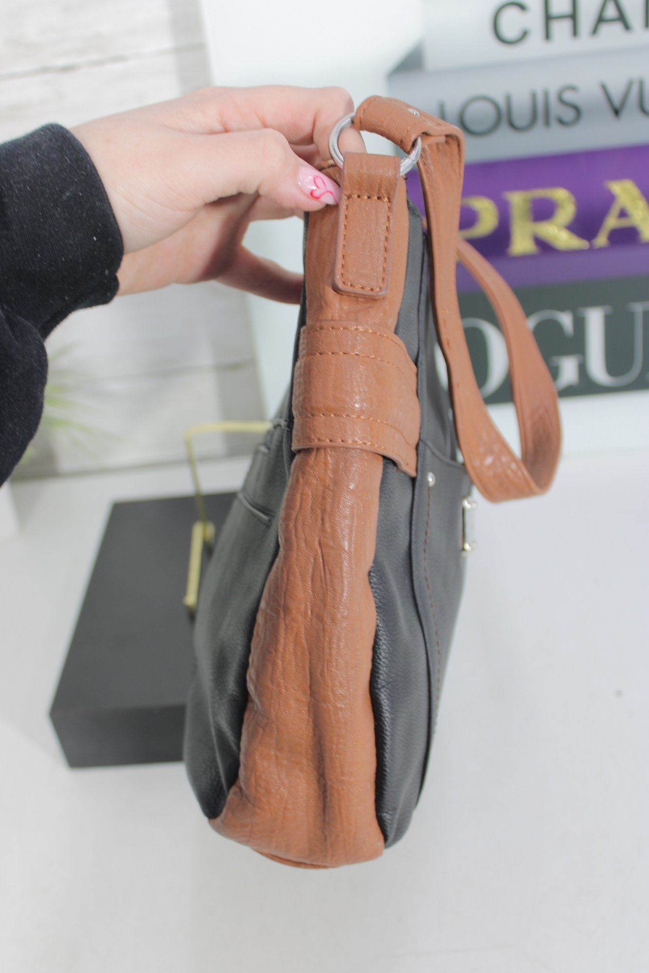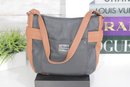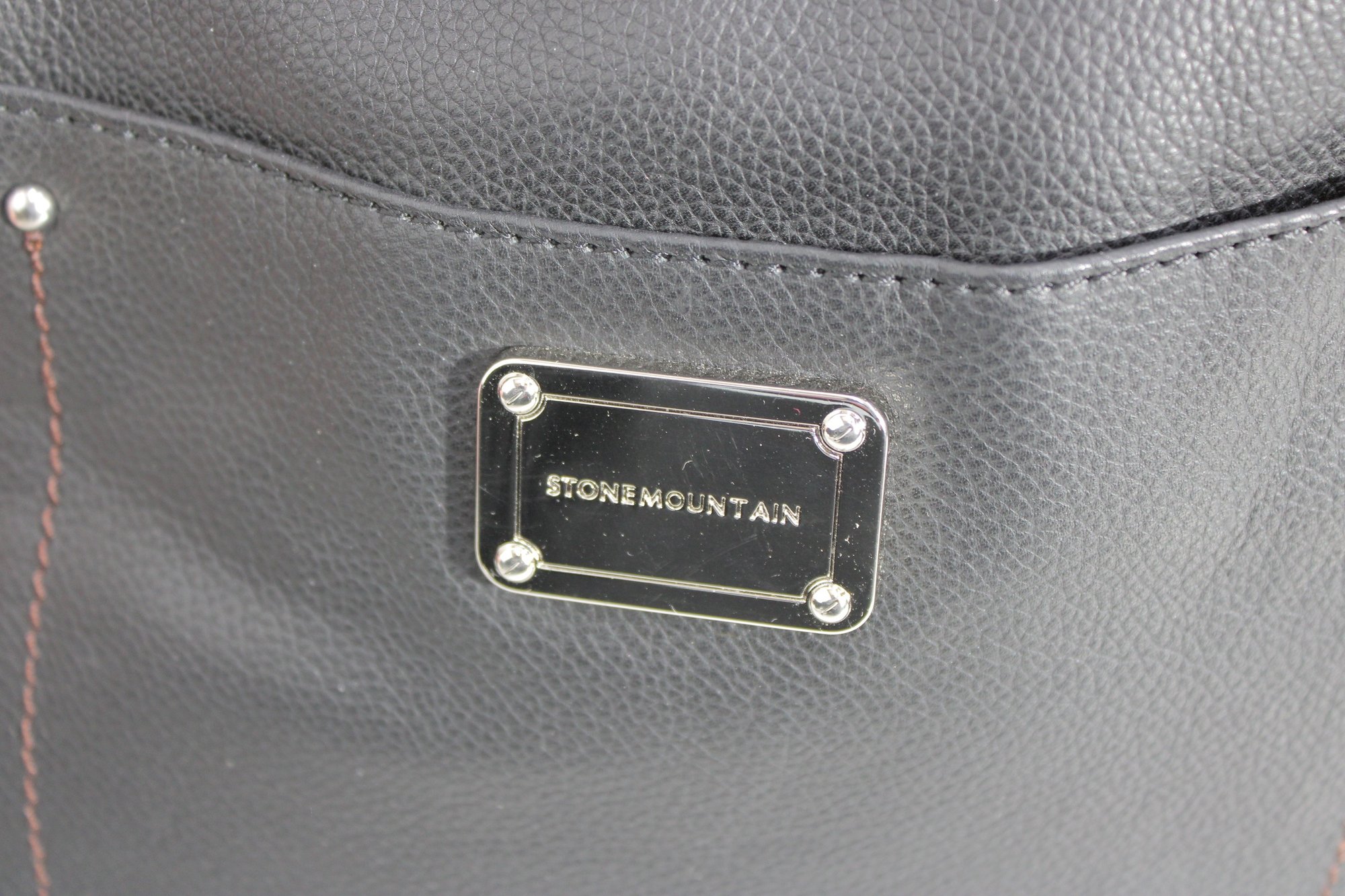 Classic and functional Stone Mountain shoulder bag featuring a stylish two-tone design in gray pebbled leather with tan leather accents. Known for quality craftsmanship and everyday practicality, this handbag offers a spacious interior and multiple pockets for organized storage.