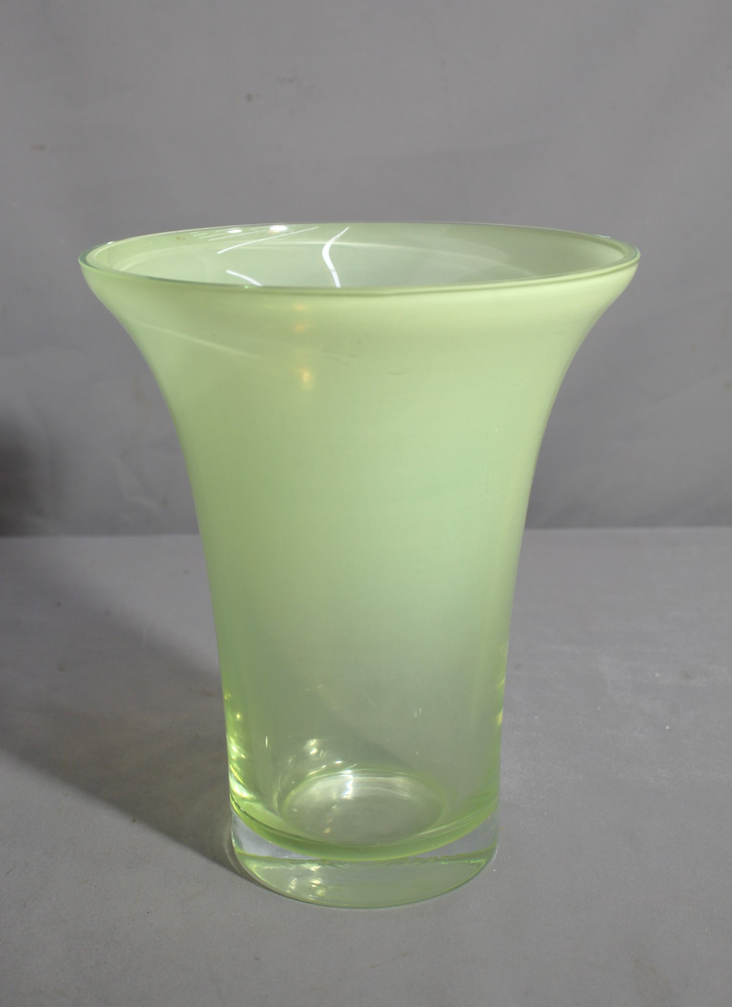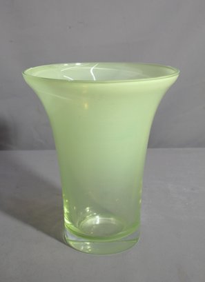 your interior with this striking Streamlined Green Art Glass Vase, standing 9 inches high with a 7.5-inch diameter. Its enchanting green hue, combined with the gentle flare at the top, creates a captivating visual appeal that's both modern and timeless. The soft translucence of the glass allows light to filter through, highlighting the subtle variances in its color and creating an alluring glow. Ideal for displaying fresh flowers or as a standalone statement piece