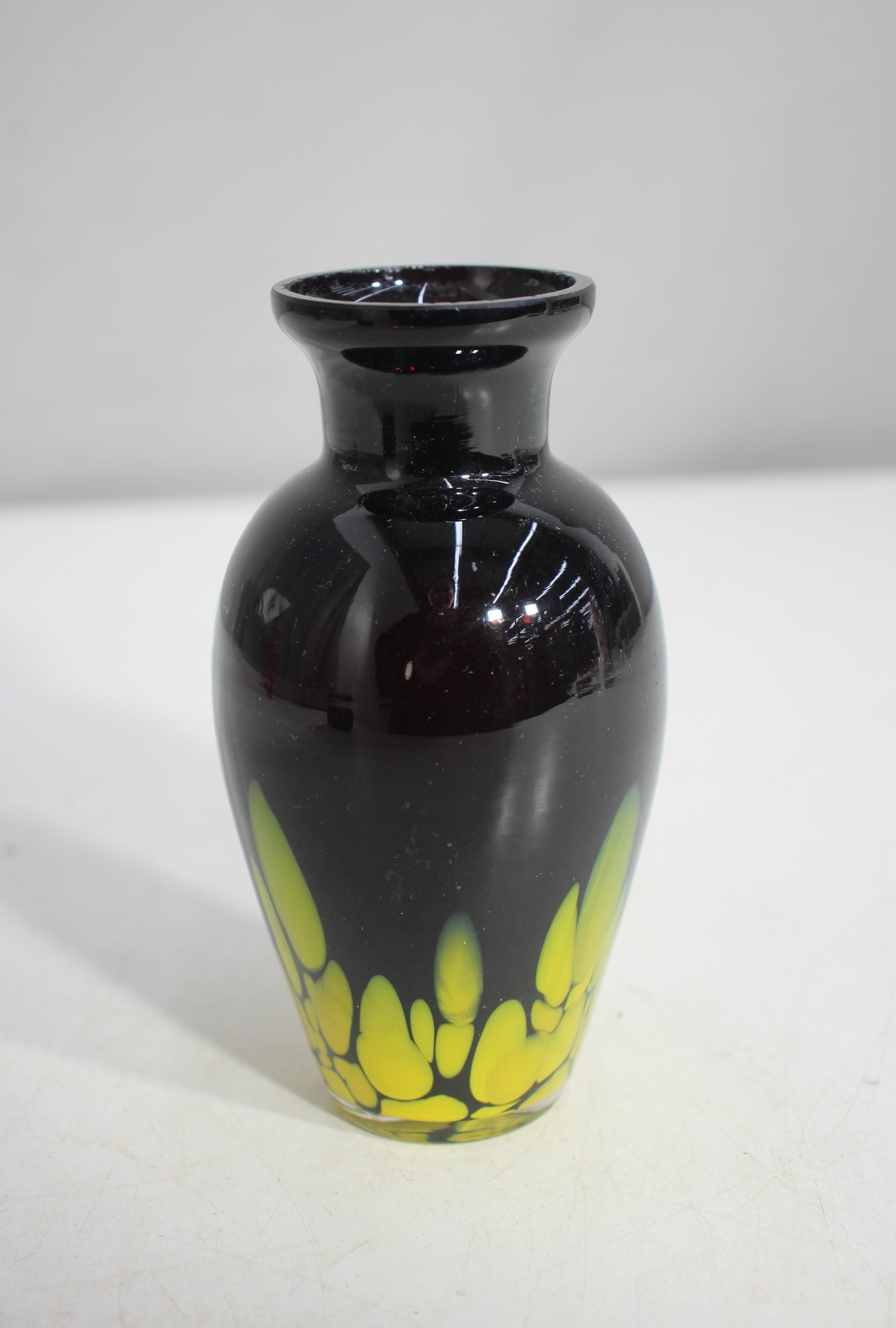 stunning 5.5-inch hand-blown art glass vase features a striking black body with vibrant yellow abstract accents resembling floral or flame-like patterns. The unique color infusion and smooth glossy finish make this a one-of-a-kind decorative piece.