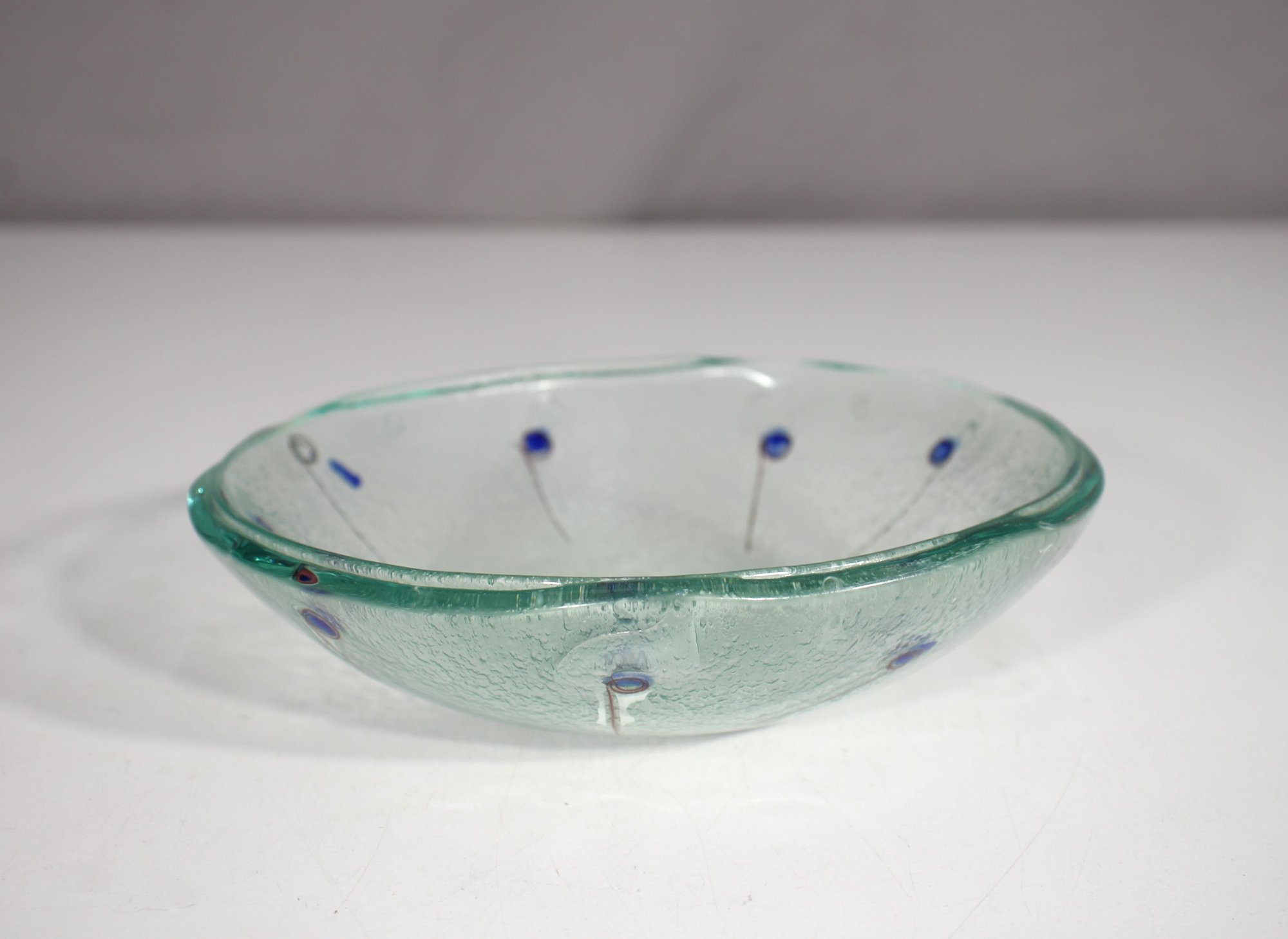 This unique hand-crafted art glass bowl is a striking example of contemporary studio glass design. Measuring 6 inches in diameter and 1.5 inches high, the shallow bowl features a lightly textured surface with embedded cobalt blue dots and fine copper wire inlays that radiate from the center, creating a captivating abstract pattern.