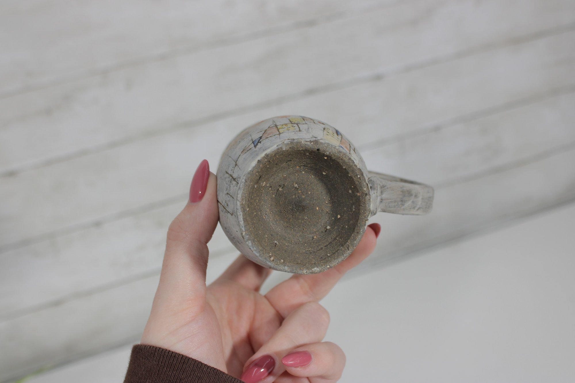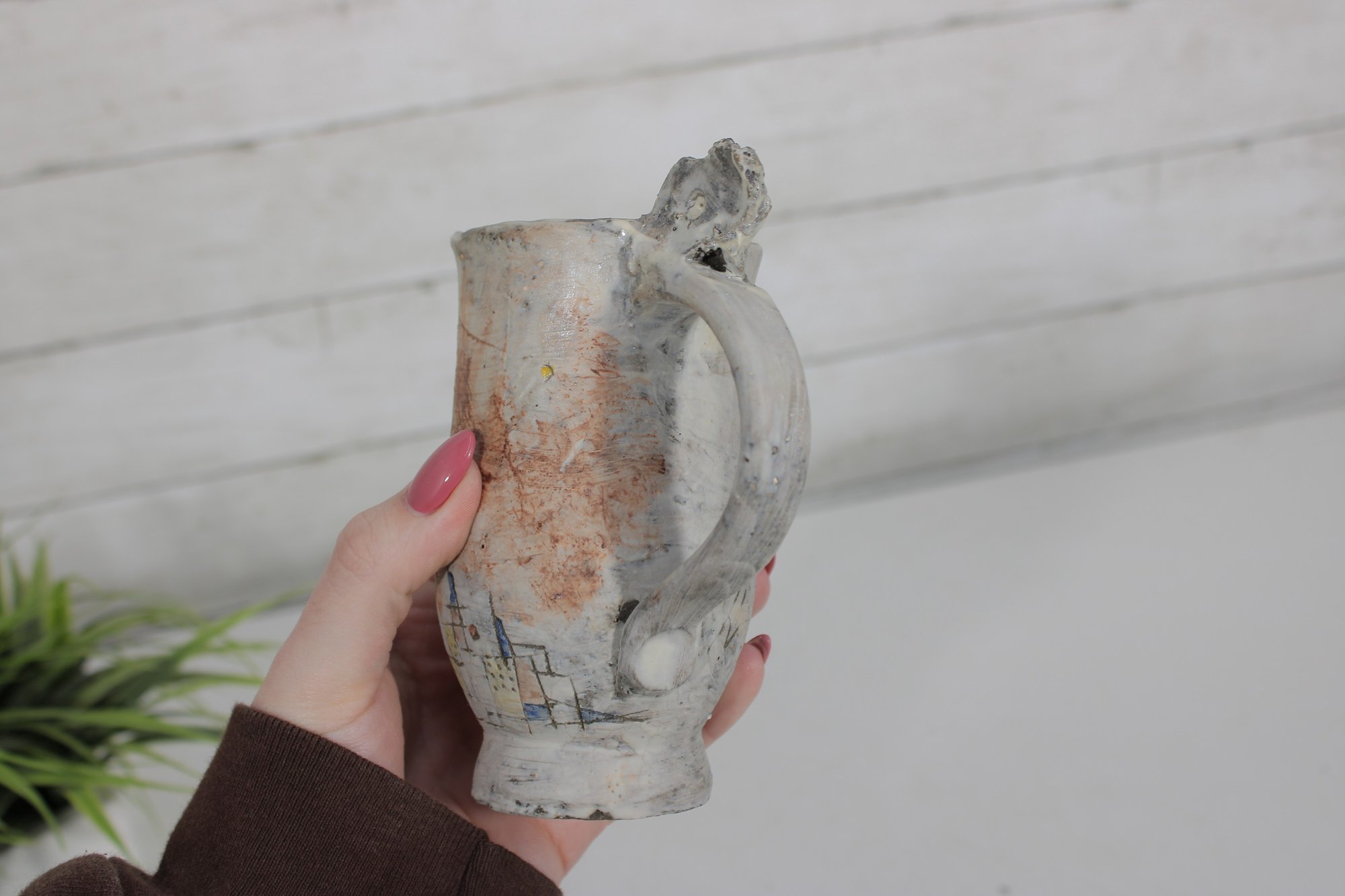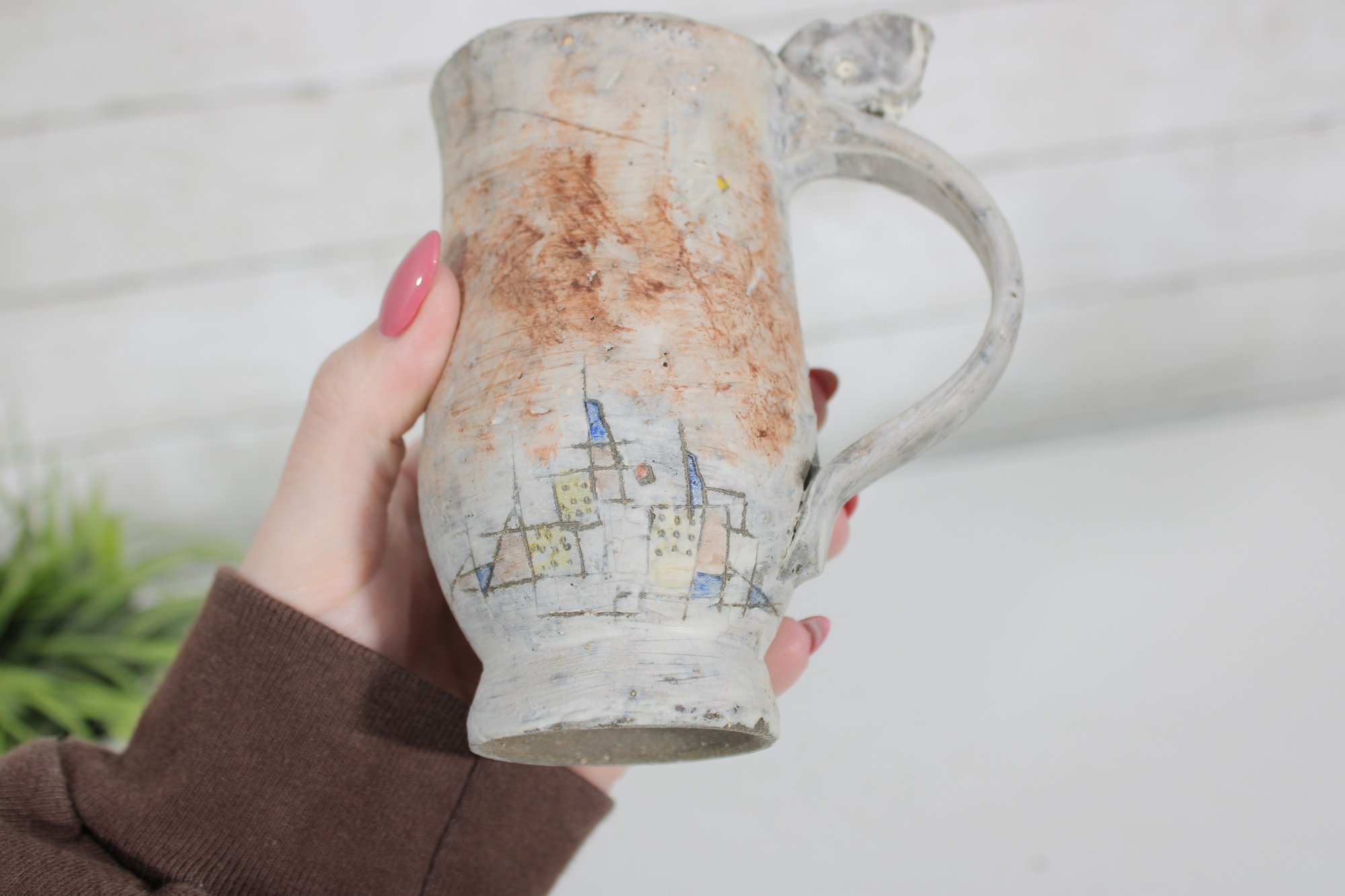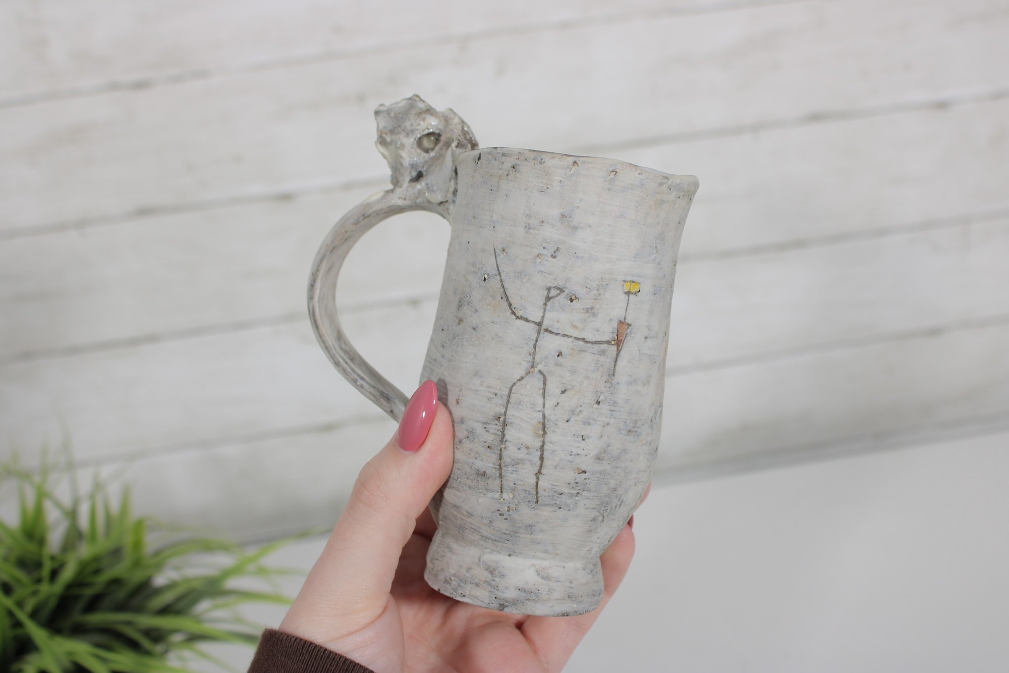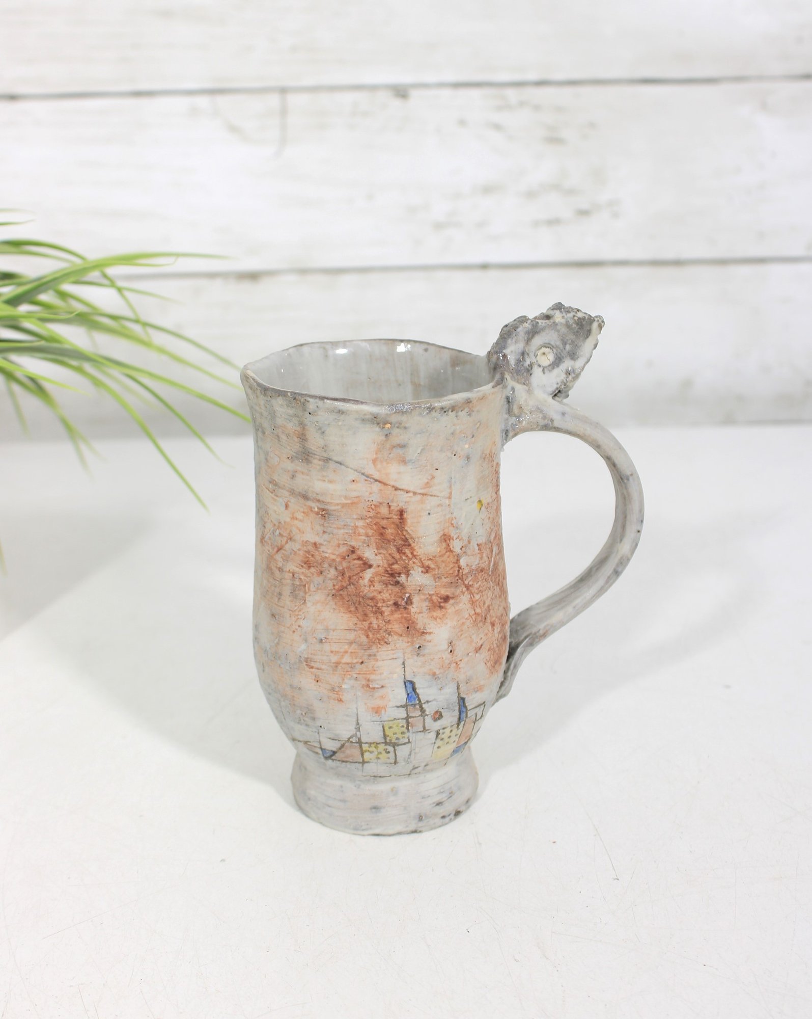A standout feature of this piece is the sculptural figural element incorporated into the handle, giving the mug an artistic and whimsical appearance. The surface decoration includes abstract and architectural-style line work, adding to the handmade studio pottery aesthetic.