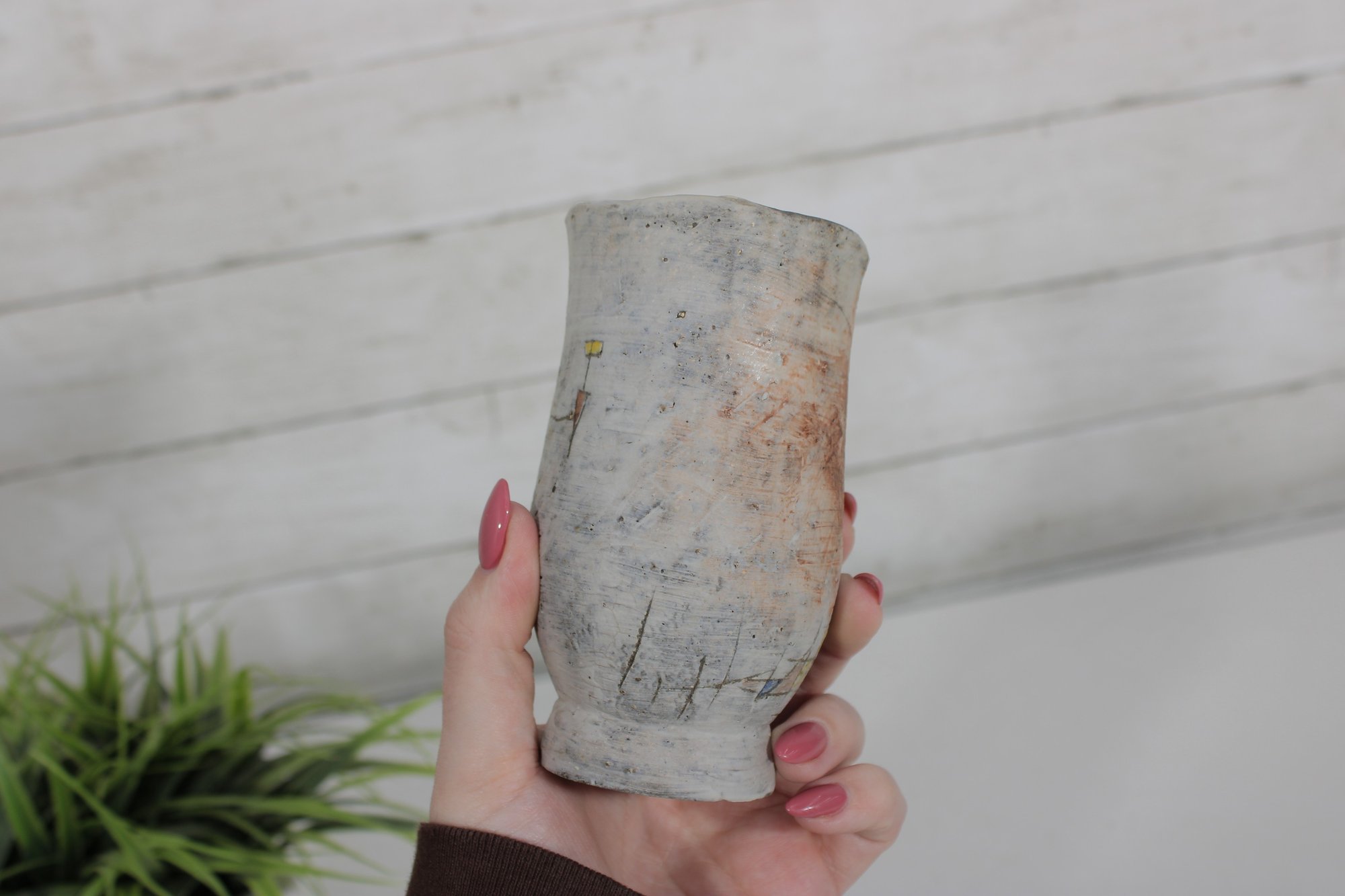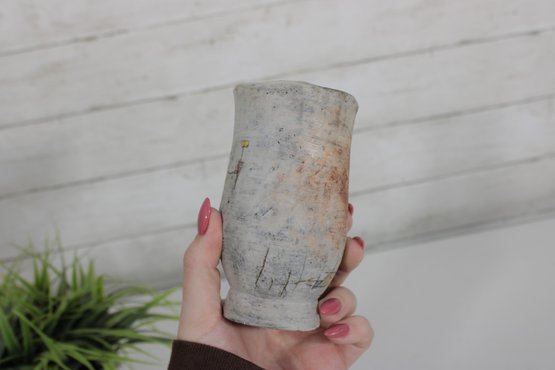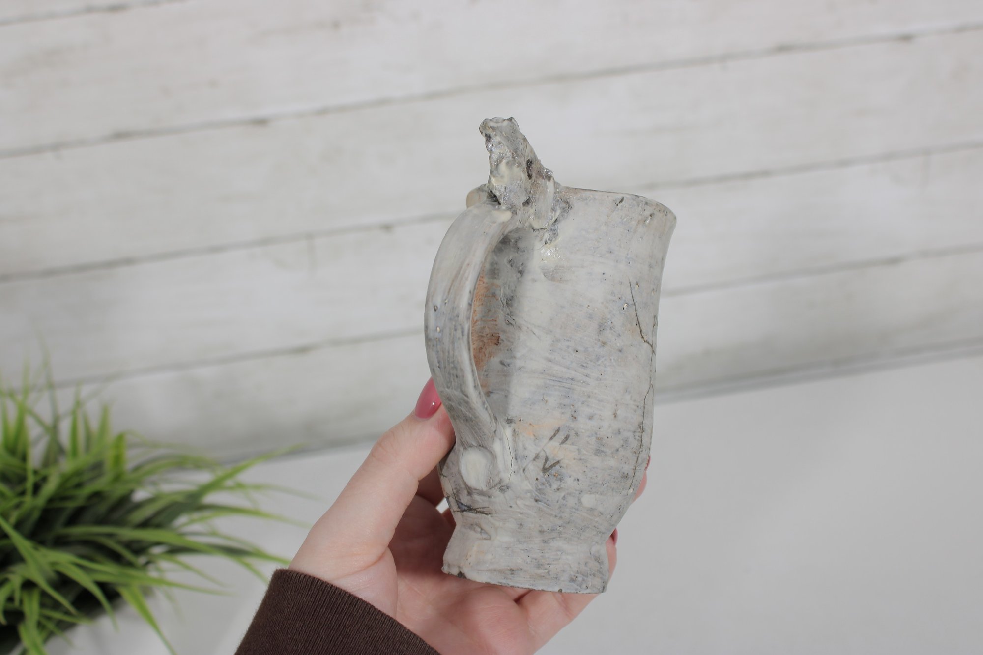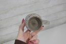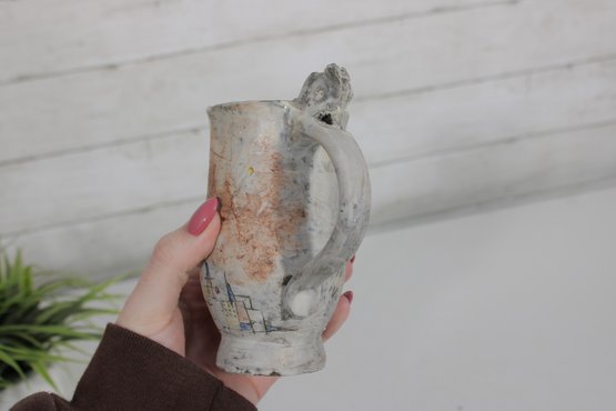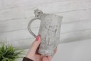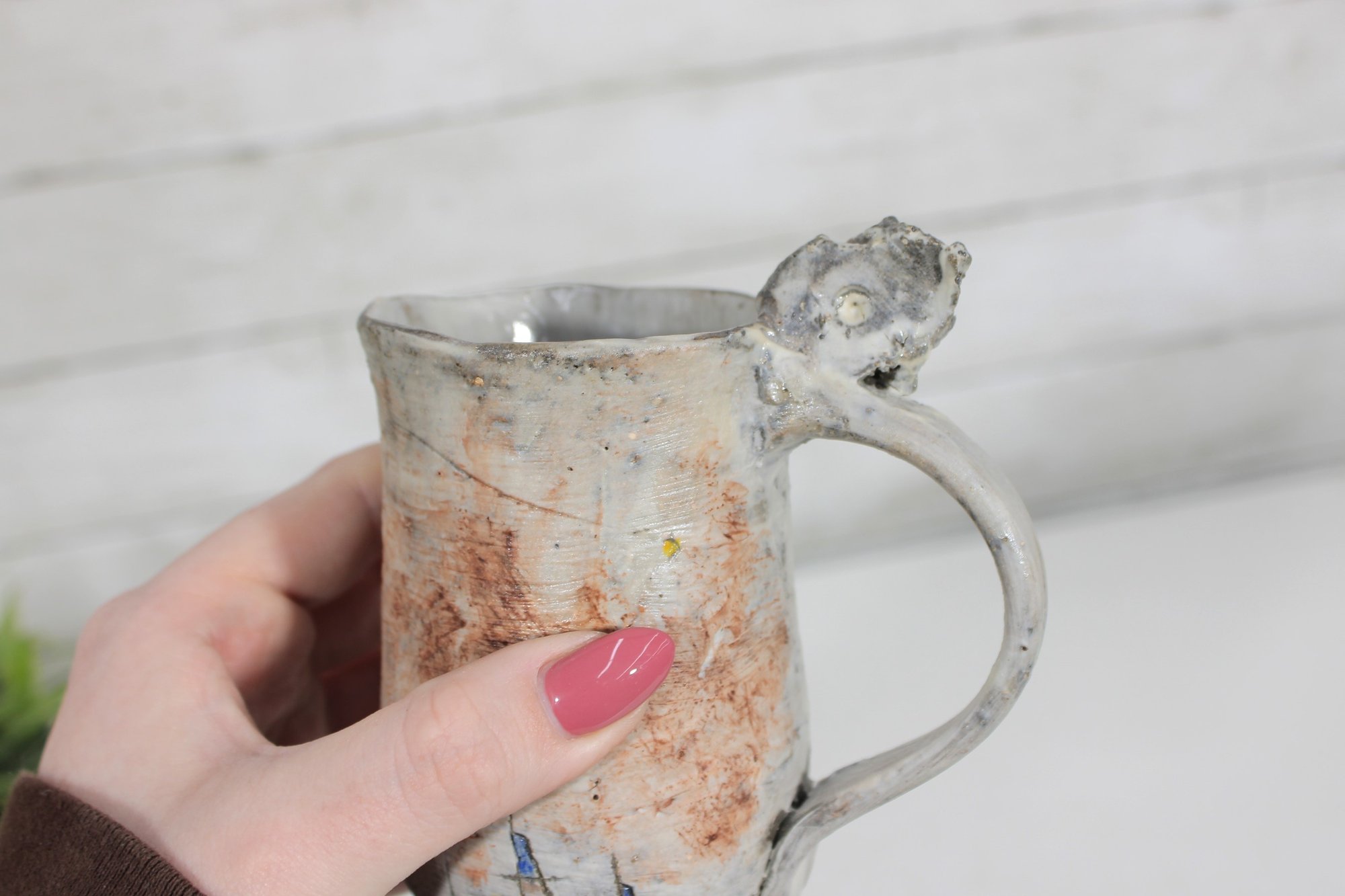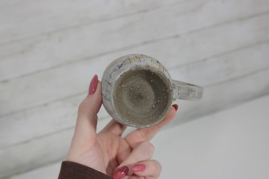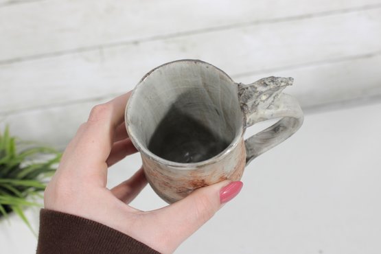a unique studio art pottery mug featuring a distinctive handcrafted design and figural handle detail. The mug has a tall, slightly tapered form with an earthy textured glaze in soft neutral tones accented with rustic brown and subtle painted line details.
