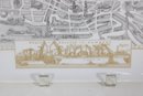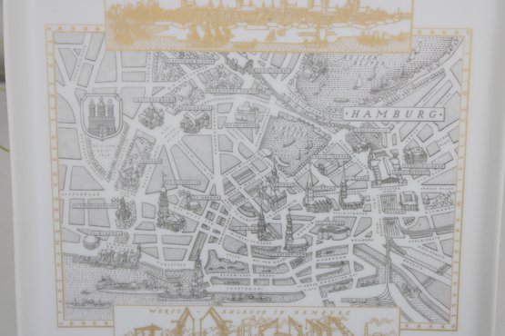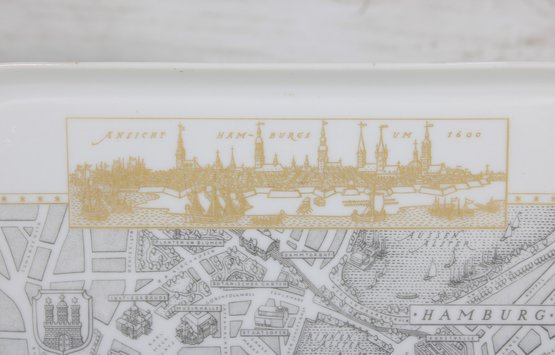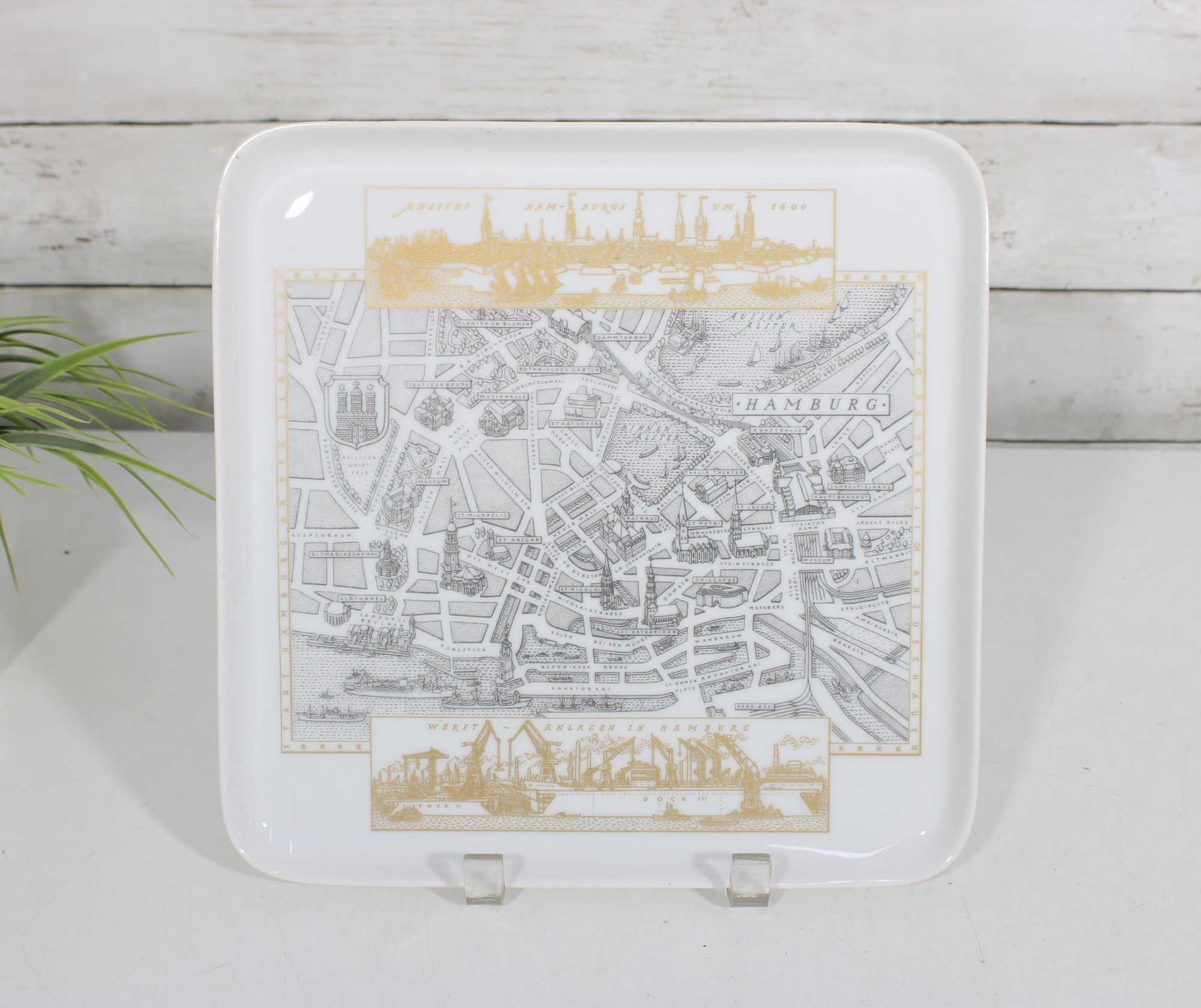 a decorative Studio Hamburg porcelain plate featuring a detailed map of Hamburg, Germany, accented with elegant gold skyline illustrations. This square plate blends historical cartography with refined design, showcasing a finely rendered city layout in gray tones framed by gold architectural motifs.