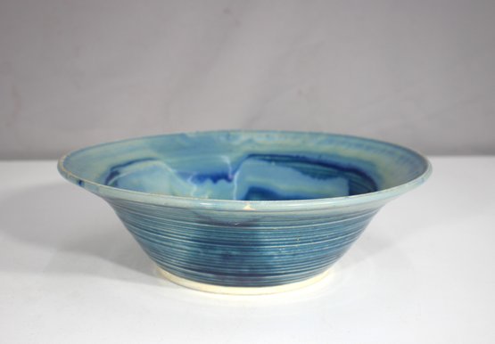 Bring the calming beauty of the sea into your home with this striking hand-thrown ceramic bowl, signed by the artist. Measuring approximately 10.5 inches in diameter and 3.5 inches high, this piece is a beautiful blend of craftsmanship and fluid artistry.