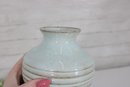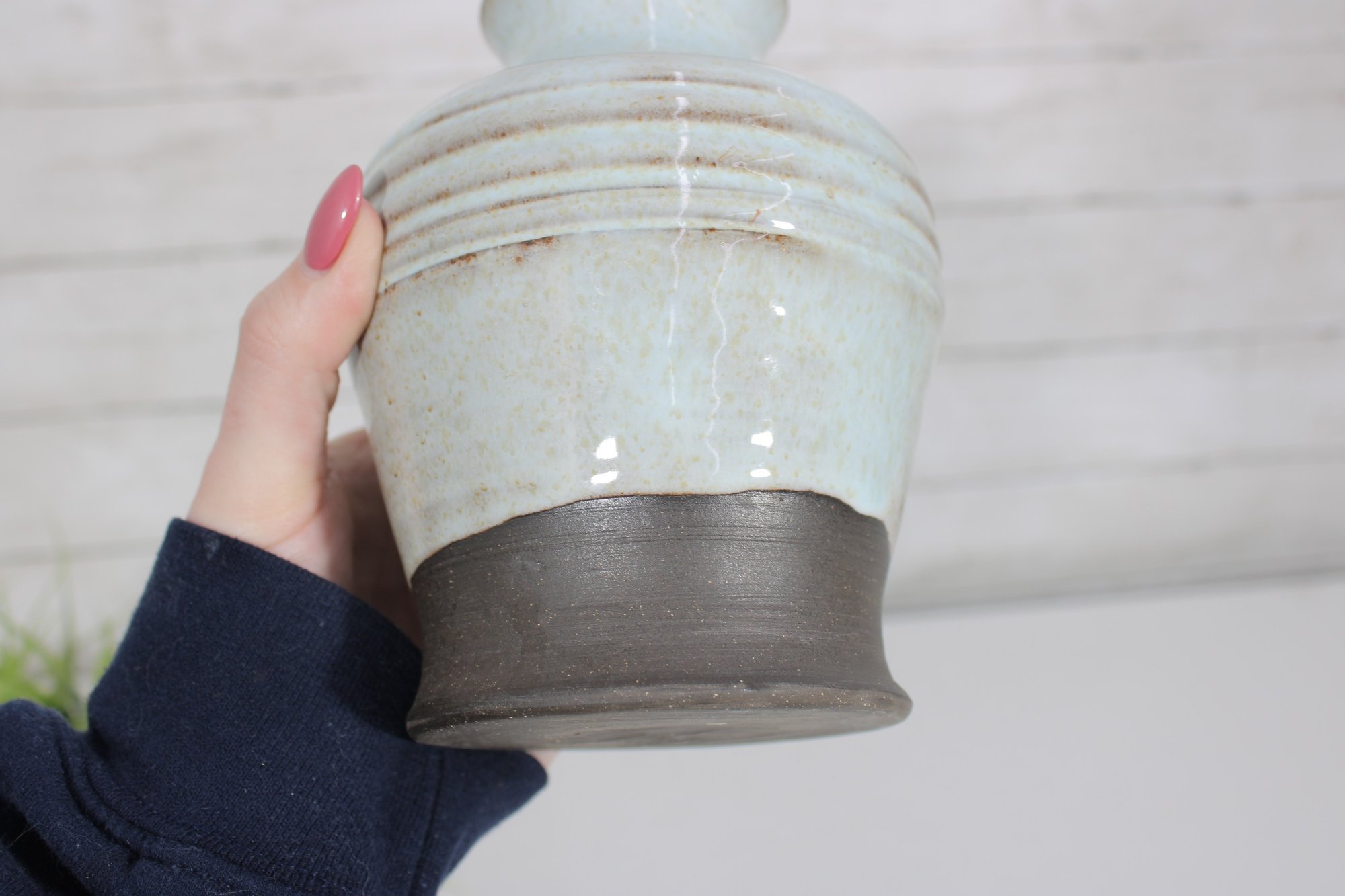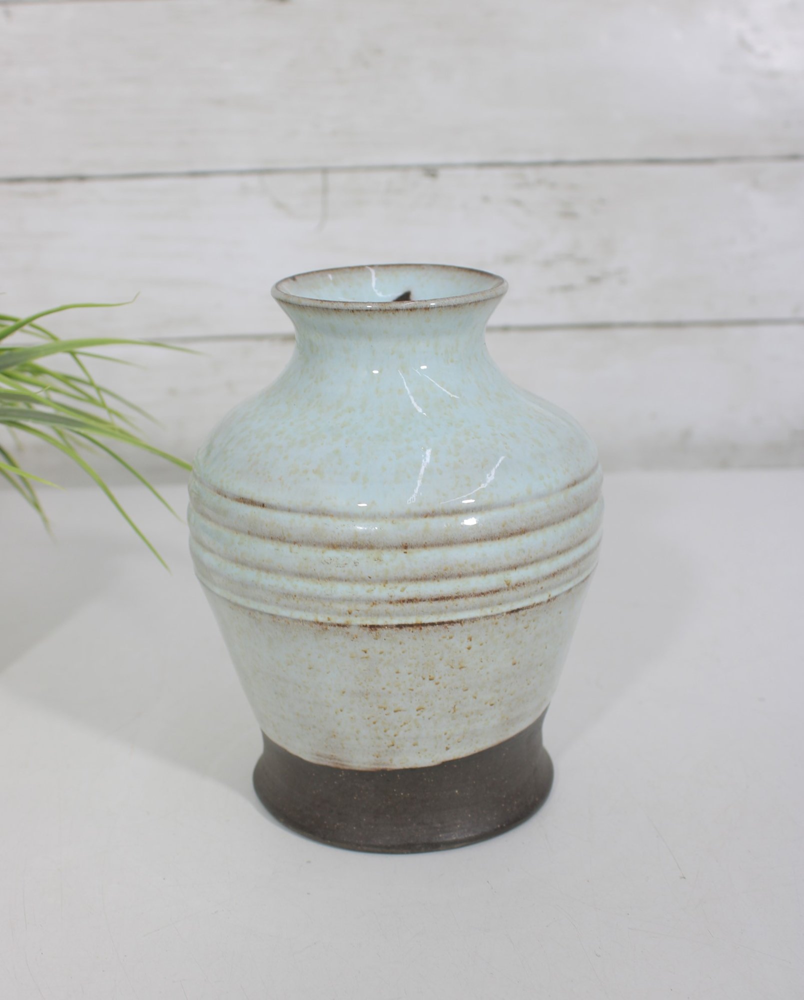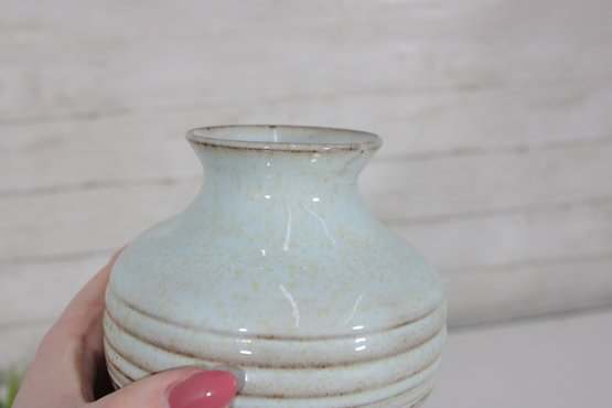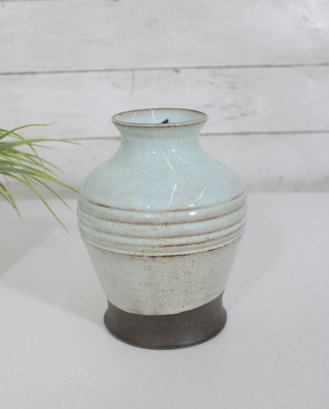 Beautiful studio pottery vase featuring a soft blue glazed upper body with subtle speckling and a contrasting unglazed dark base. The midsection is accented with horizontal ribbed bands, adding texture and visual interest to the piece.