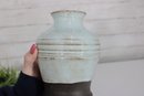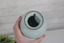This handcrafted vase has a pleasing rounded form with a gently flared neck, making it ideal for displaying flowers or as a standalone decorative accent. The combination of glaze and natural clay gives it a modern rustic, artisan feel.