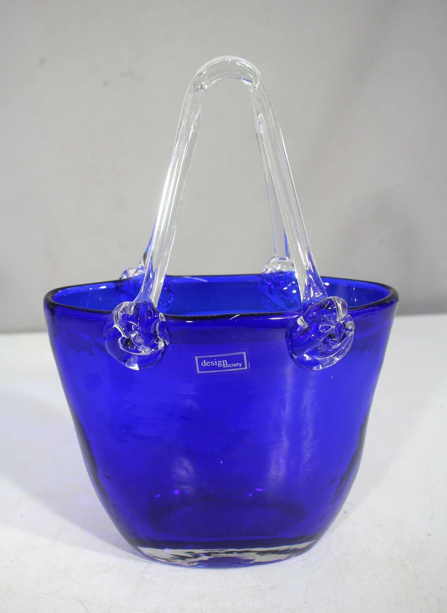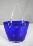 This beautiful hand-blown art glass vase is uniquely designed in the shape of a handbag, featuring a rich cobalt blue body with elegant clear glass handles. The sculpted handles are attached with decorative clear glass rosettes, adding an artistic touch to this exceptional piece.
