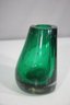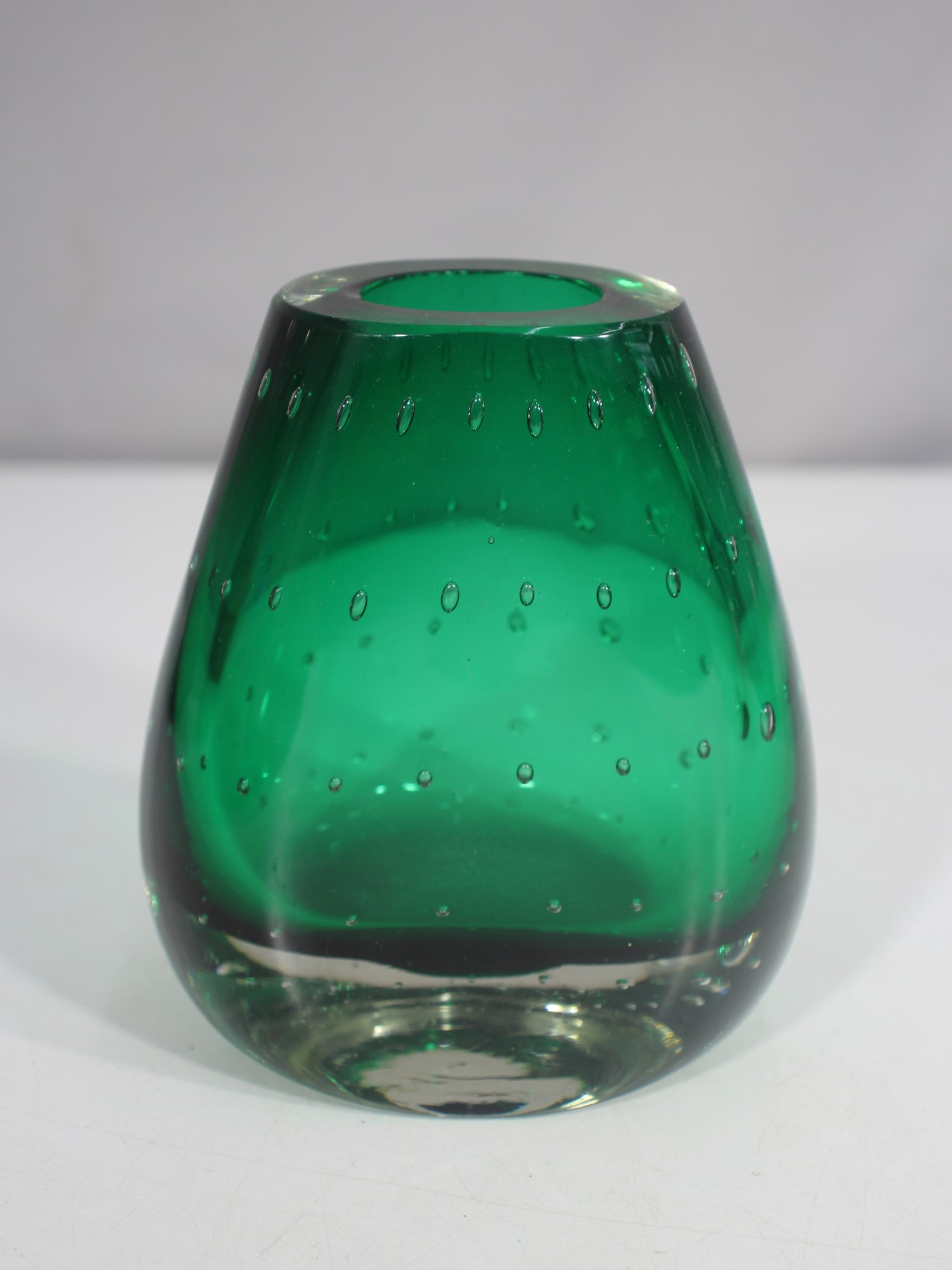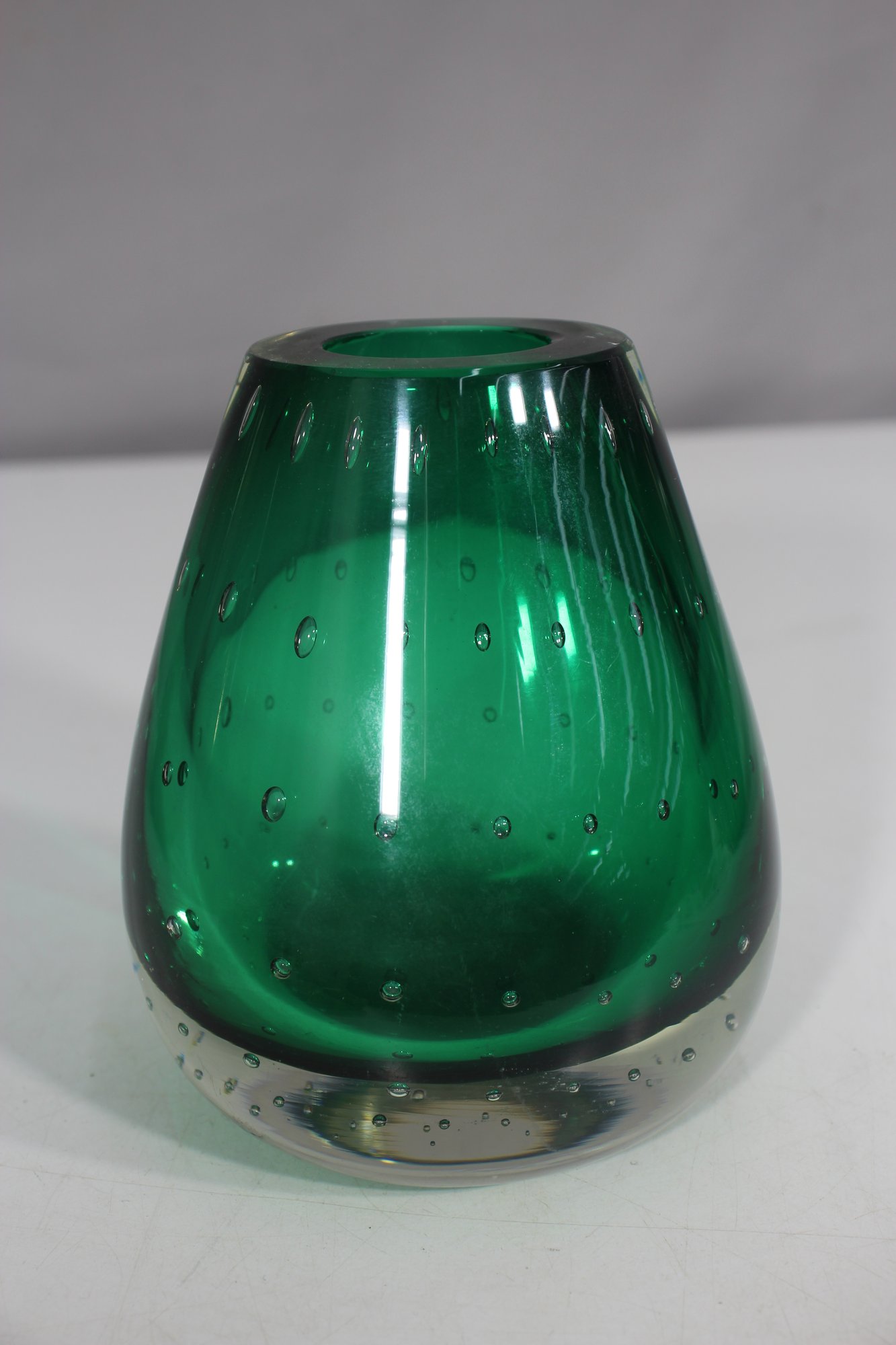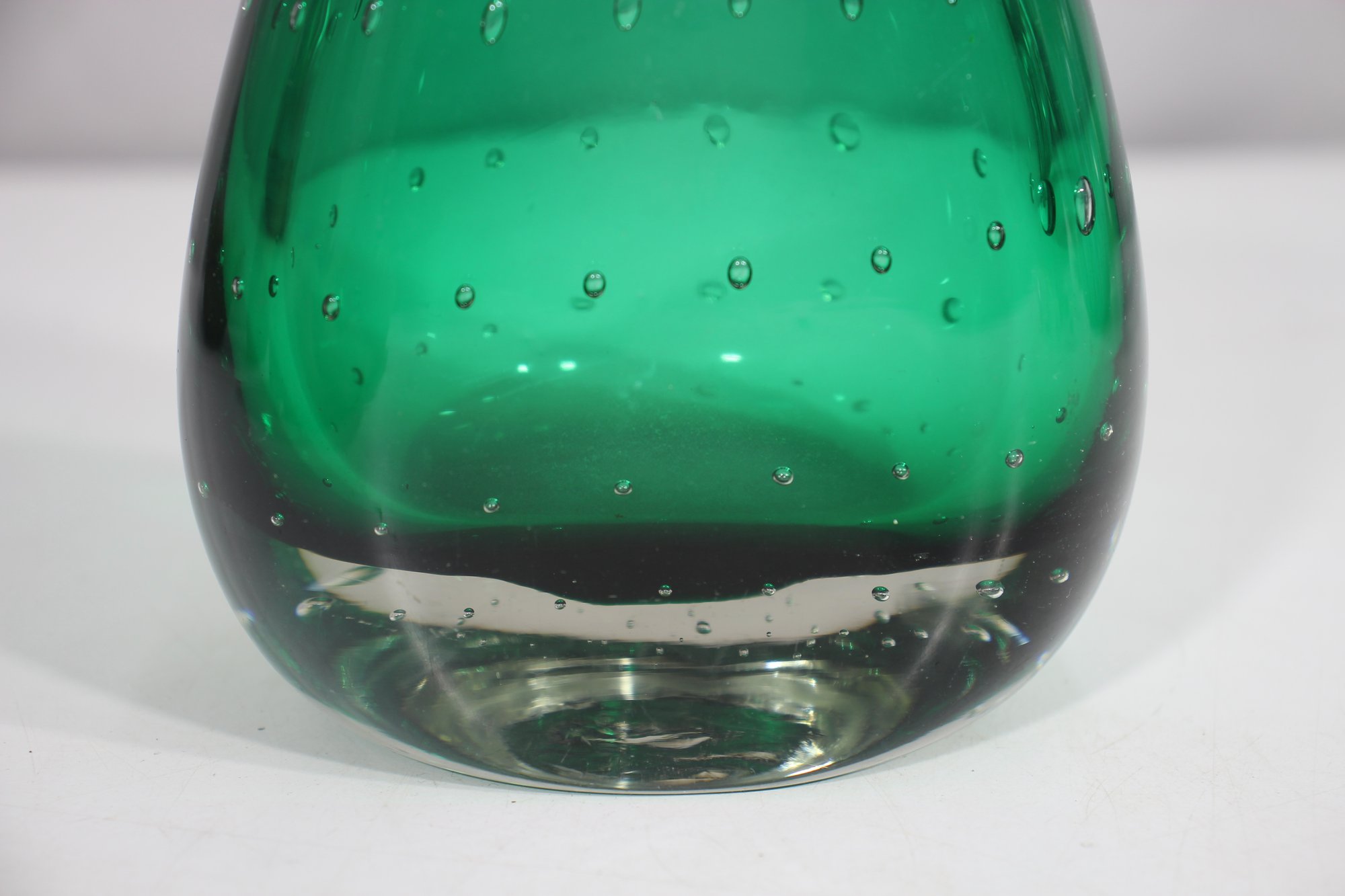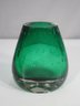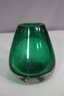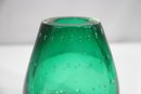 hand-blown art glass vase features a rich emerald green hue with a mesmerizing controlled bubble pattern throughout. The weighted clear glass base adds stability and highlights the craftsmanship of this unique piece.