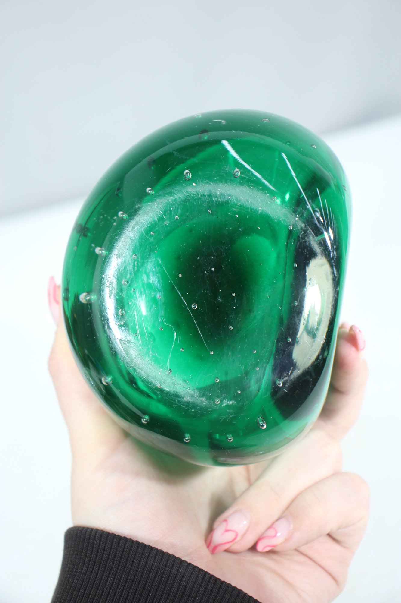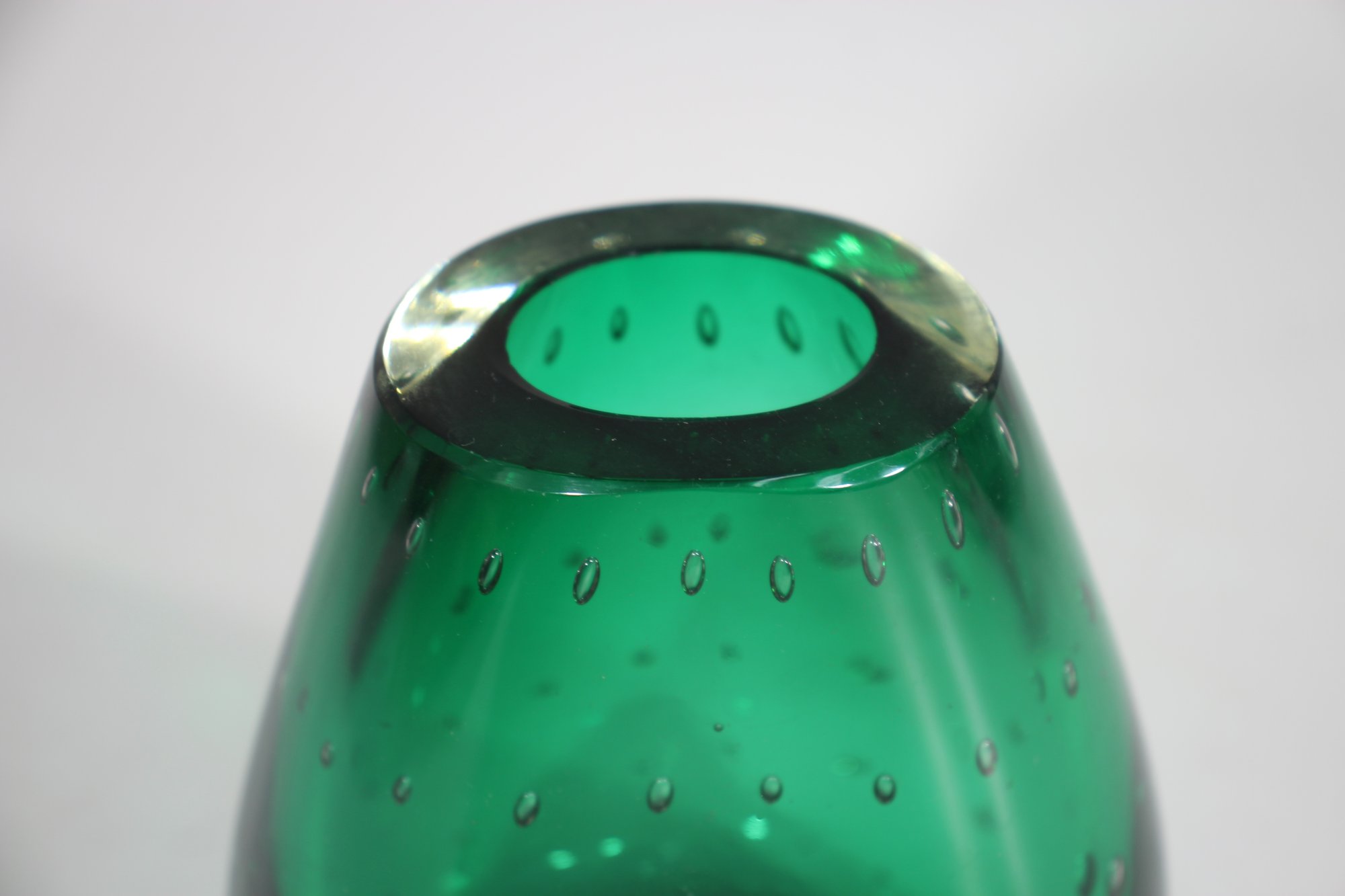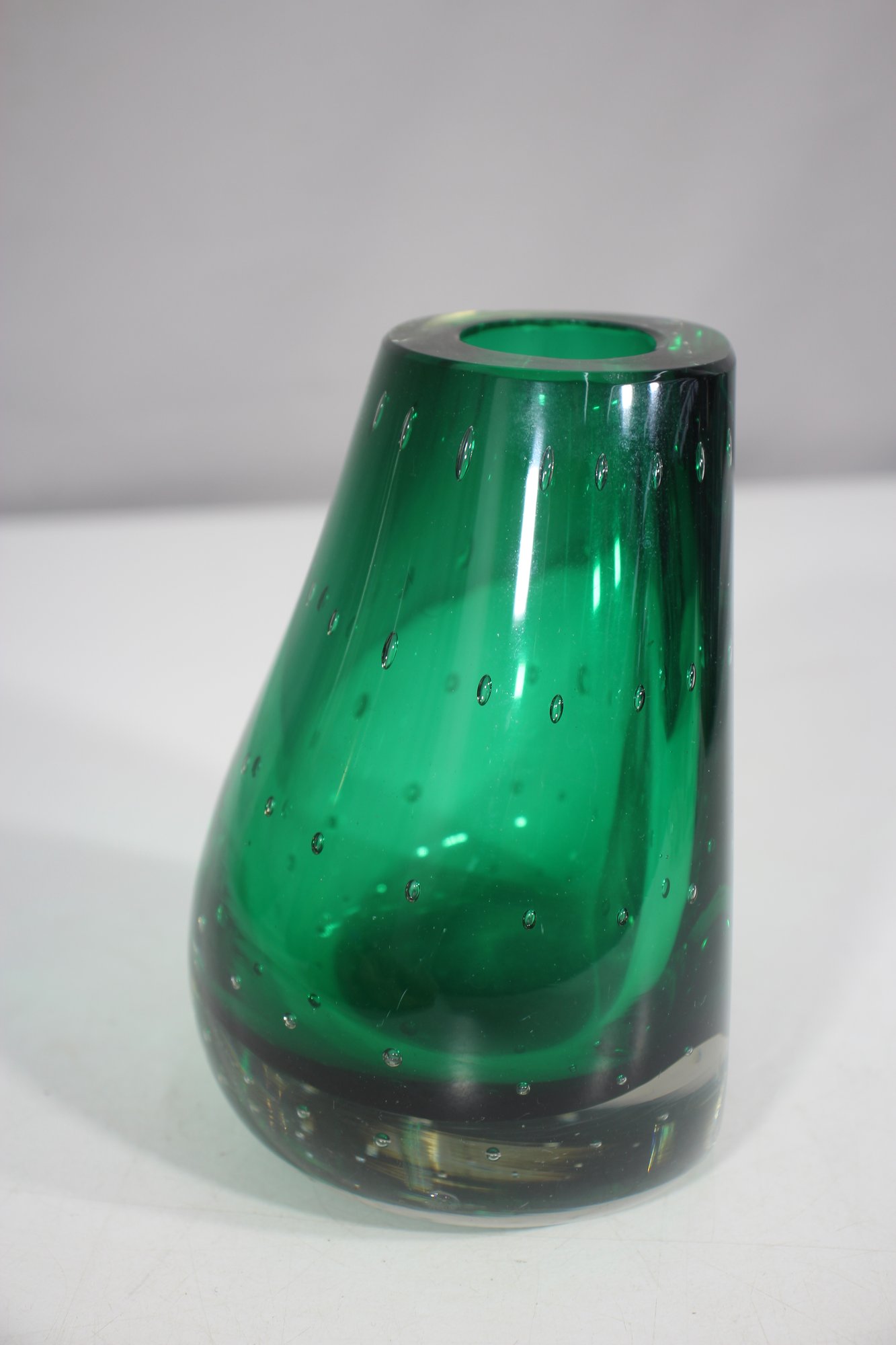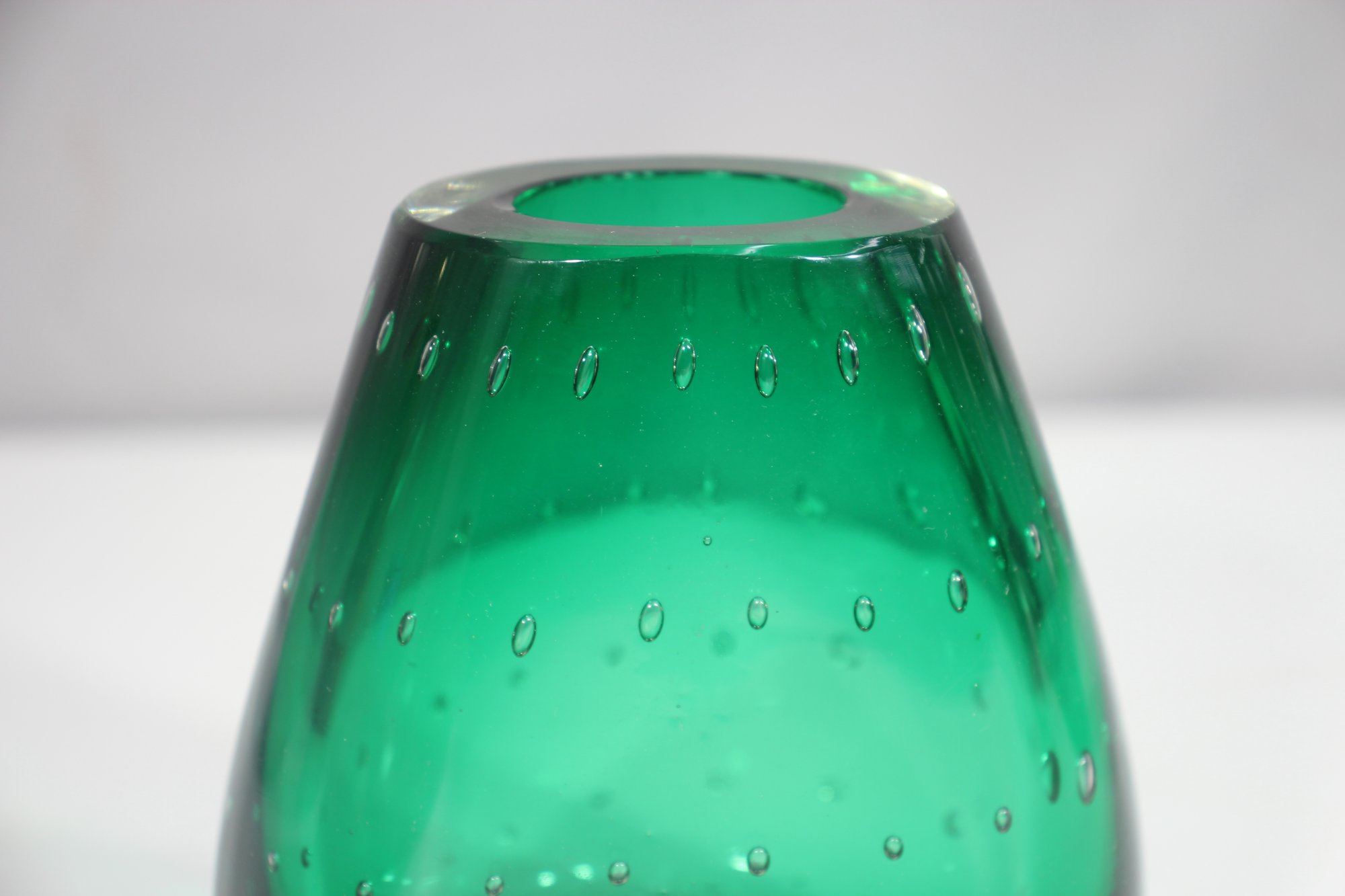 hand-blown art glass vase features a rich emerald green hue with a mesmerizing controlled bubble pattern throughout. The weighted clear glass base adds stability and highlights the craftsmanship of this unique piece.