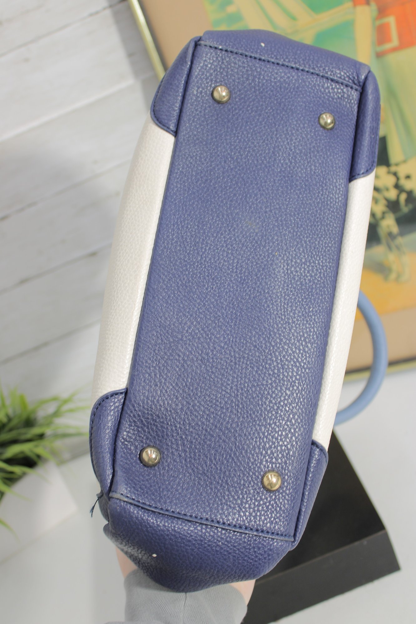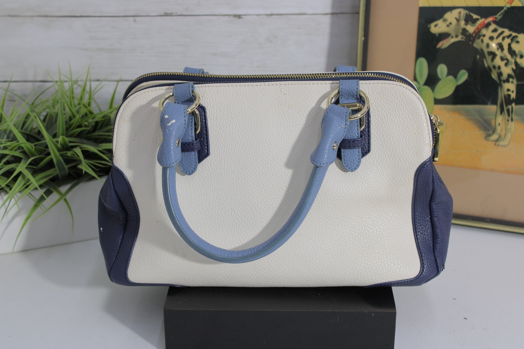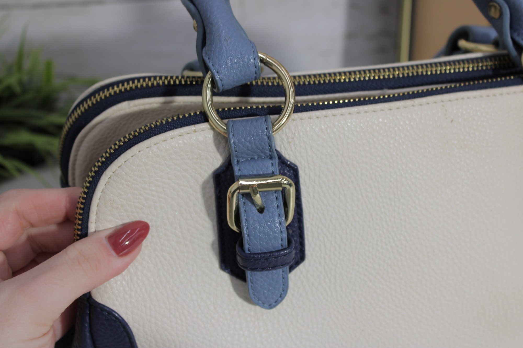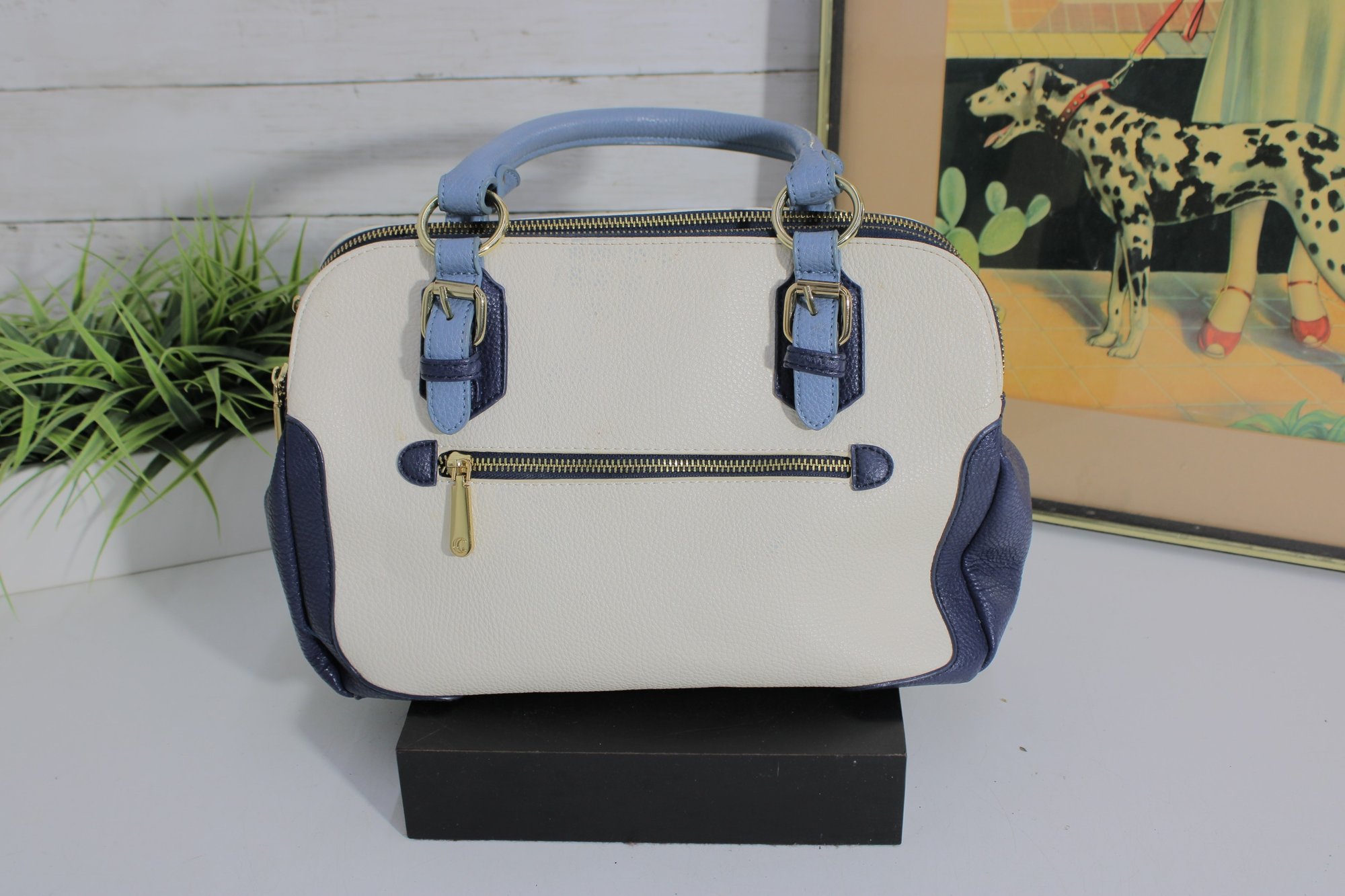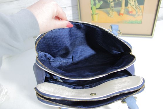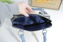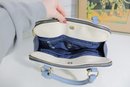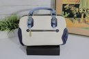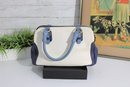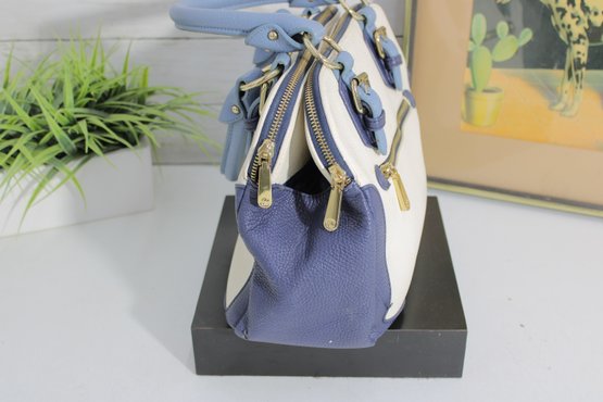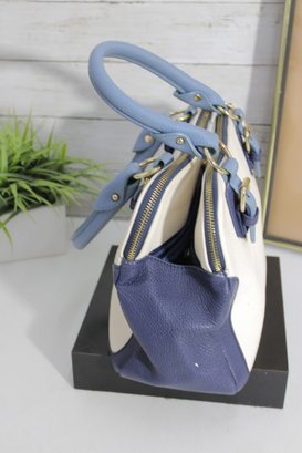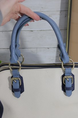 Add a touch of timeless style to your wardrobe with this elegant two-tone satchel handbag. Featuring a beautiful cream body accented with soft blue handles and side panels, this bag offers a clean, classic look with a modern edge.