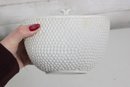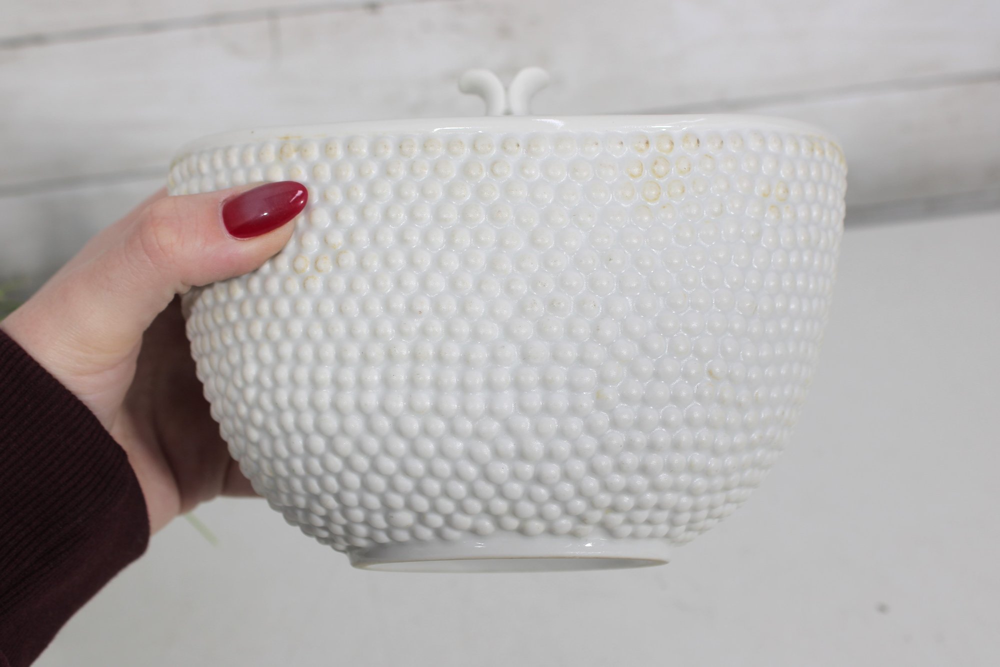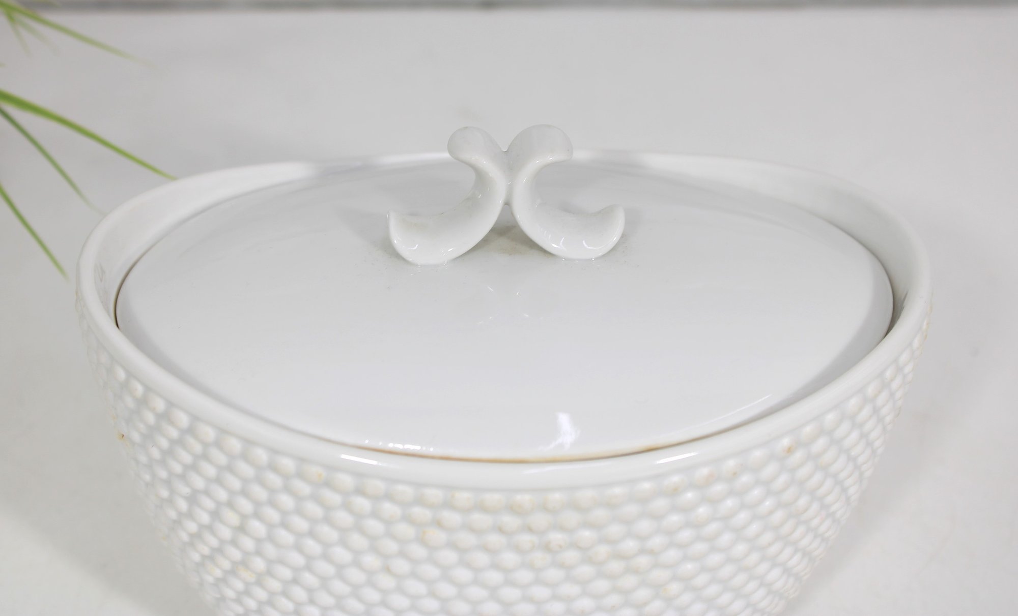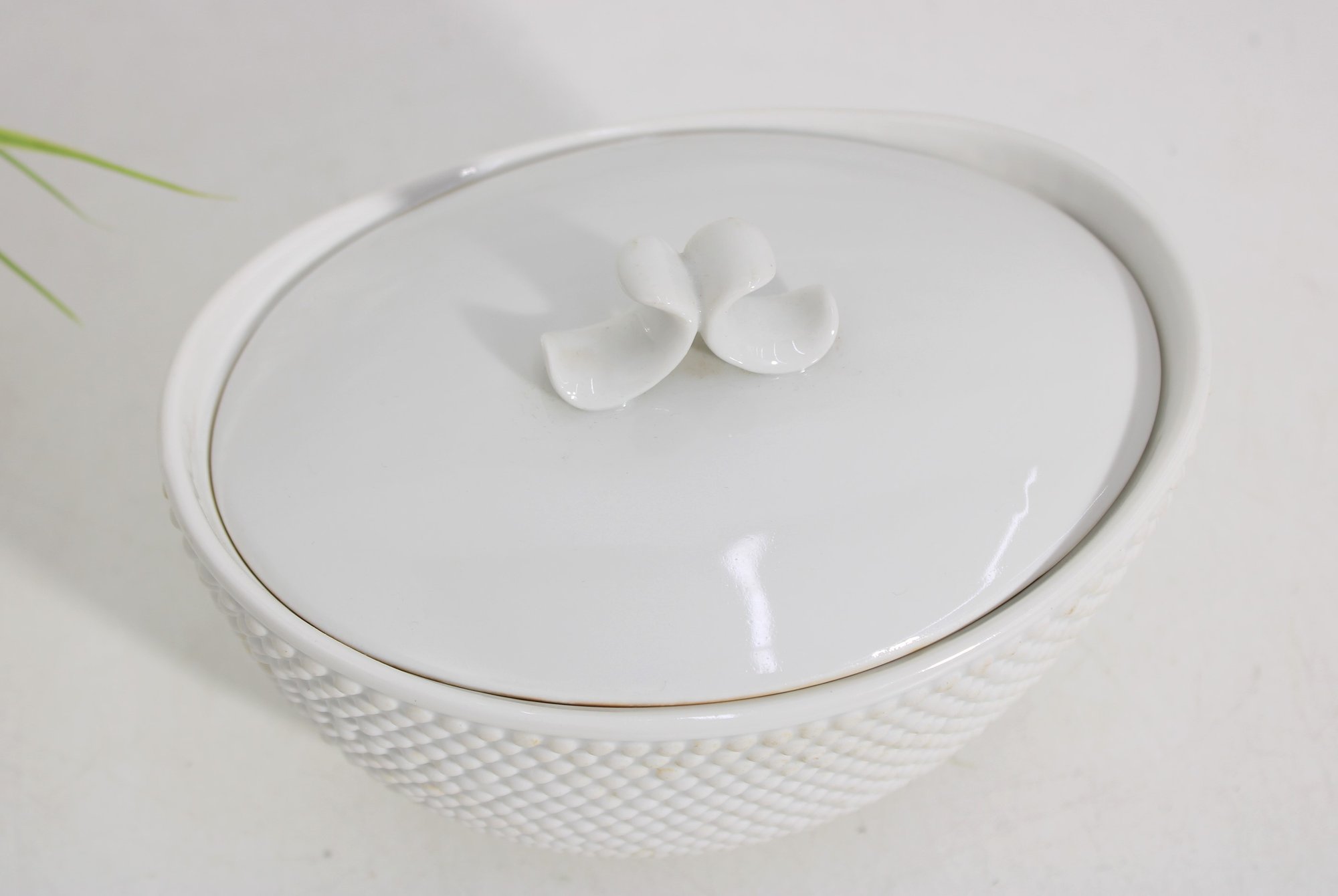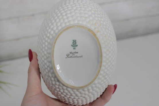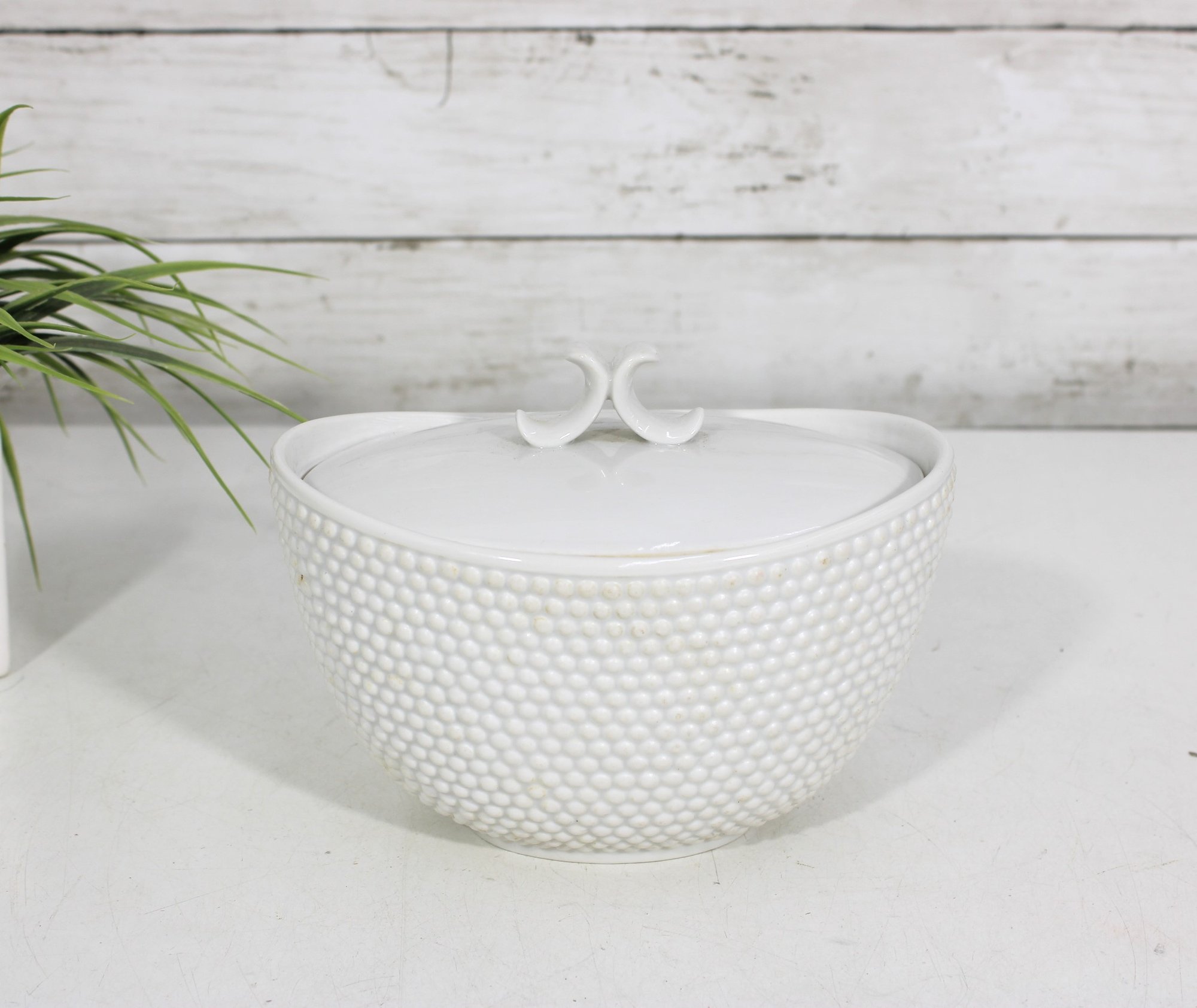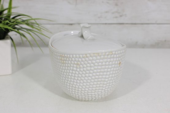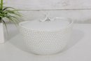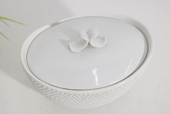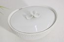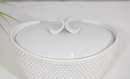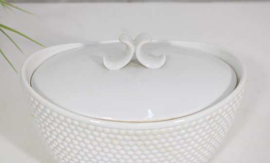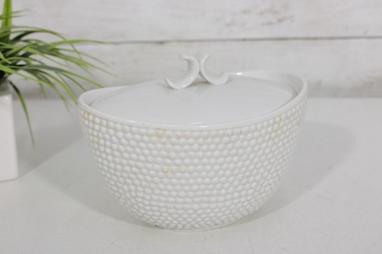 an elegant covered porcelain bowl by Suisse Langenthal, crafted in Switzerland and marked on the underside. This beautifully designed piece features a classic white glaze with a raised textured (hobnail-style) exterior and a smooth, minimalist lid topped with a sculptural double-scroll handle.