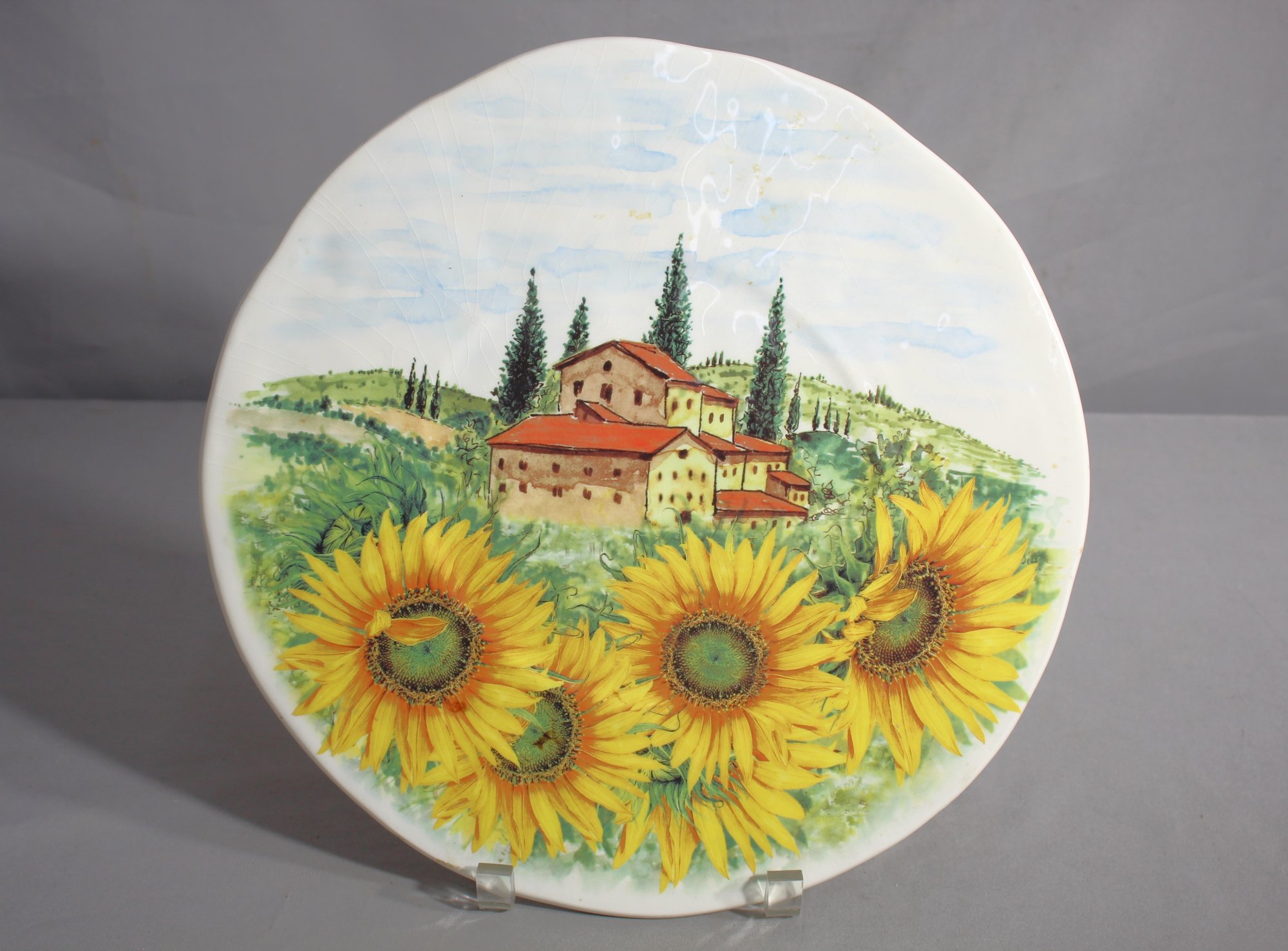 Bring the warmth and charm of the Tuscan countryside to your table with this picturesque Sur La Table serving platter. This beautifully crafted tray depicts a serene Tuscan landscape, complete with rolling hills, cypress trees, and a quaint terracotta-roofed house, all set against a soft sky blue background. The foreground boasts a vibrant array of sunflowers in full bloom, their sunny faces adding a splash of color and joy to any dining occasion.