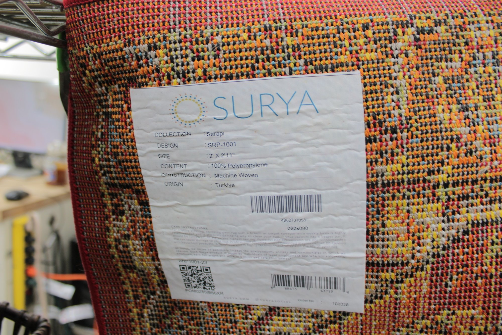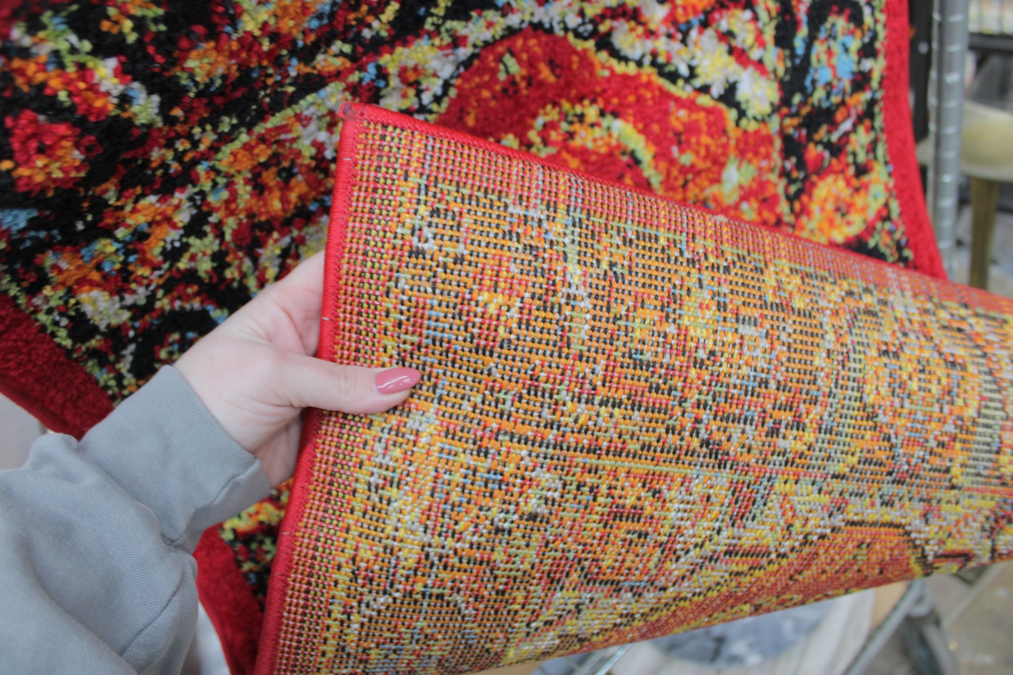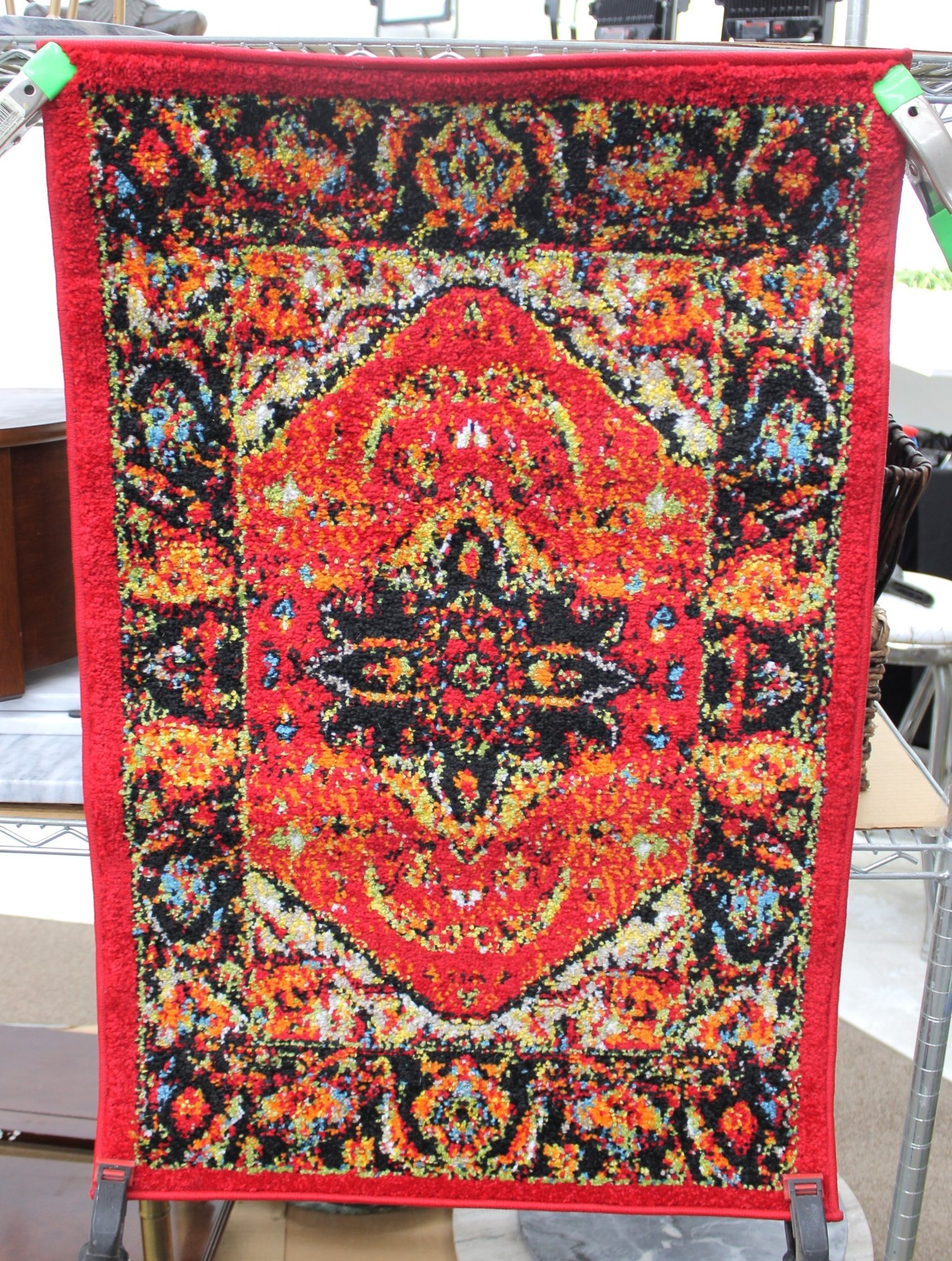 Add bold color and vintage-inspired character to your space with this Surya accent rug, featuring a striking medallion design in rich red, black, and multicolor tones.