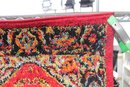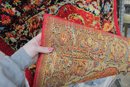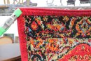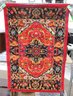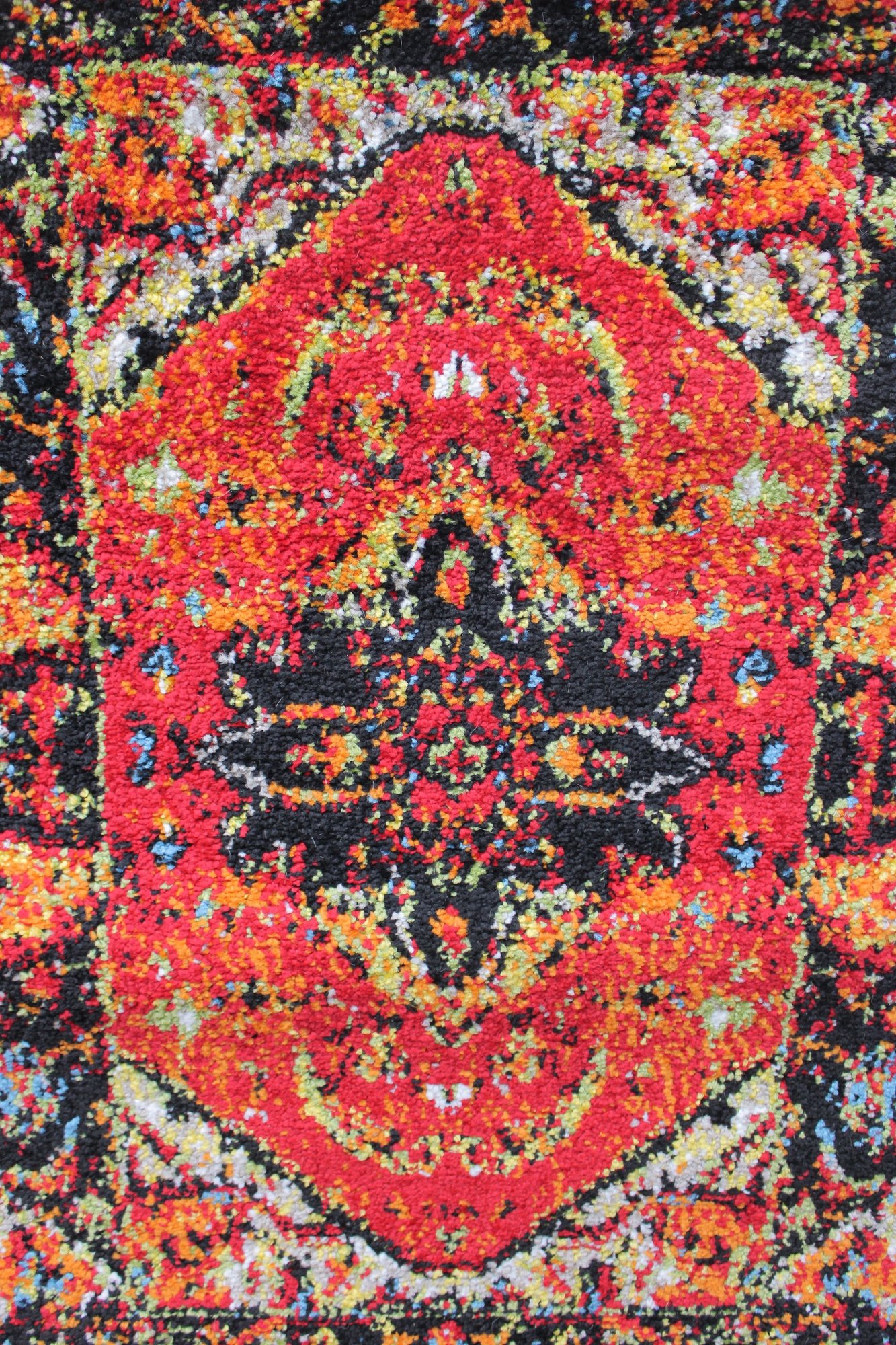 The rug showcases a distressed, overdyed-style pattern with a central medallion and intricate detailing throughout, giving it a modern take on classic oriental designs. The vibrant color palette makes it a standout piece, perfect for adding warmth and visual interest to any room.