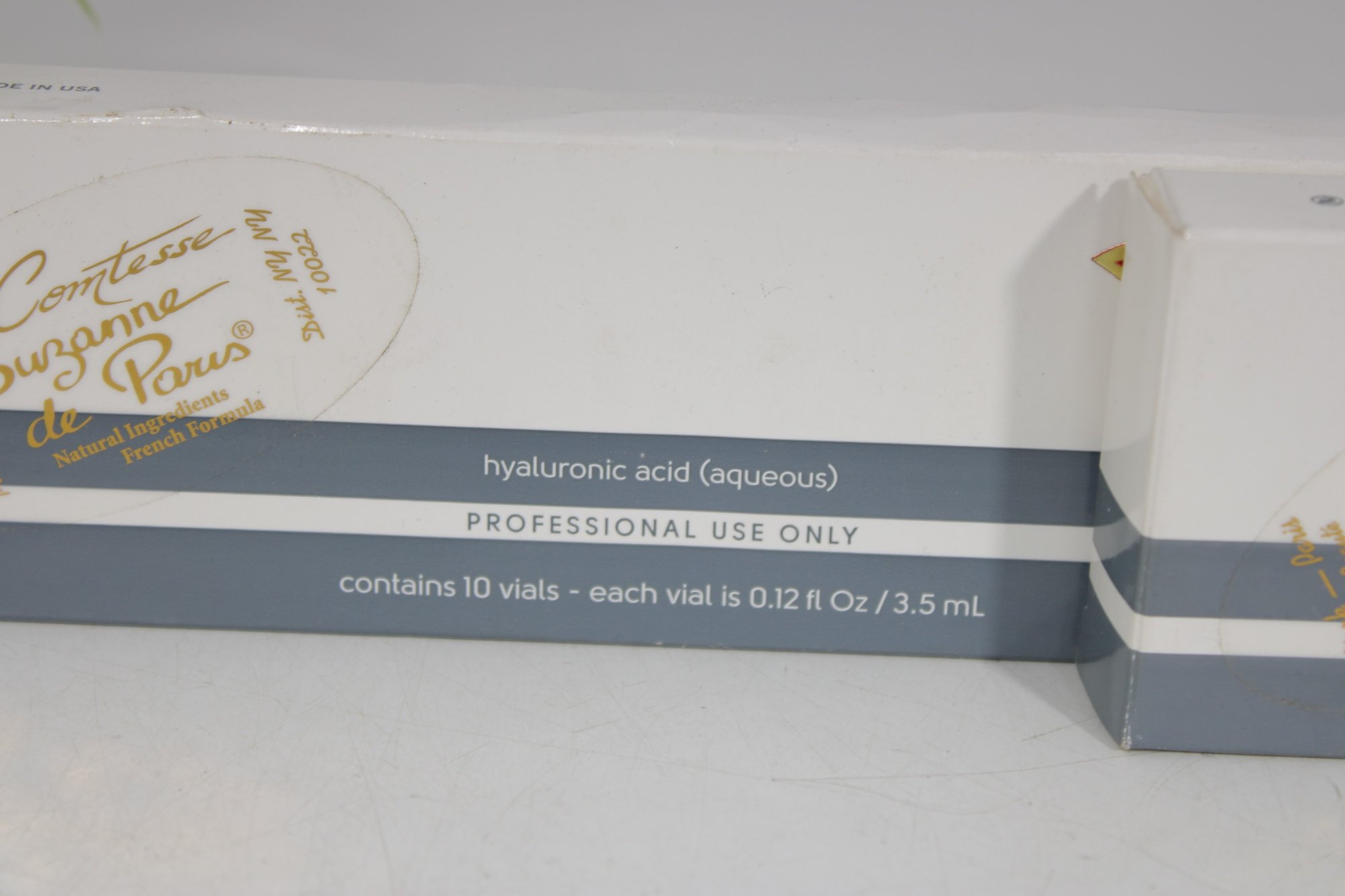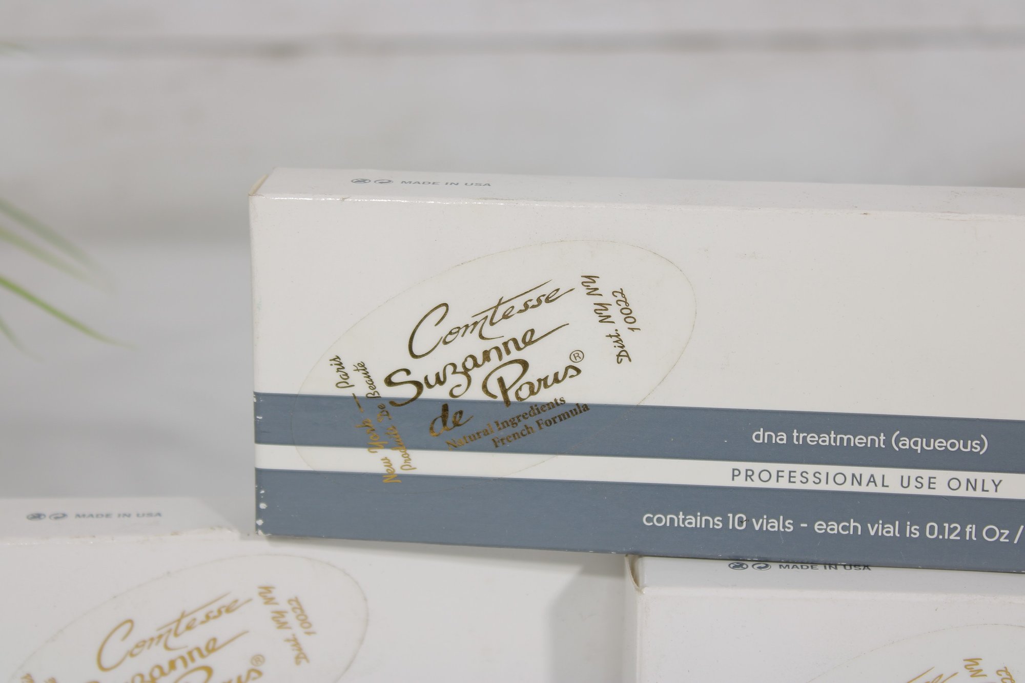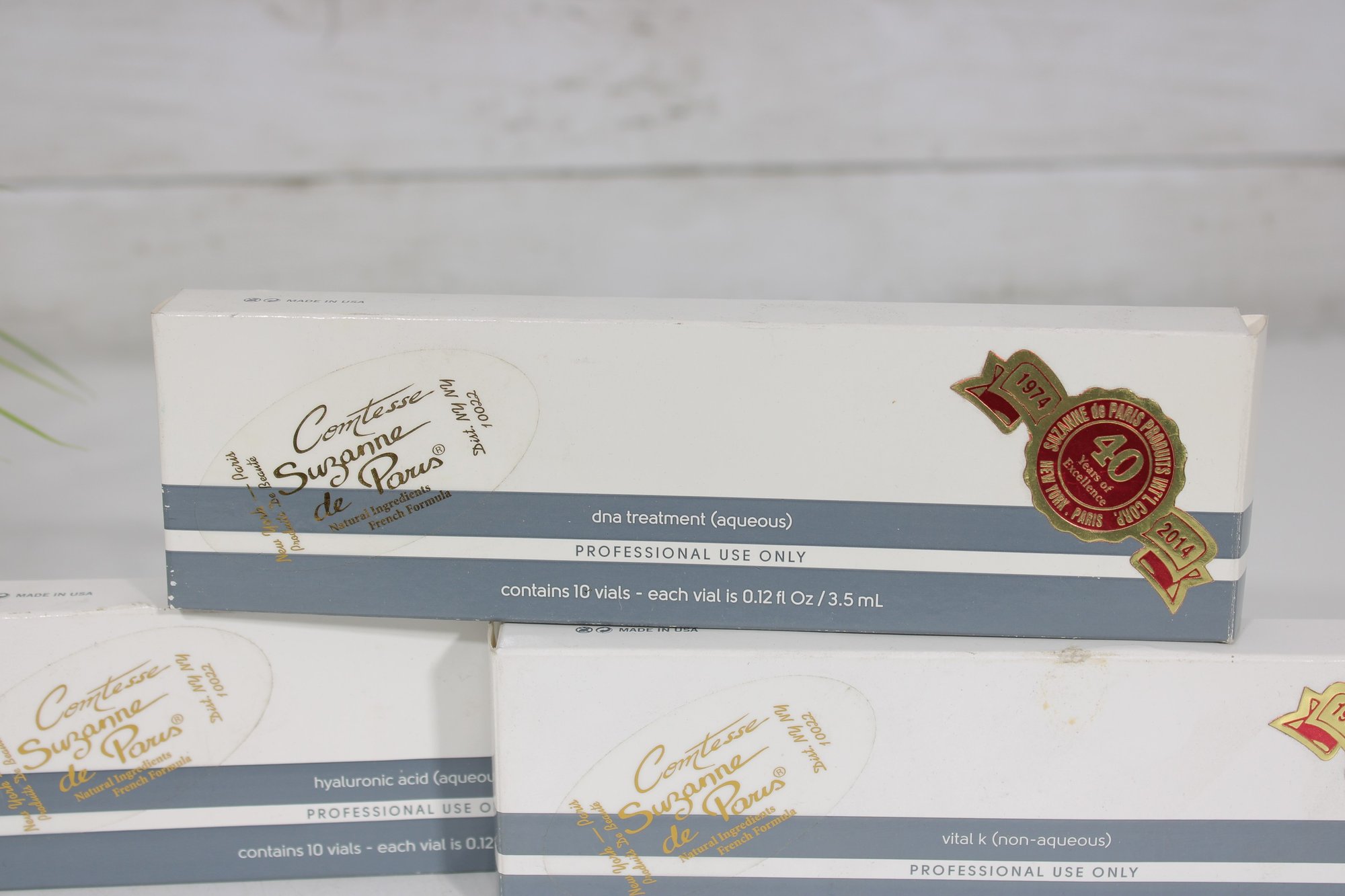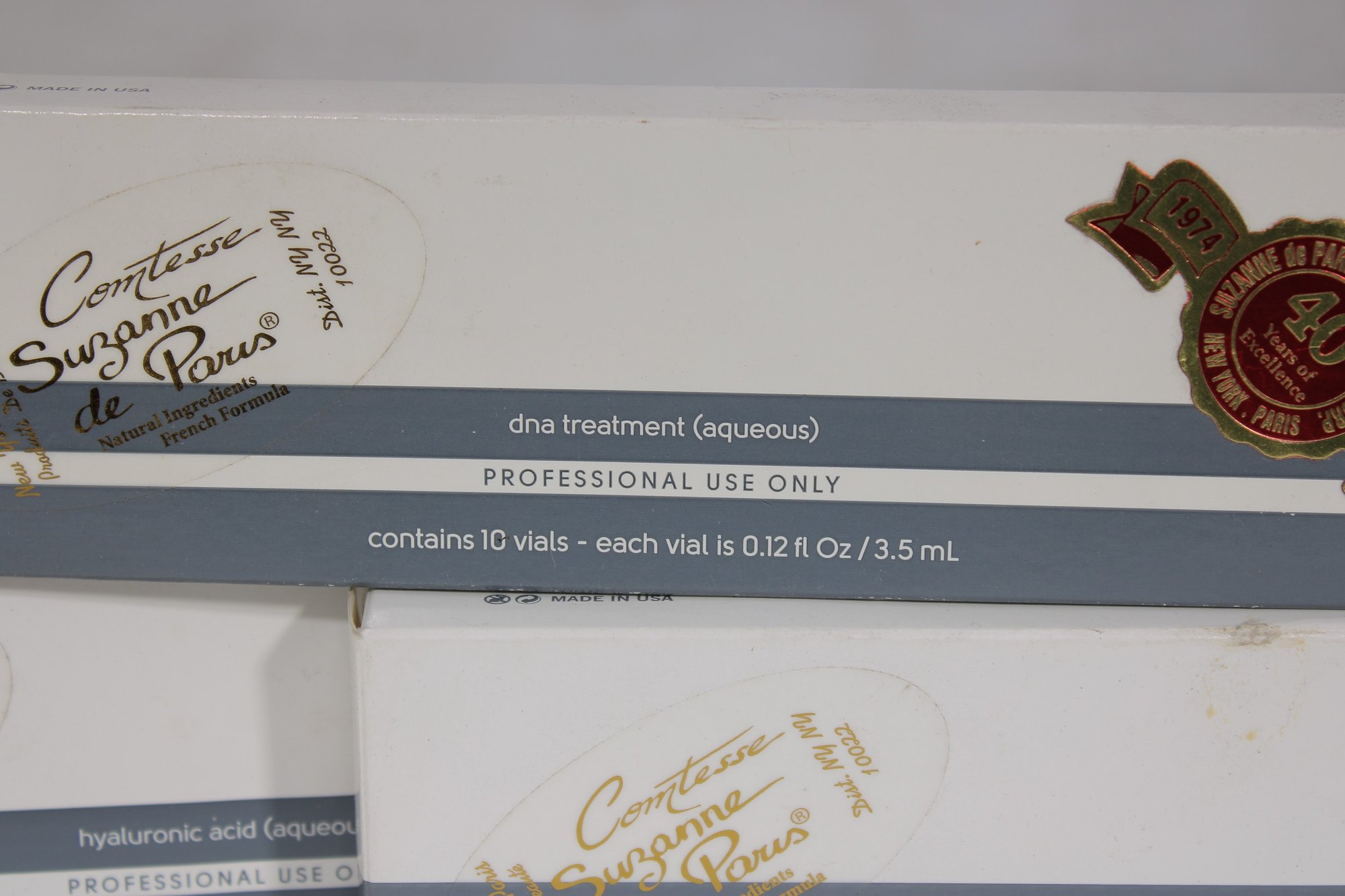Each box is labeled Professional Use Only and contains 10 vials, with each vial measuring 0.12 fl oz / 3.5 ml. These treatments are identified as DNA treatment (aqueous) and hyaluronic acid (aqueous) formulations.