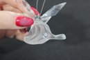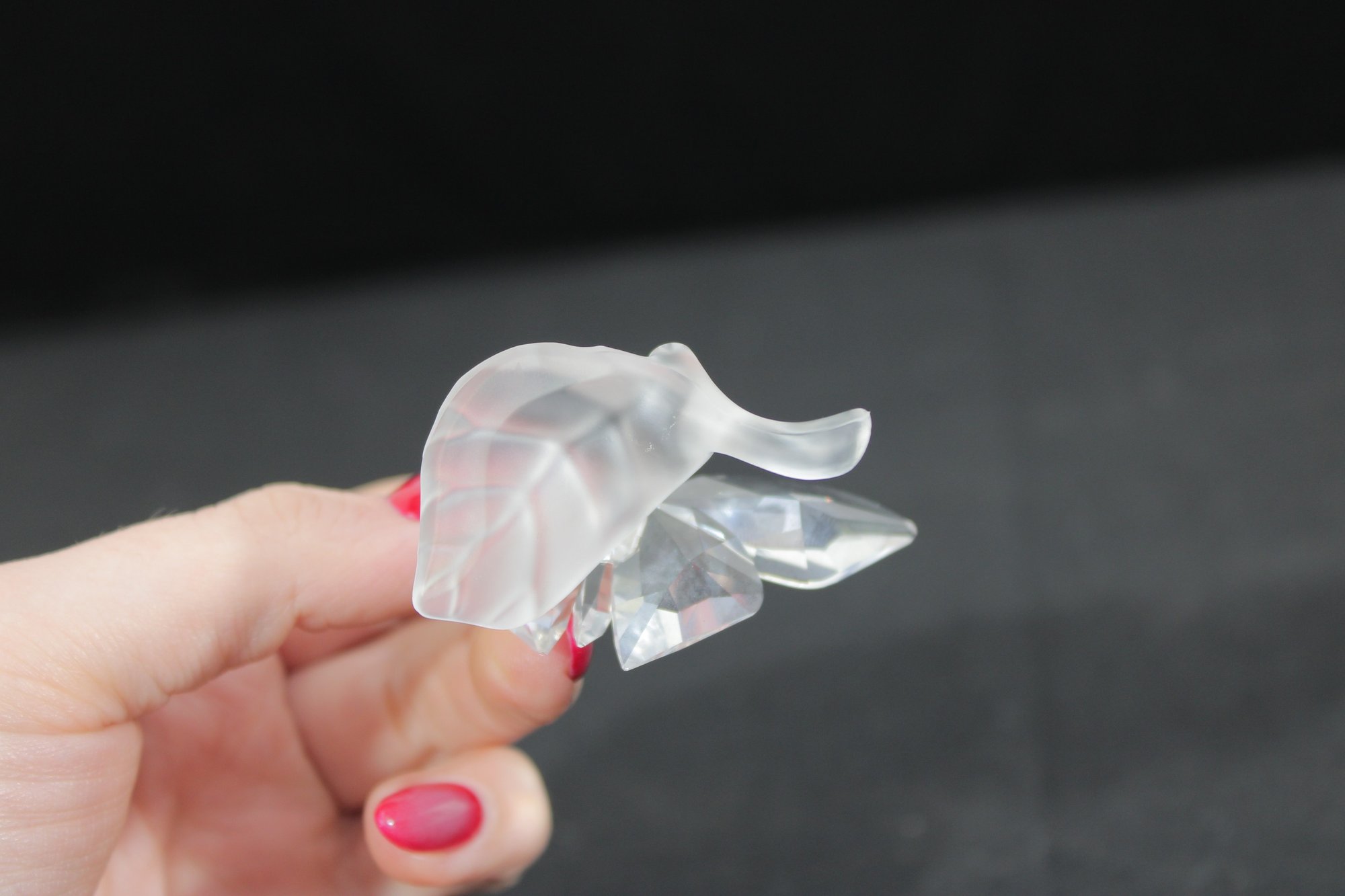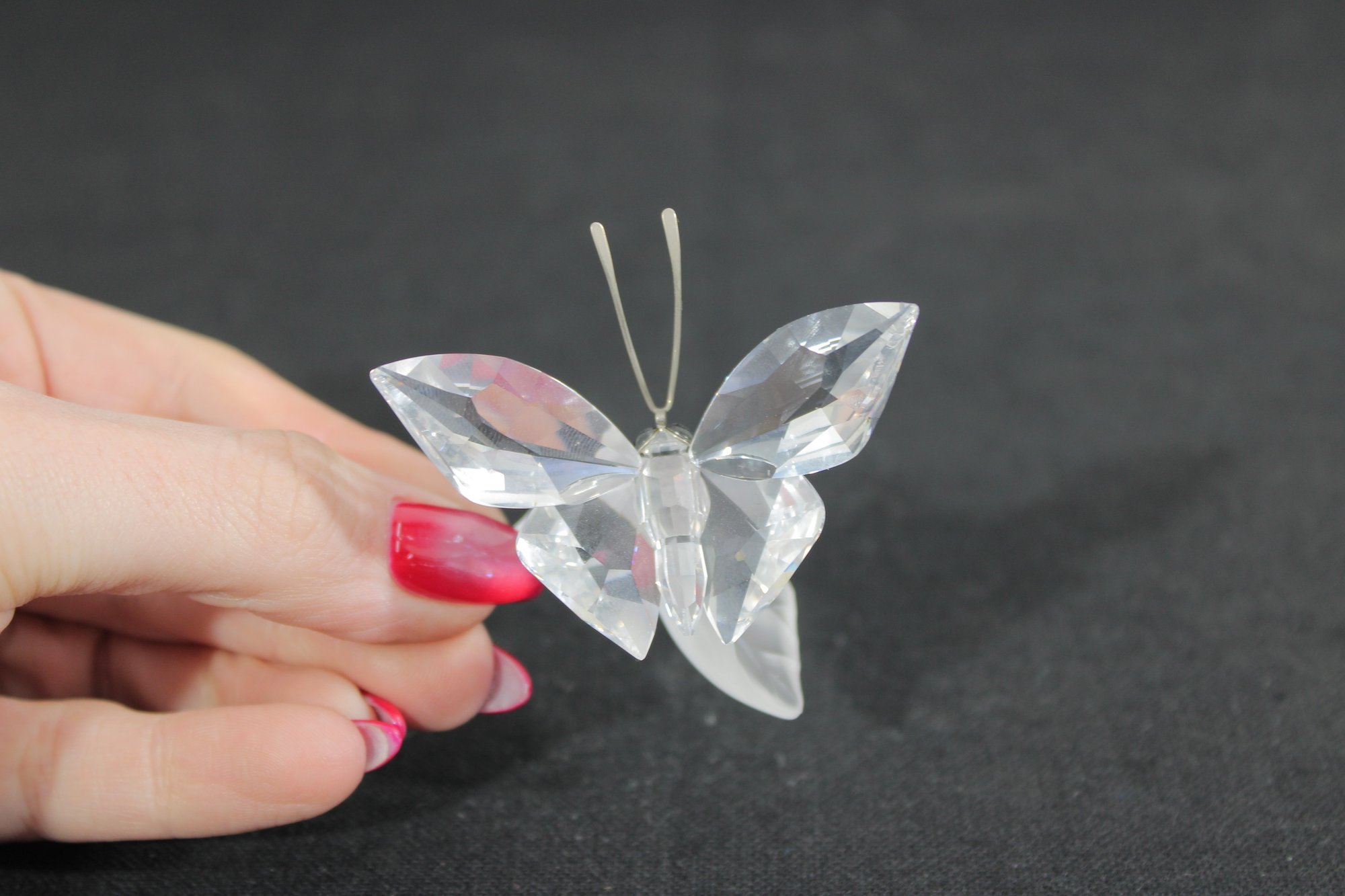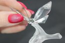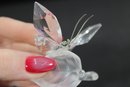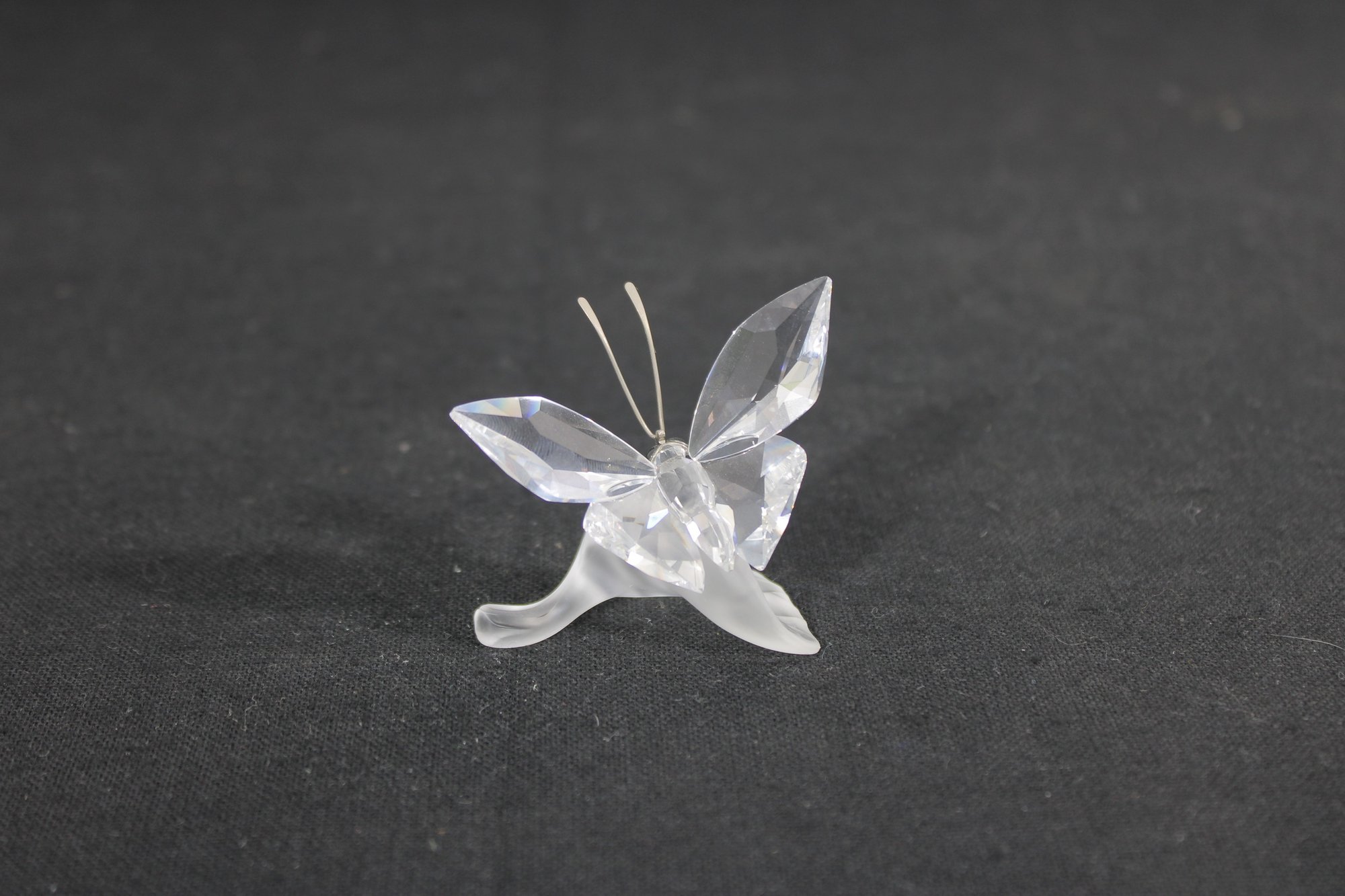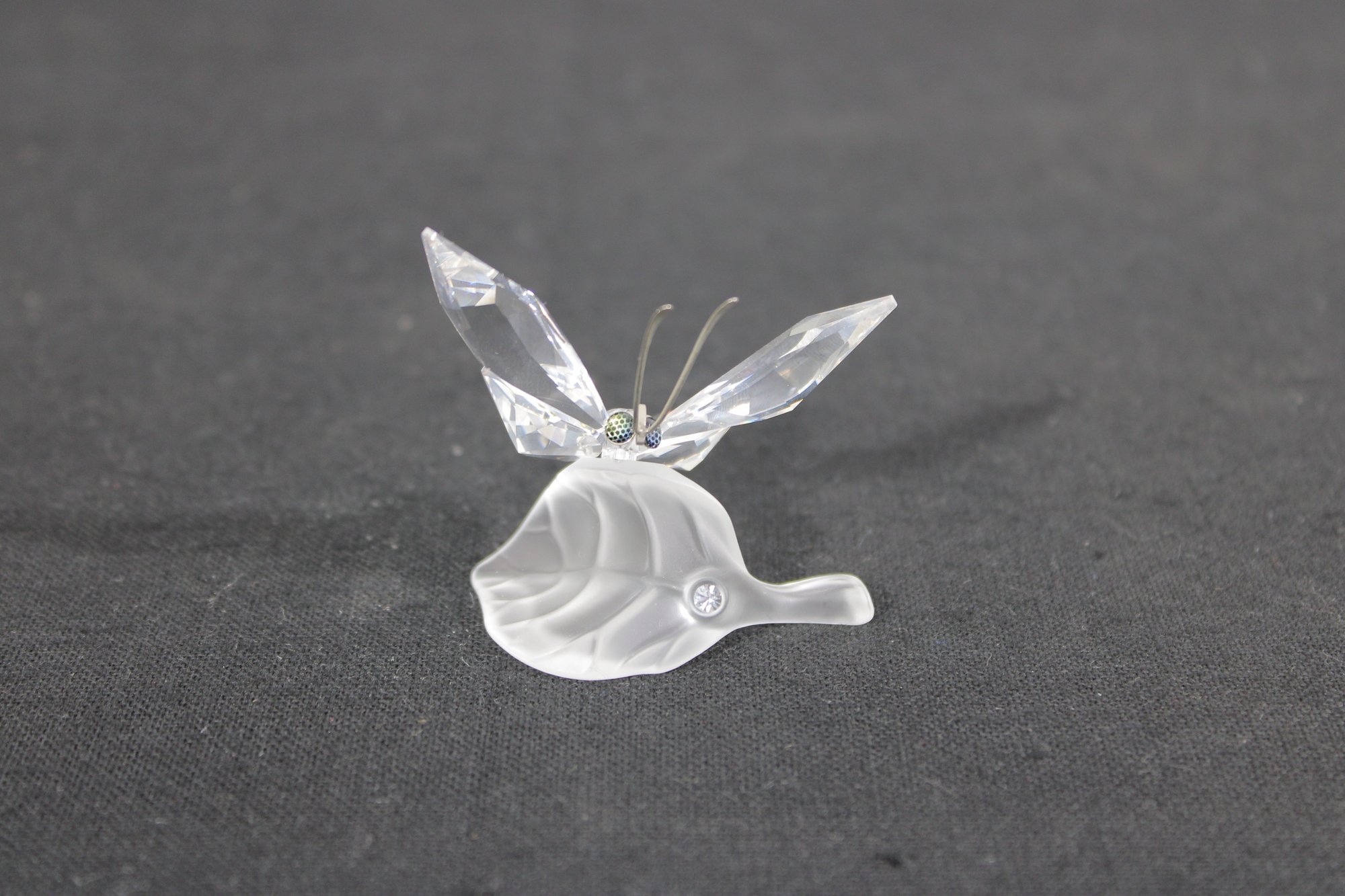 Delicate Swarovski crystal figurine featuring a graceful butterfly perched on a frosted crystal leaf. The butterfly’s wings are beautifully faceted for maximum sparkle, complemented by slender metal antennae and a subtle crystal accent at the body.