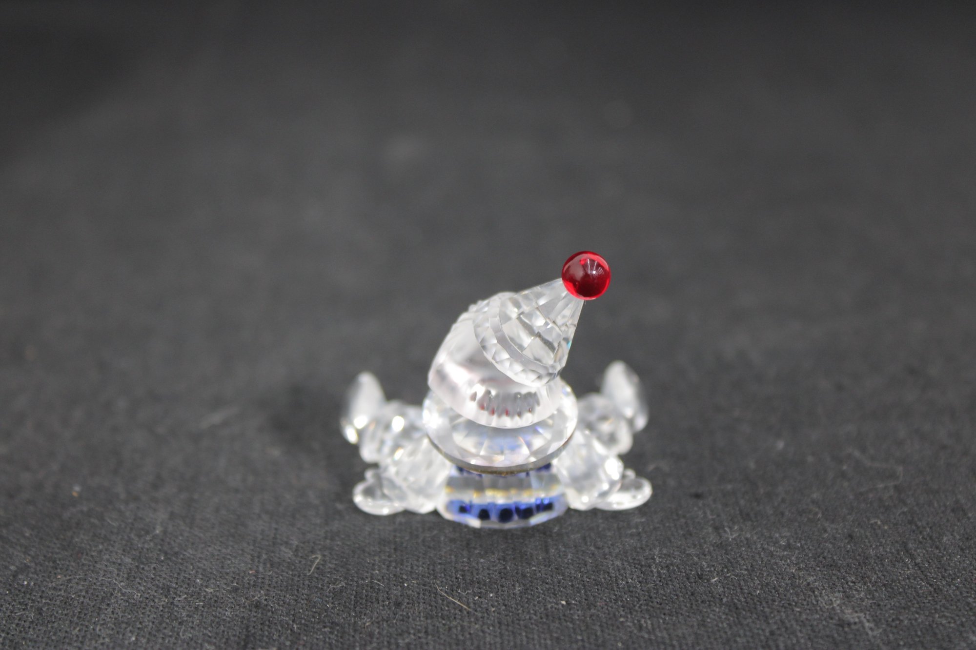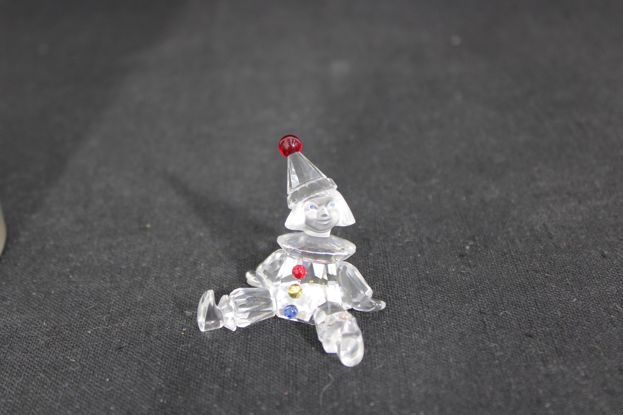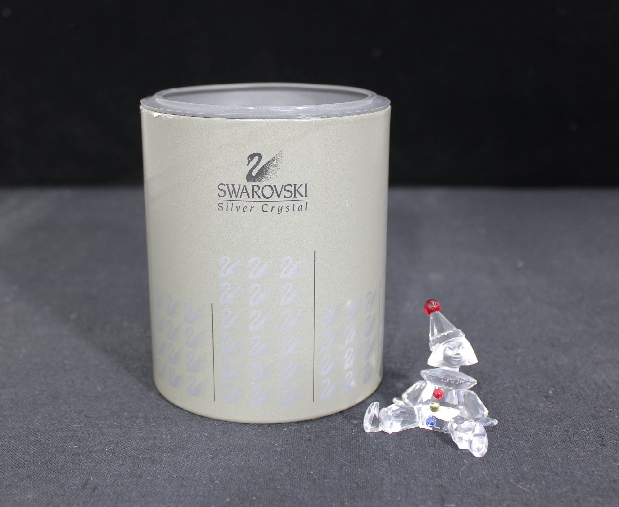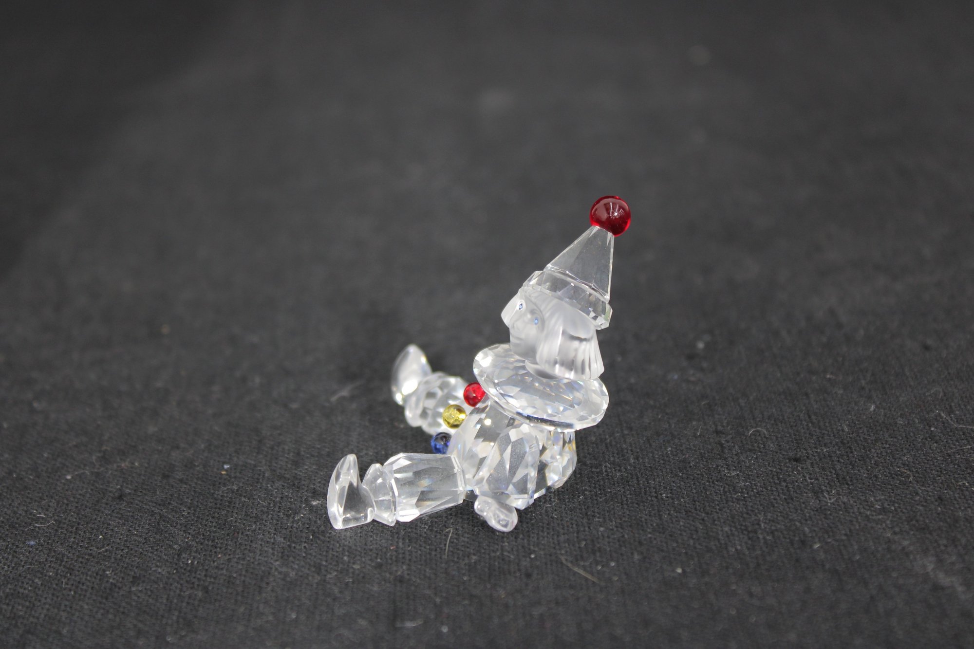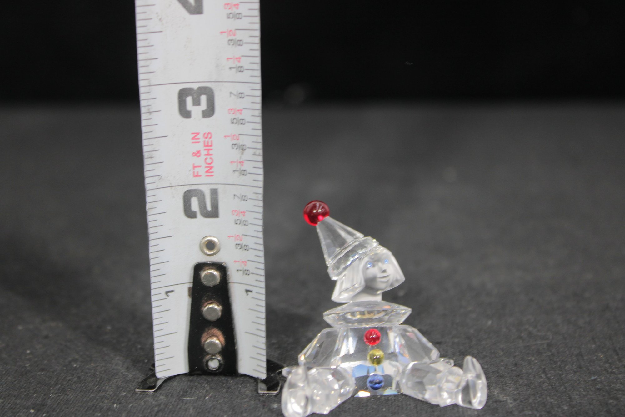 Charming Swarovski crystal clown figurine, beautifully crafted in clear faceted crystal with playful colored accents that bring this whimsical character to life. The detailed design includes a pointed hat, expressive pose, and bright accent stones, making it a standout decorative collectible.