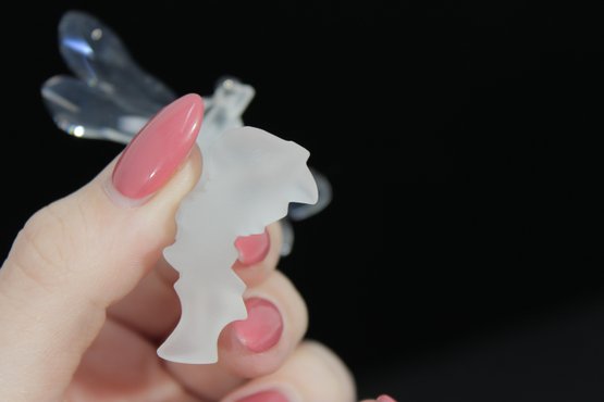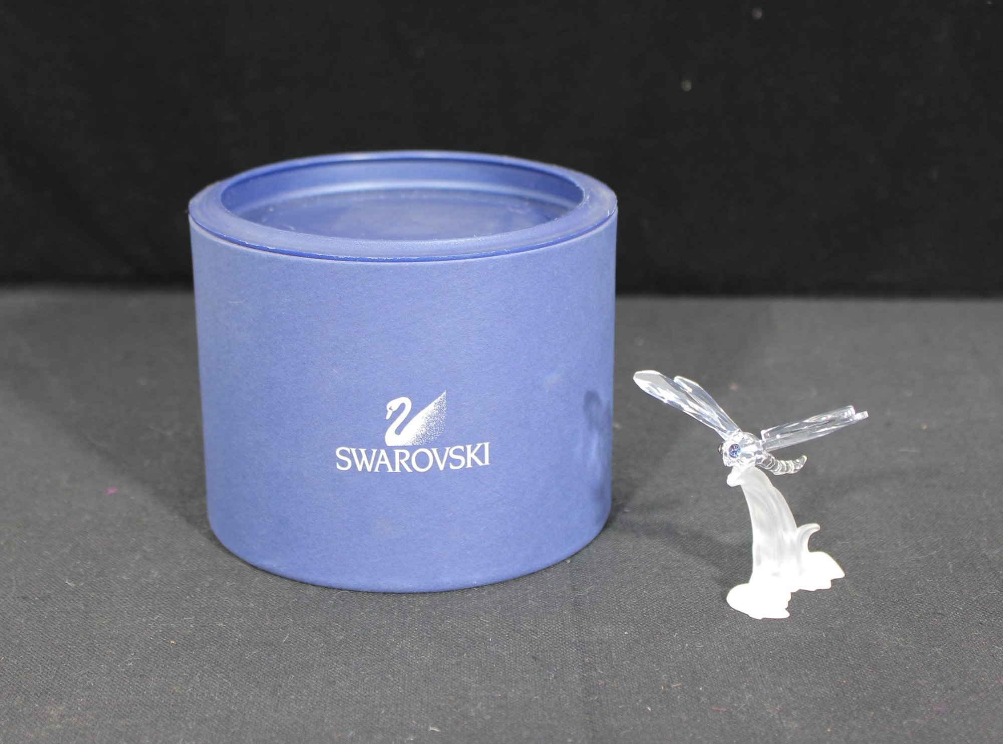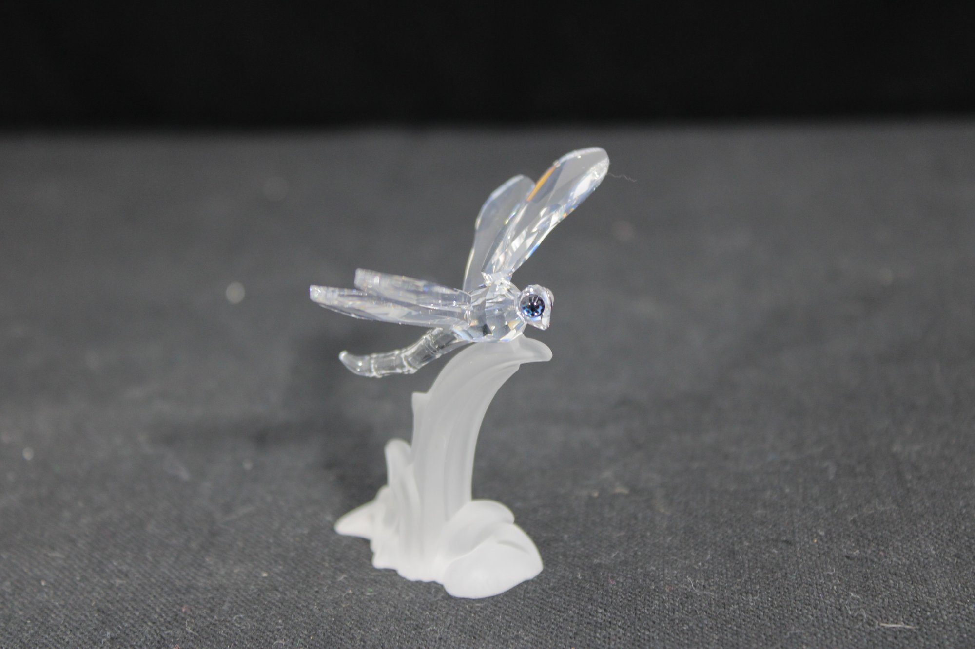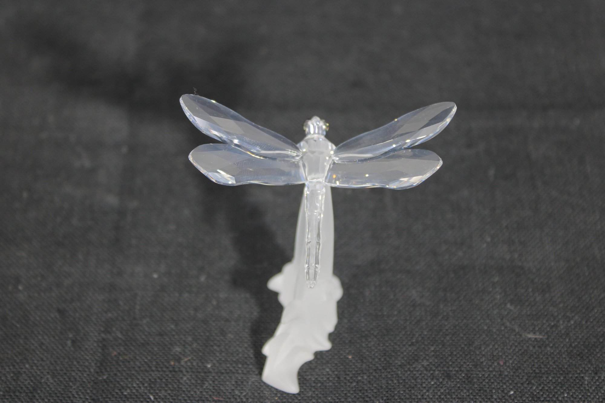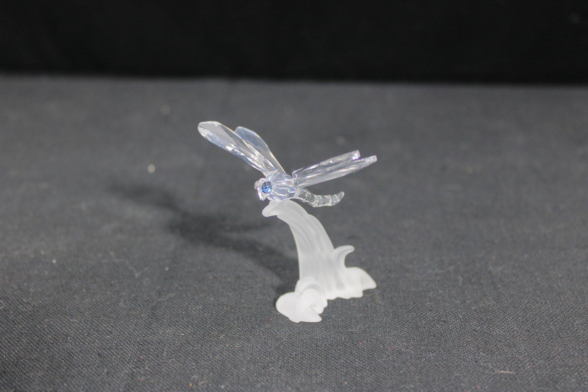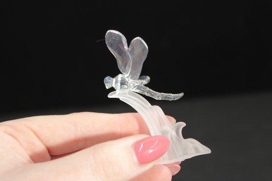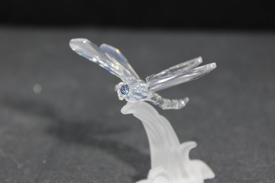 The dragonfly is perched on a frosted crystal base, creating a graceful sense of movement and light. A timeless collectible, perfect for Swarovski enthusiasts or as a decorative accent.