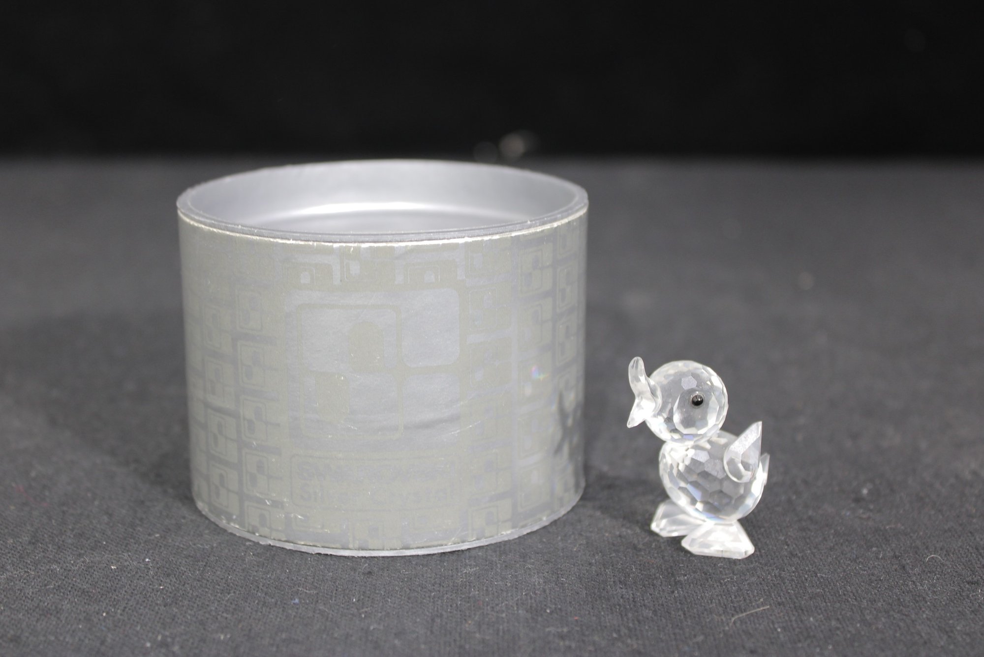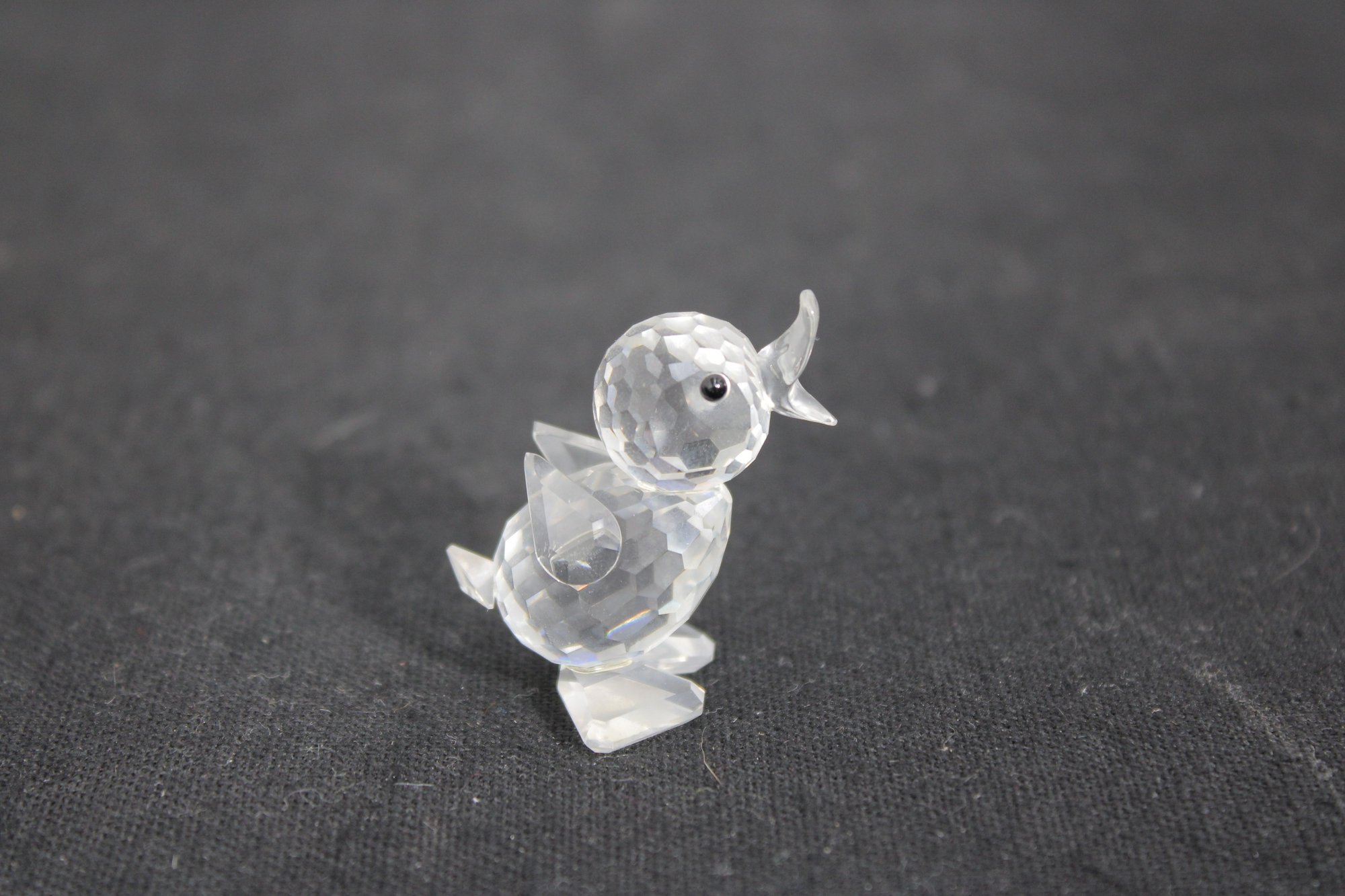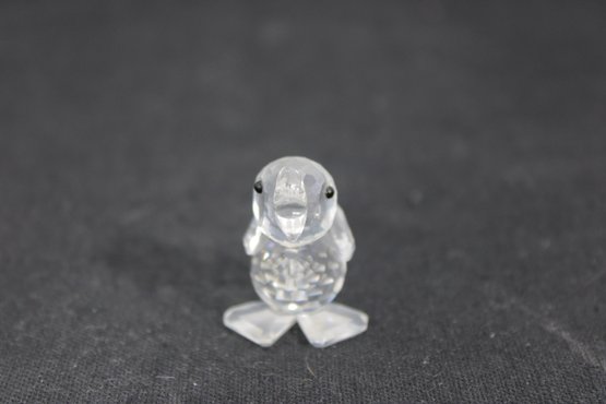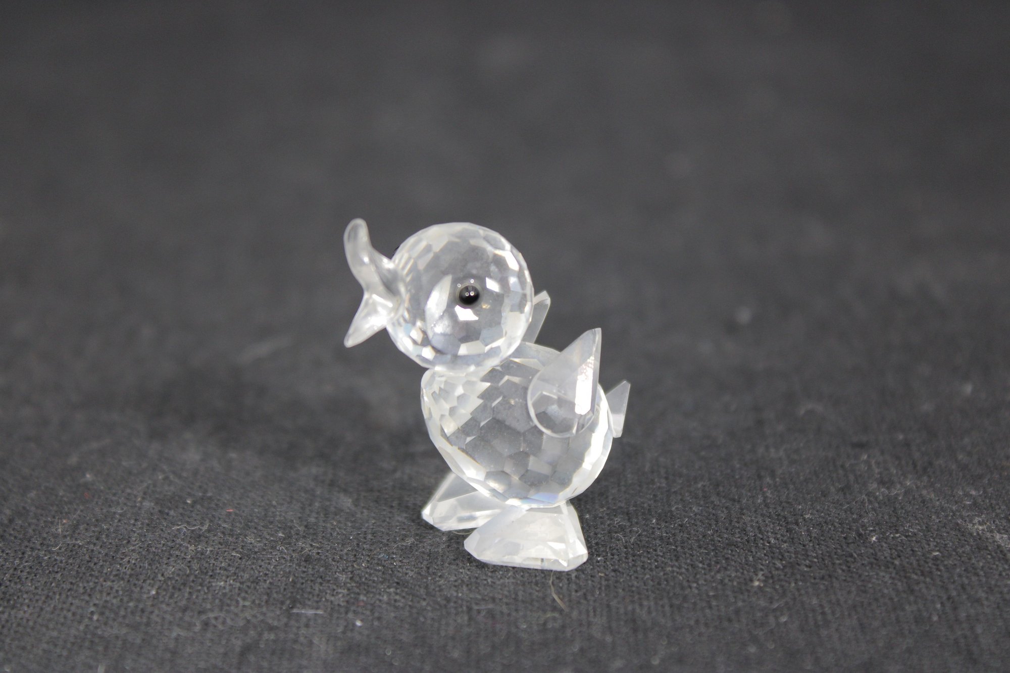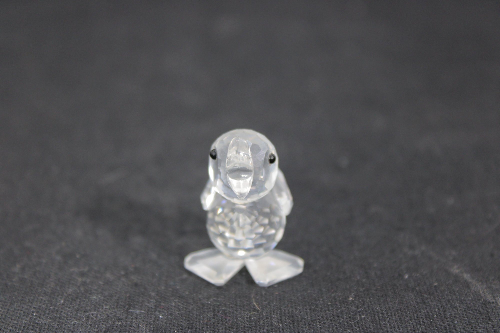 Adorable Swarovski crystal duck figurine, crafted in beautifully faceted clear crystal that reflects light with signature Swarovski brilliance. This charming little bird features a rounded body, raised wing detail, and sweet expression, making it a standout miniature collectible.