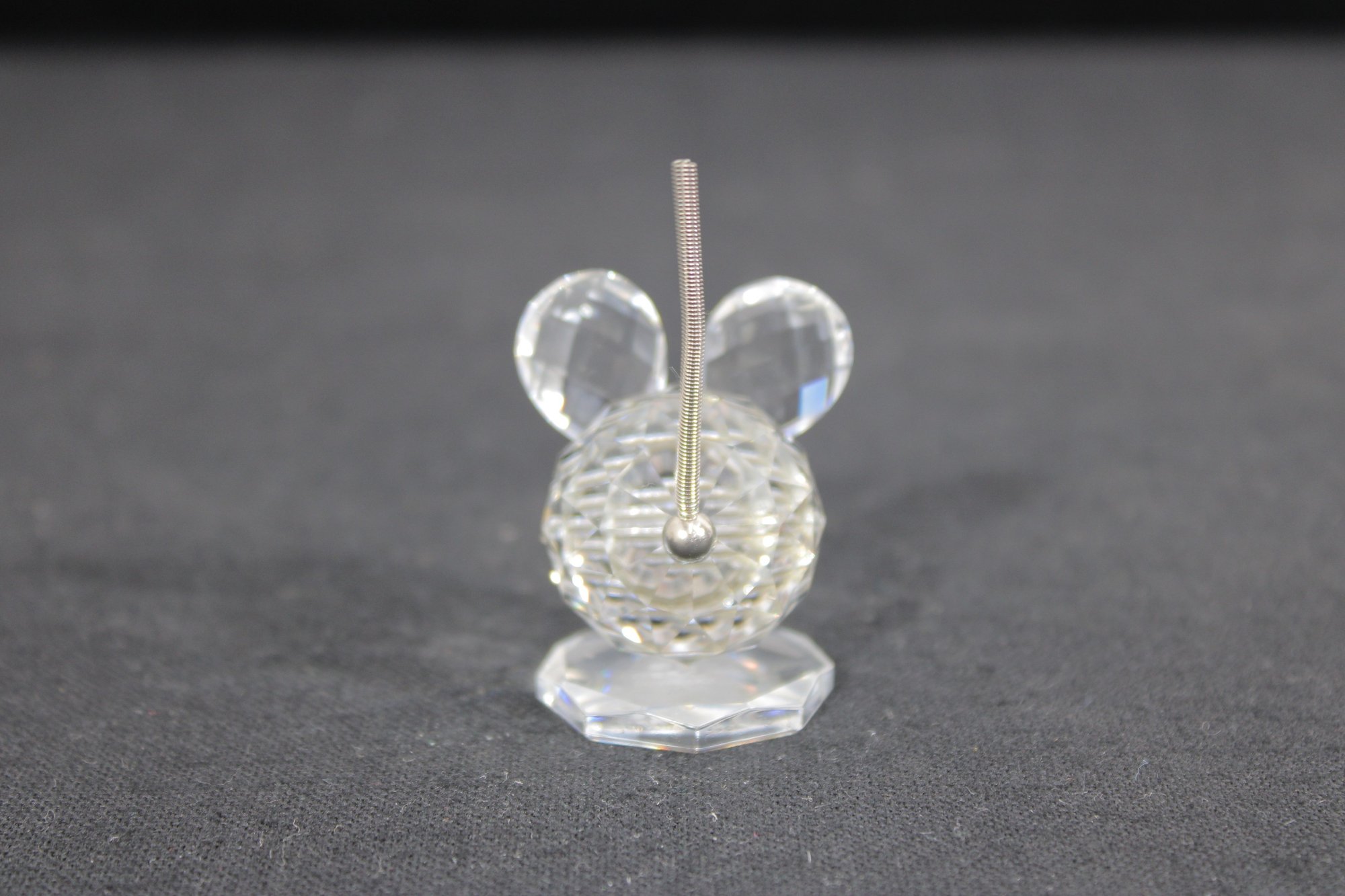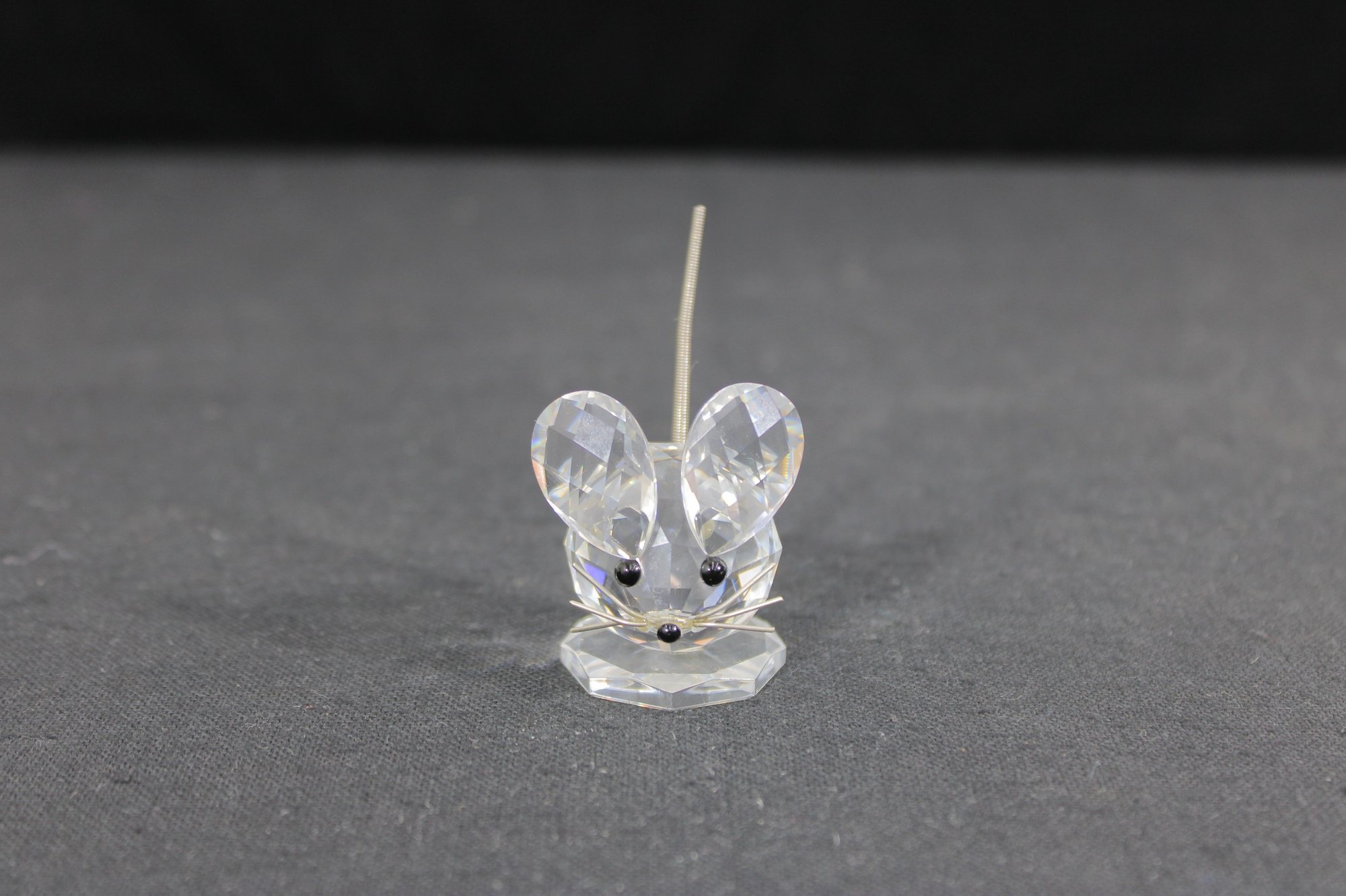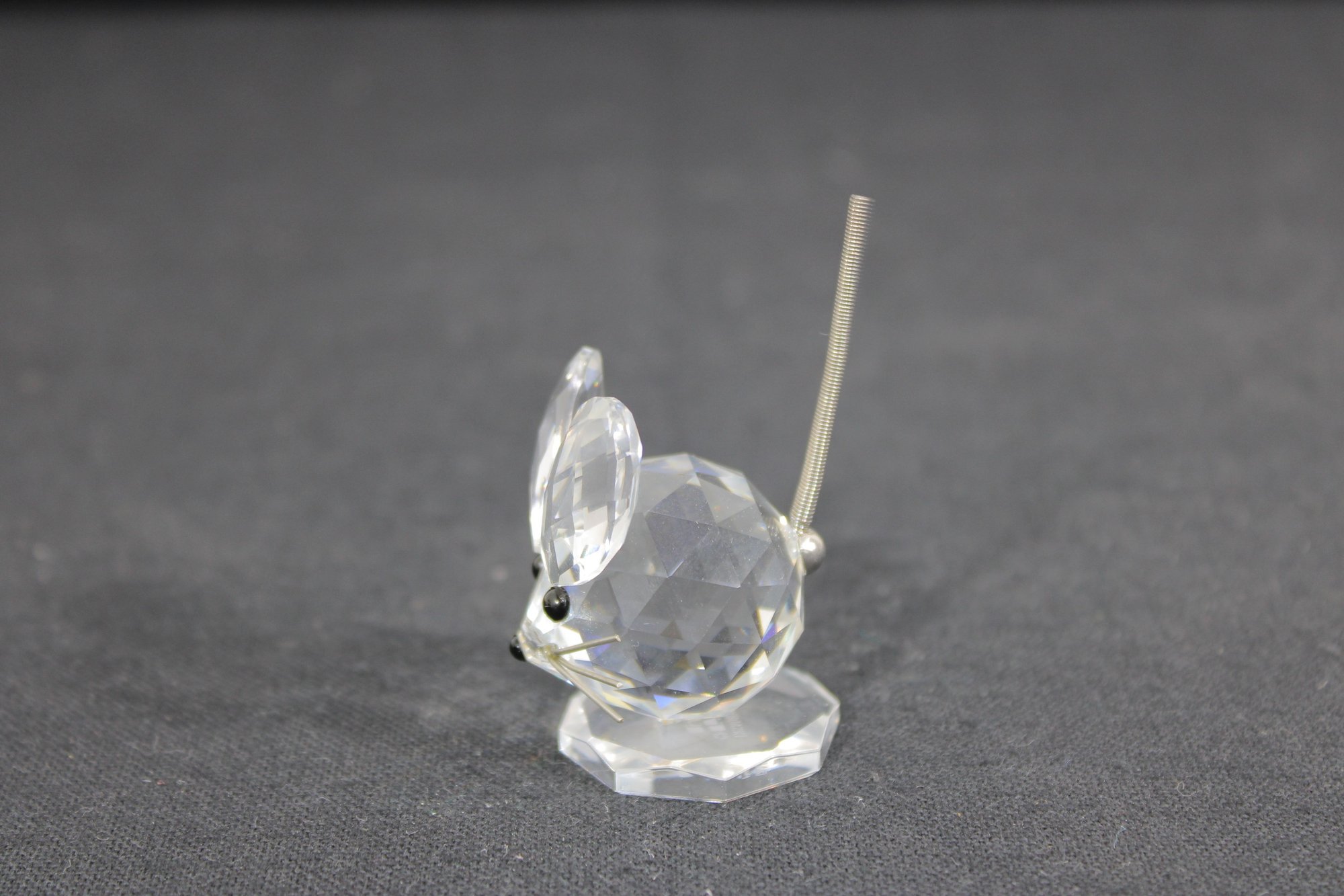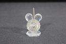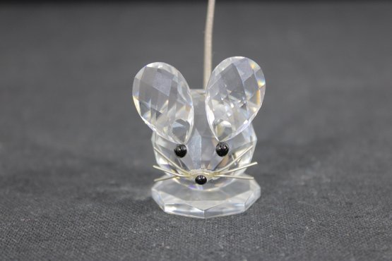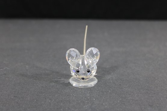 Charming Swarovski crystal mouse figurine, crafted in clear faceted crystal with delightful detail. The design features large rounded ears, black crystal eyes, and a slender metal tail, all set on a faceted crystal base that enhances its sparkle.