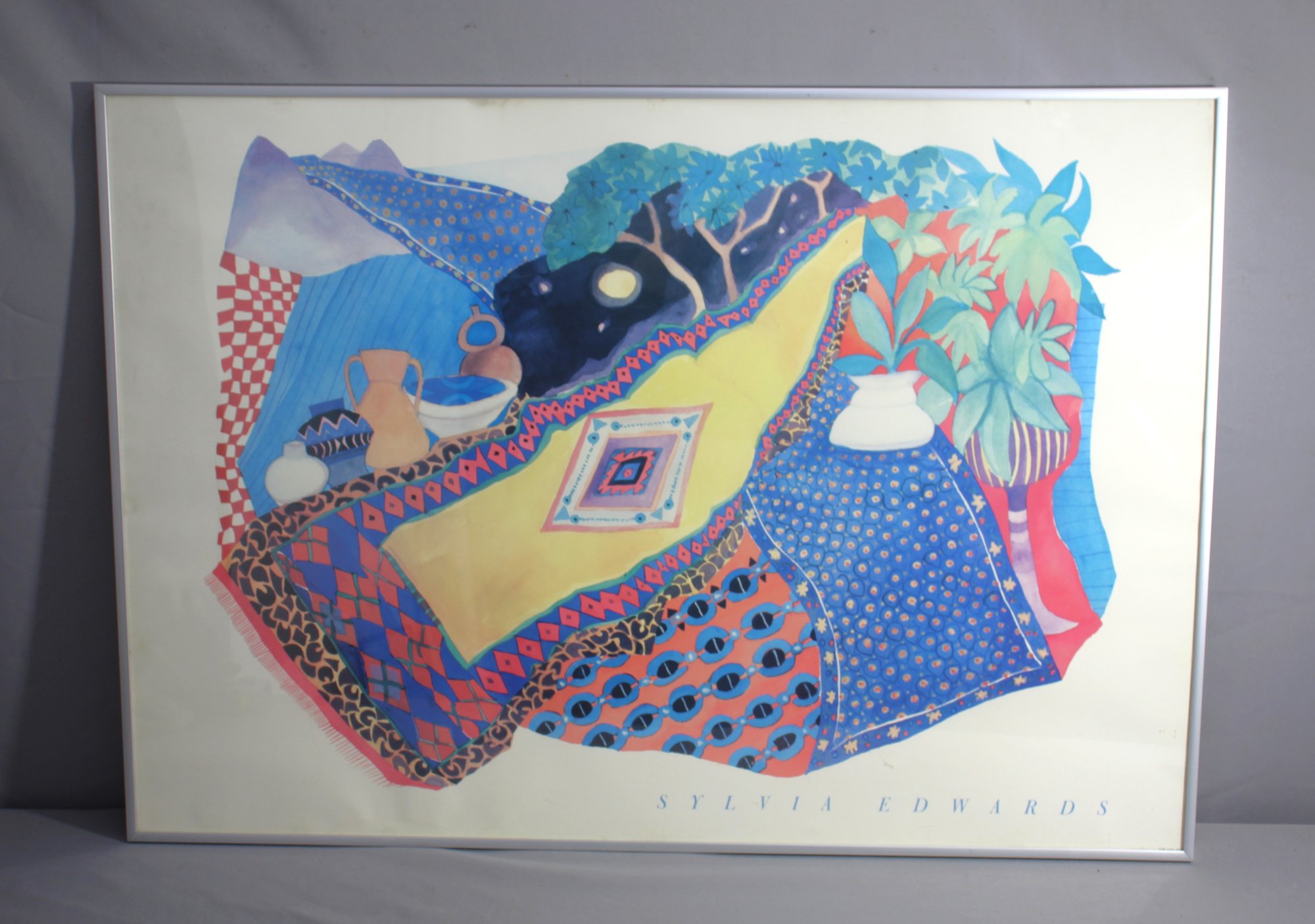 This captivating piece features an array of vivid colors and intricate patterns that exemplify Edwards' unique style. The composition showcases a dynamic contrast between geometric shapes and organic forms, creating a visual feast that draws the eye across every inch of the canvas.This piece is a splendid reflection of Sylvia Edwards' artistic legacy, renowned for her vibrant use of color and form.
