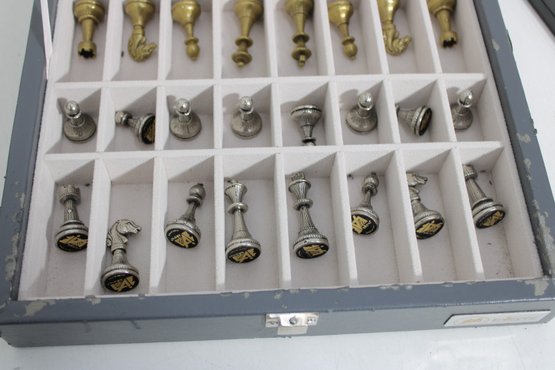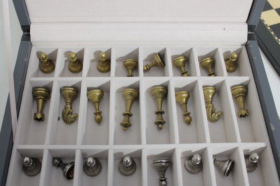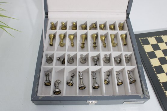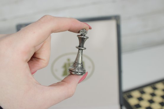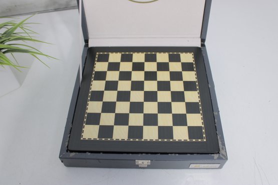 The set includes a full complement of chess pieces housed in a fitted storage case, along with a matching chess board. The pieces have a satisfying weight and detailed craftsmanship, offering a premium playing experience.