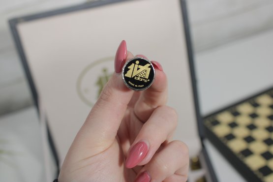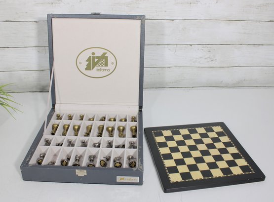 this elegant Italfama brass chess set, featuring classic Staunton-style chess men in striking gold and silver tones. Crafted in Italy, this high-quality set combines traditional design with durable metal construction, making it both a functional game set and a sophisticated display piece.