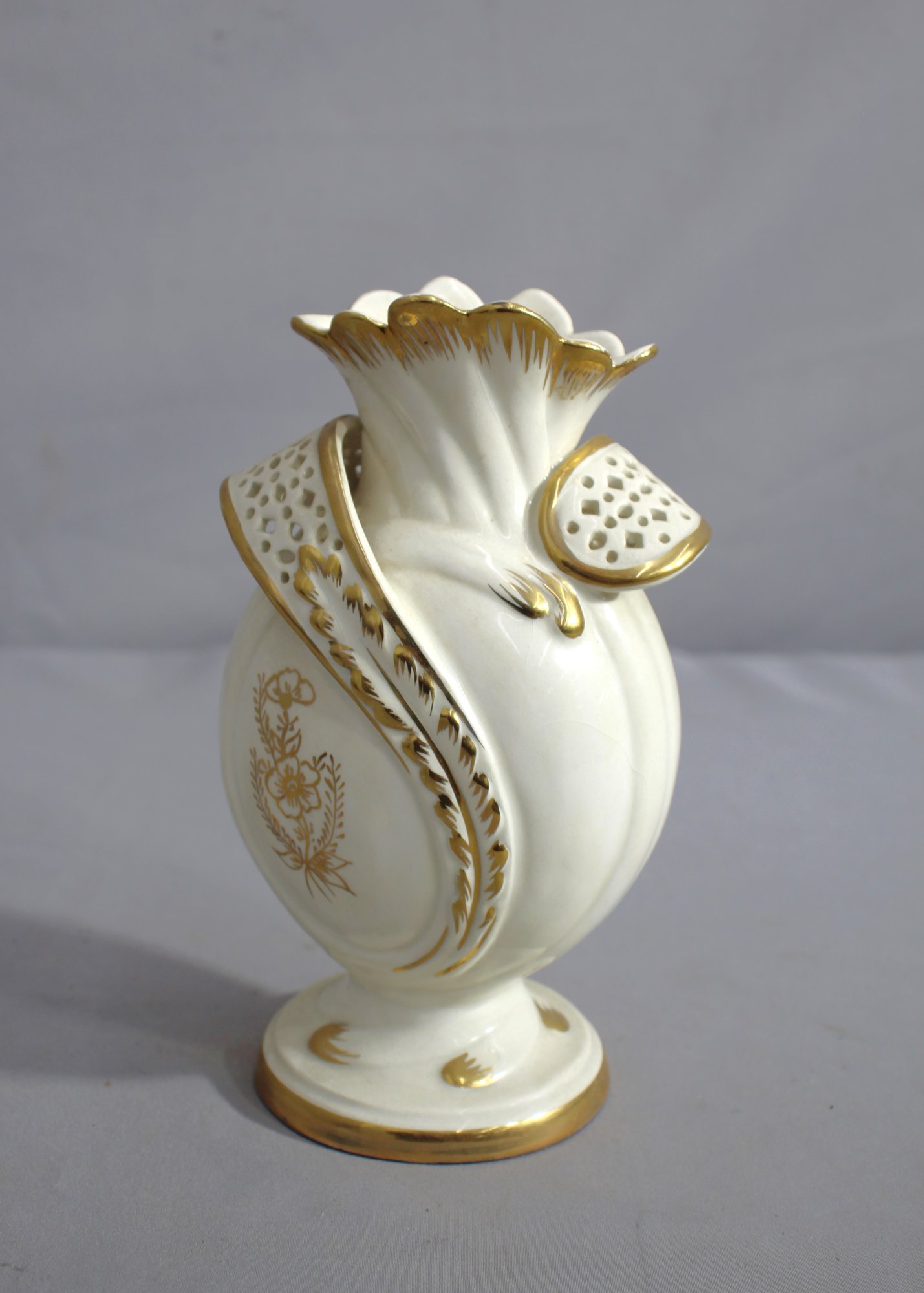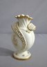 a stunning porcelain vase that's as much a decorative masterpiece as it is a vessel. This hand-painted beauty stands out with its unique flora-inspired form, boasting a flared rim and petal-like protrusions, each highlighted with rich gold accents that catch the light and draw the eye.