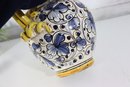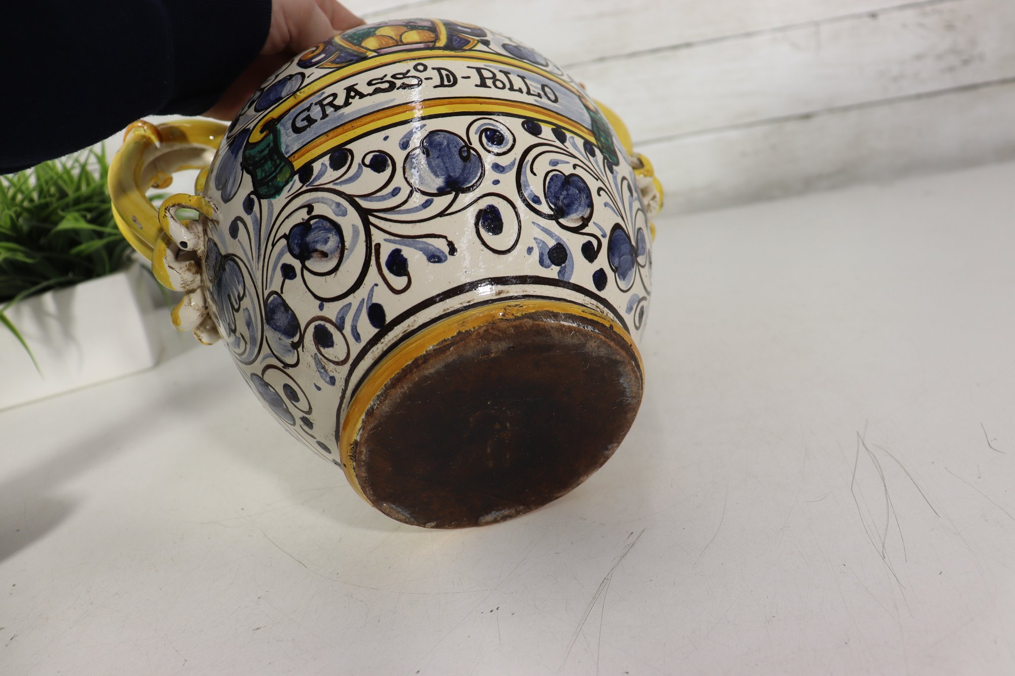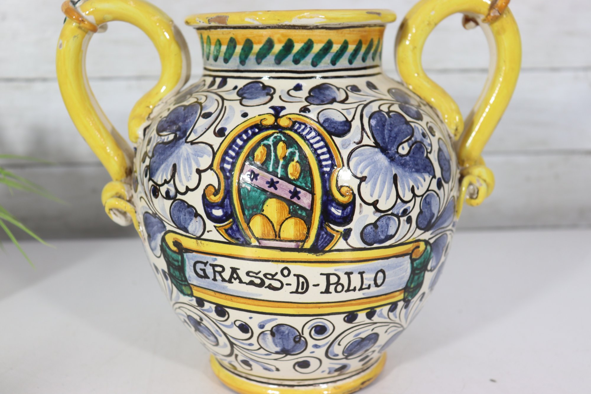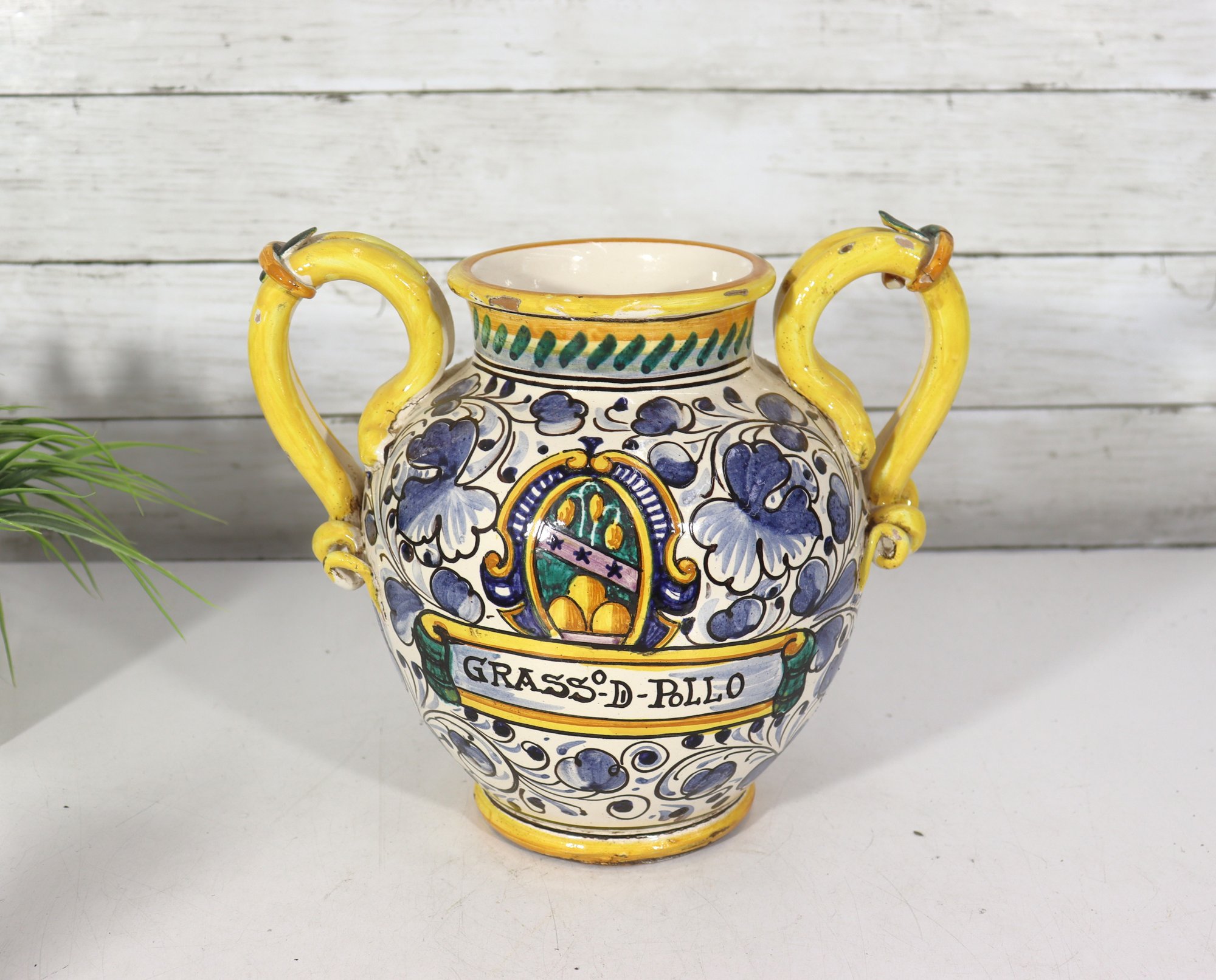 The front displays a decorative crest with the inscription “Grasso-D-Pollo”, surrounded by scrolling floral and foliate motifs. The craftsmanship and bold glazing give this piece strong visual presence, making it perfect as a display accent or collector’s item.