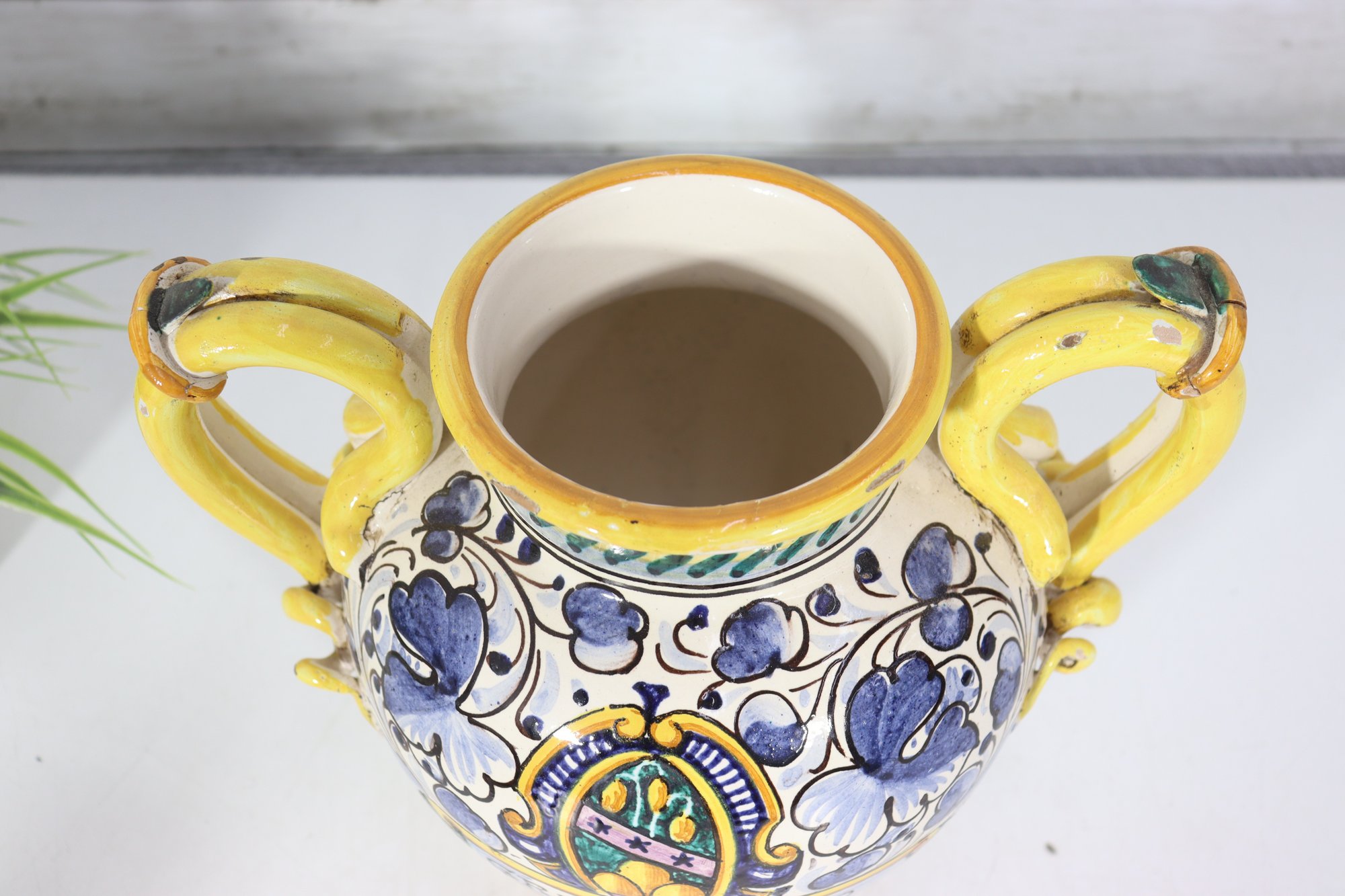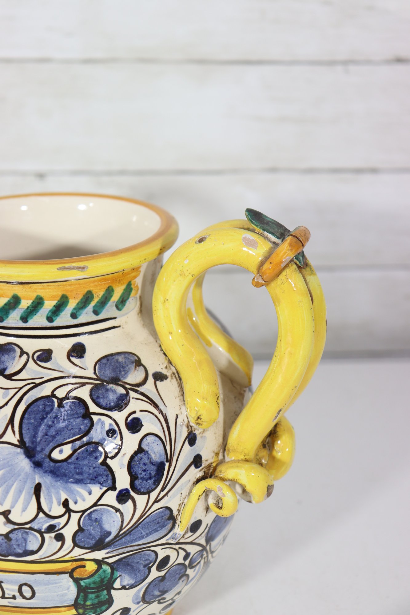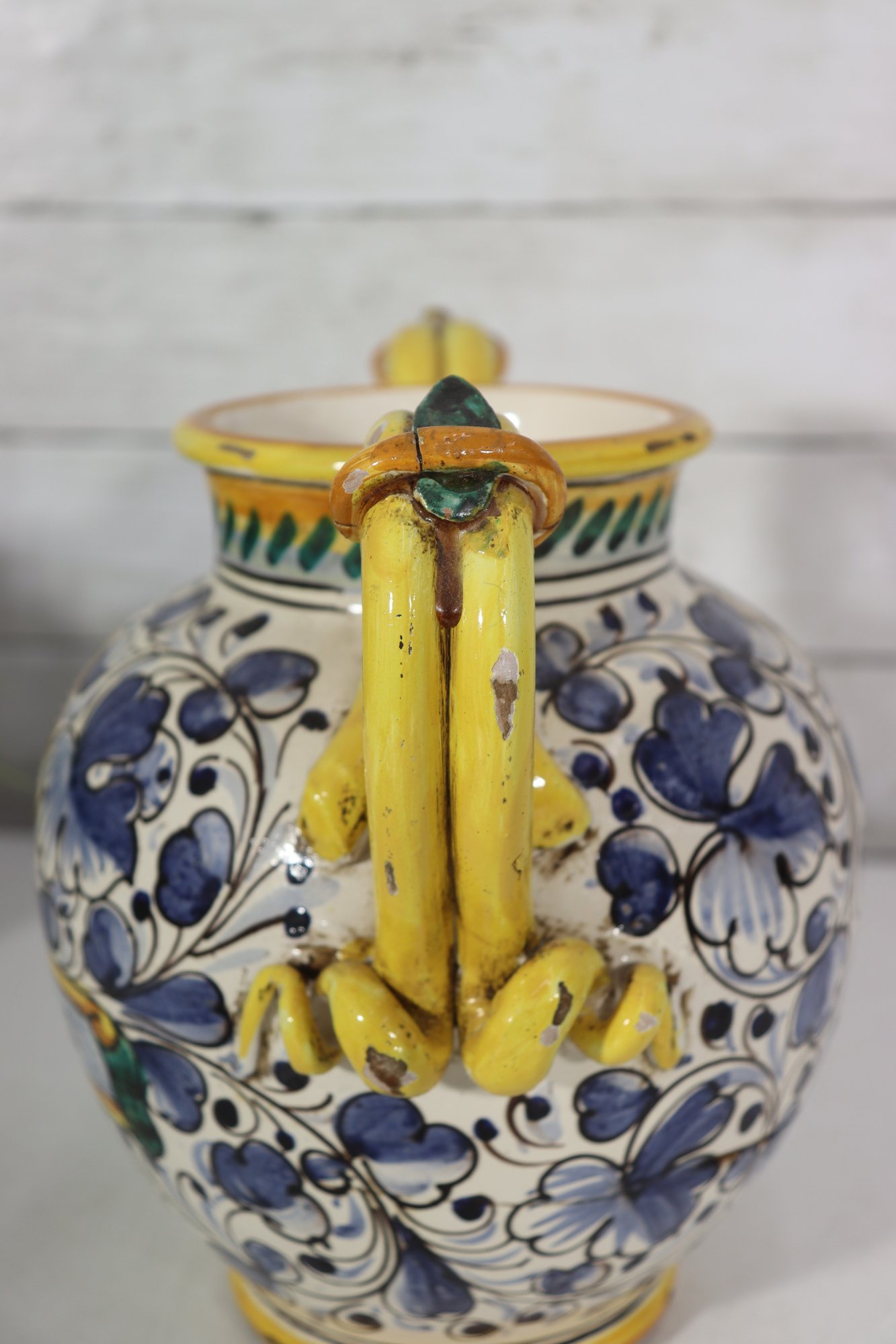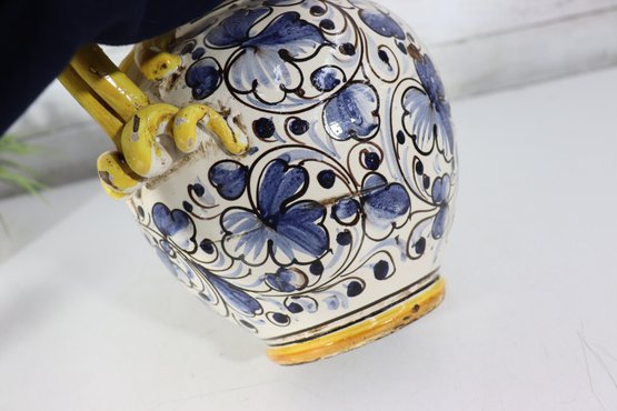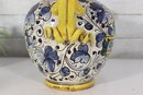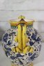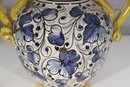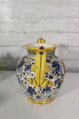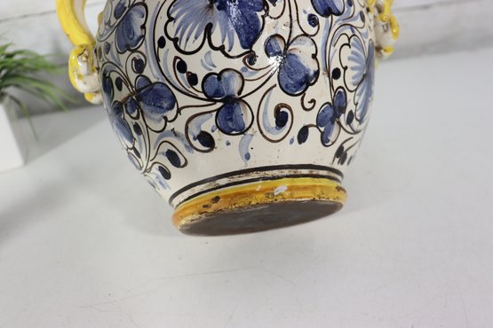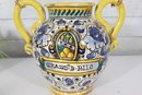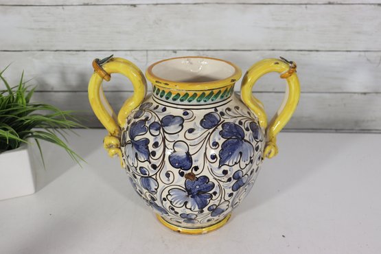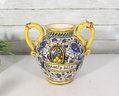 a beautiful Italian Majolica–style ceramic vase / urn, standing approximately 9 inches tall. This striking piece features dual loop handles, vibrant hand-painted decoration, and a traditional Mediterranean color palette of yellow, blue, green, and white.