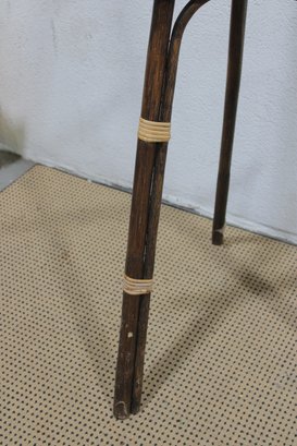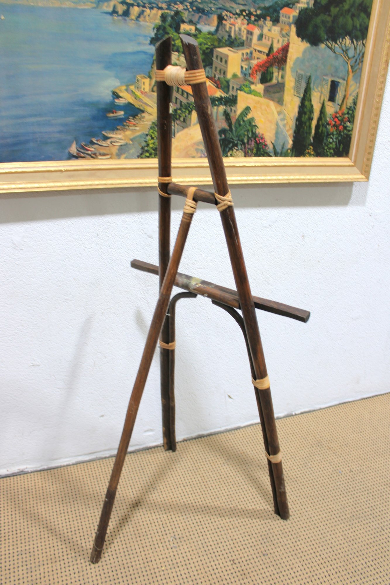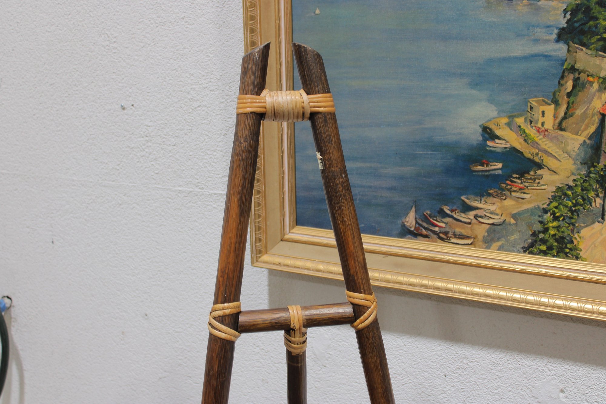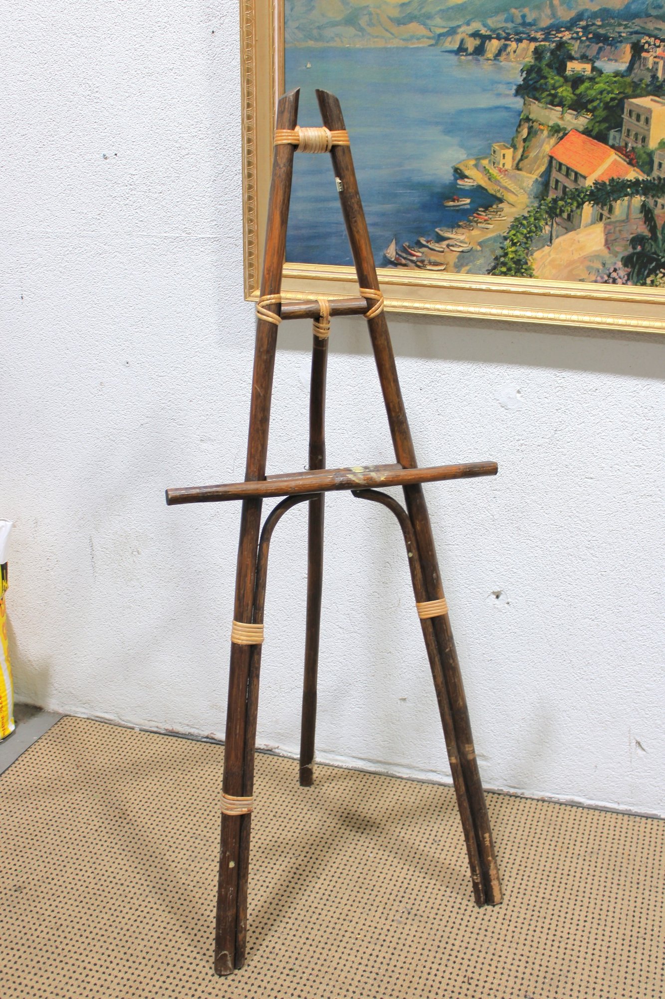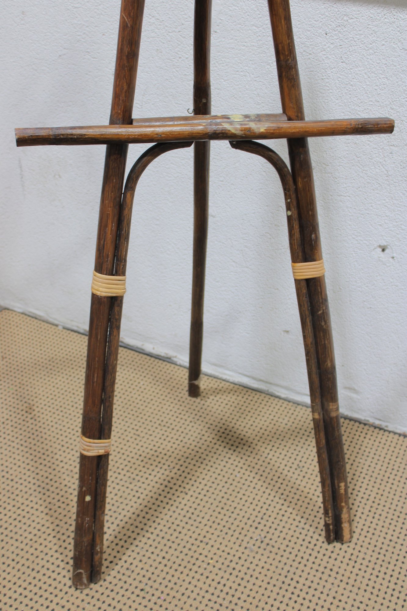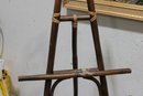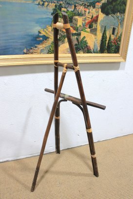 Unique tall bamboo and rattan display easel featuring natural wood tones and decorative wrapped joints. This lightweight yet sturdy piece is perfect for displaying artwork, framed prints, signage, mirrors, or presentation boards.