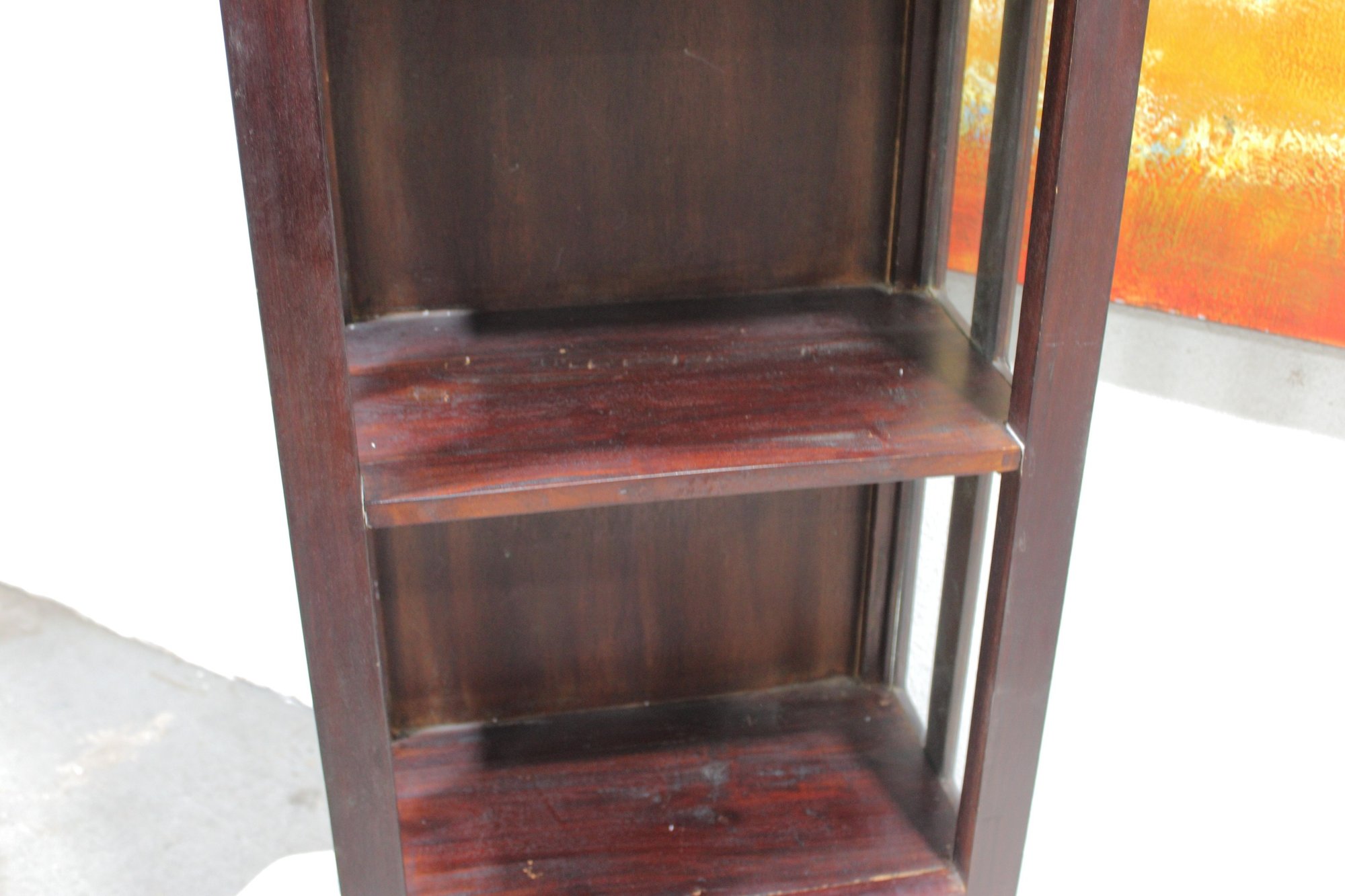 Condition appears consistent with age and use, showing surface wear, scuffs, scratches, and finish loss, particularly to the shelves and edges.