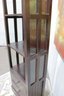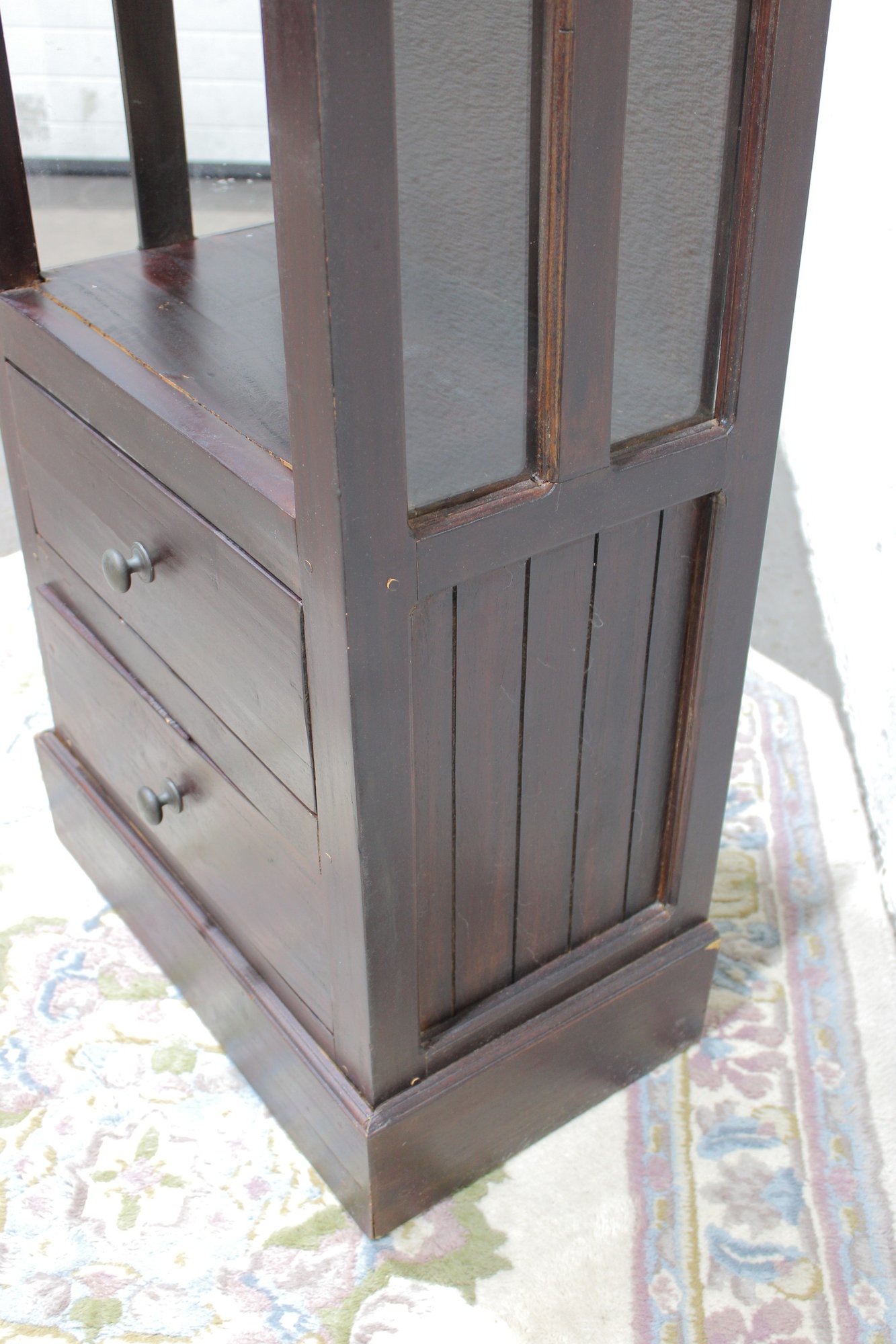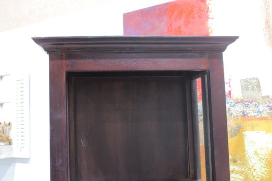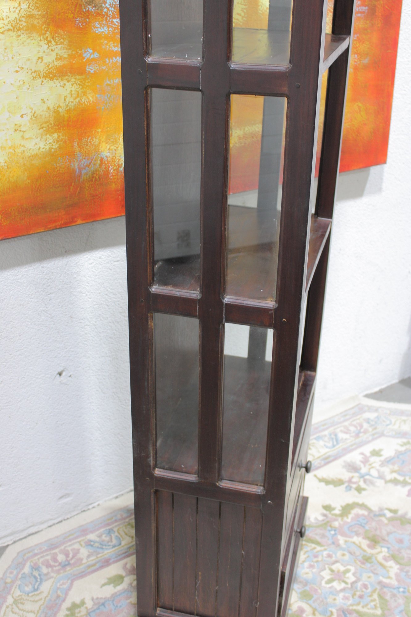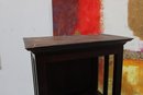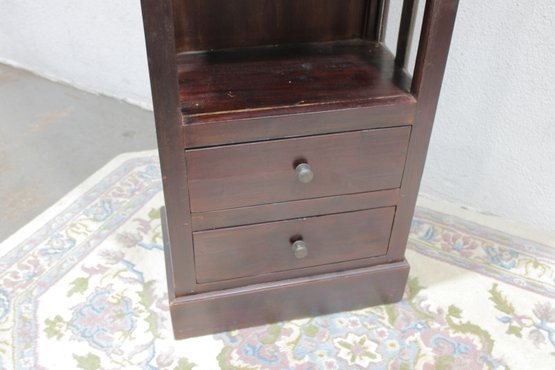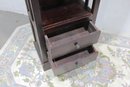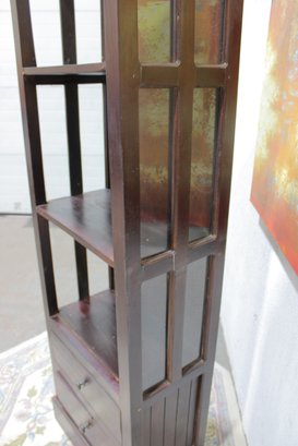 Tall dark wood display shelf cabinet featuring an open shelving design with glass side panels, one lower drawer, and a cabinet door for enclosed storage. A versatile piece that works well as a bookcase, display cabinet, or accent storage unit in a living room, office, bedroom, or hallway. The clean lines and rich dark finish give it a classic look that fits with a variety of interiors.