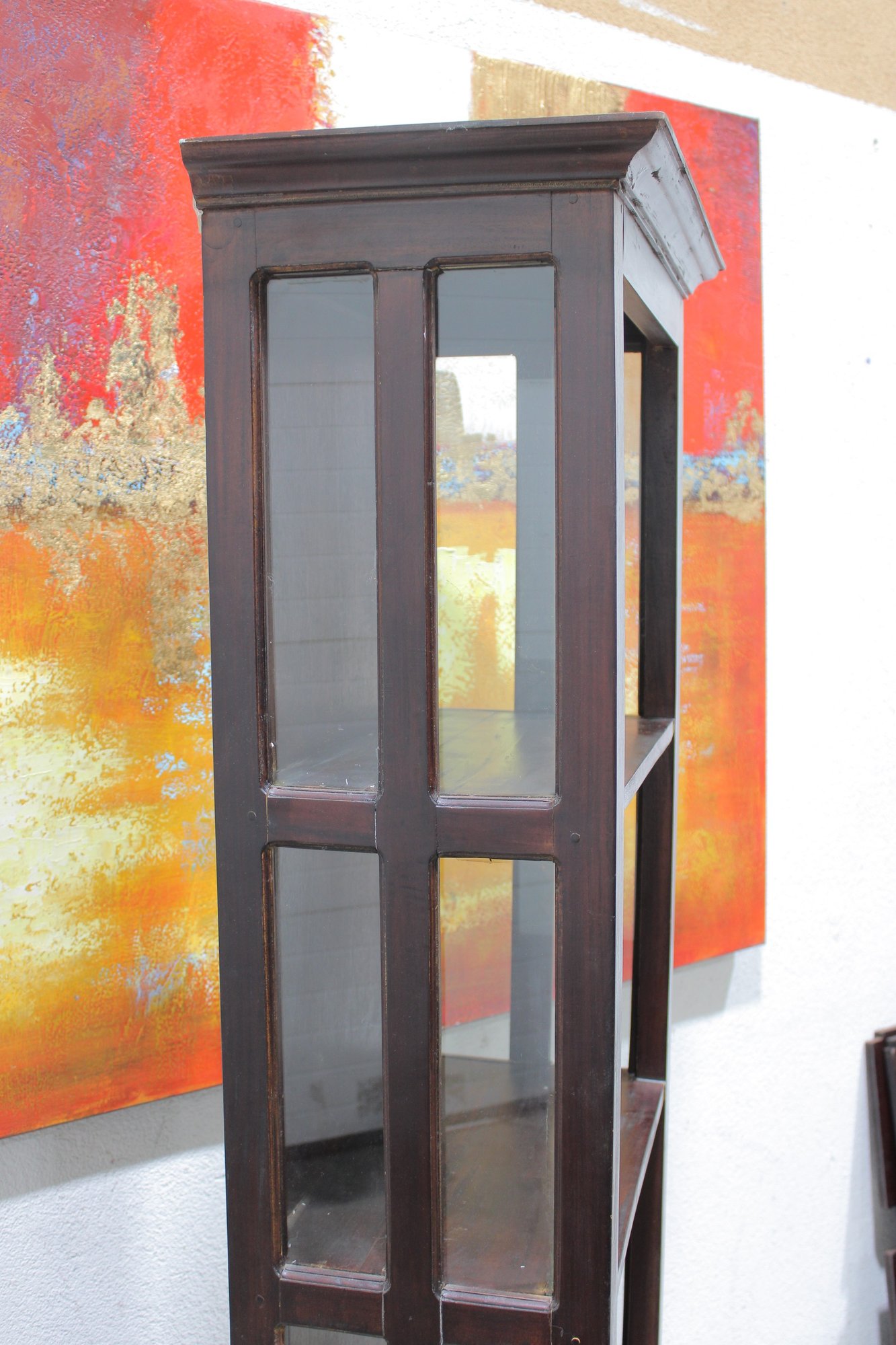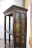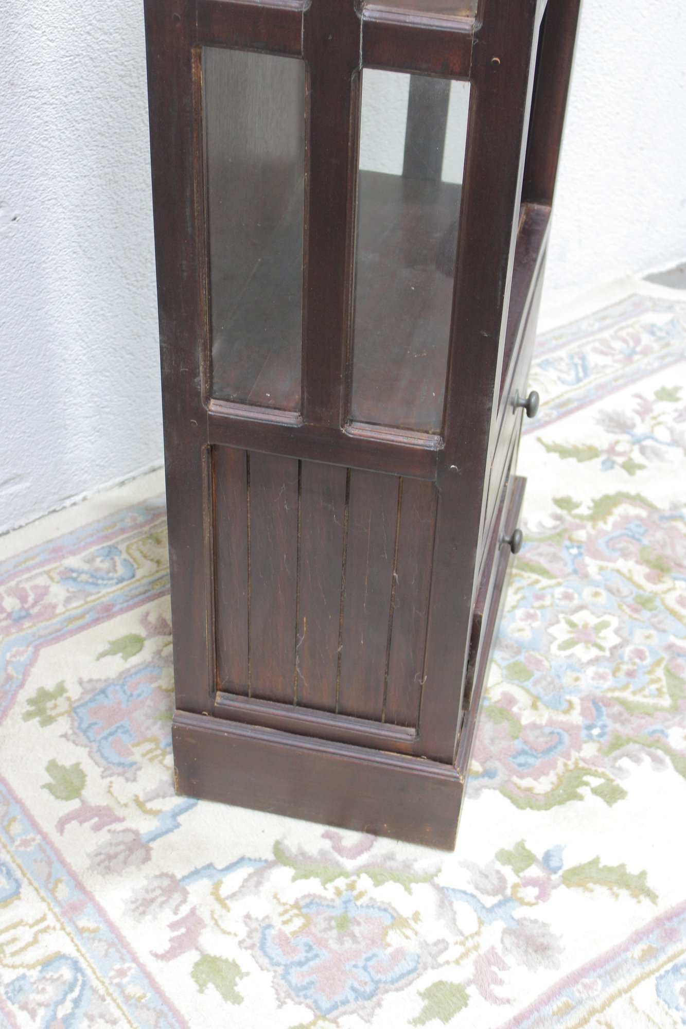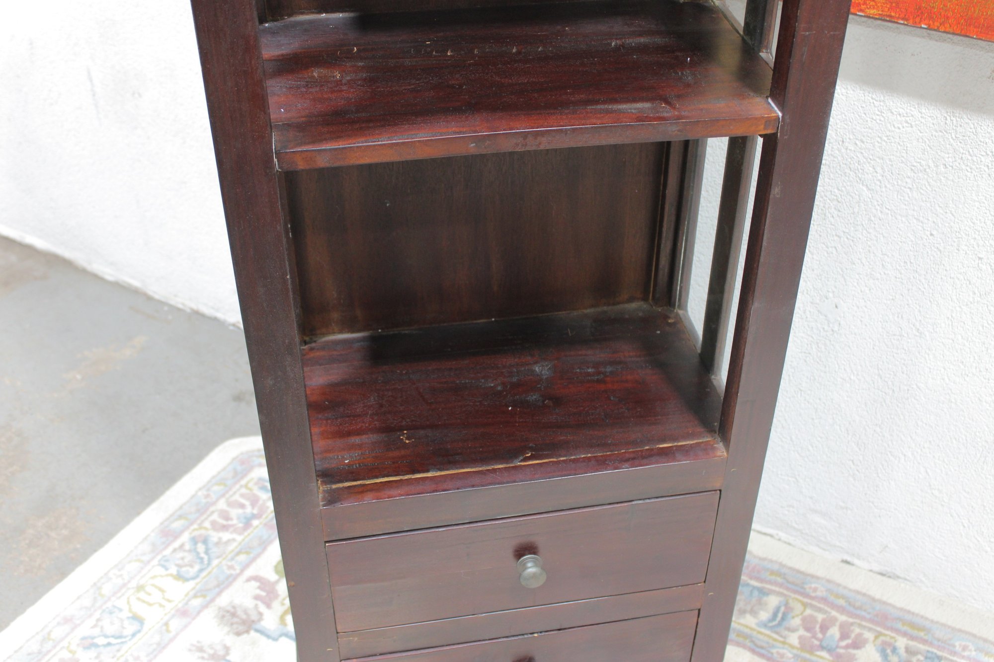 Tall dark wood display shelf cabinet featuring an open shelving design with glass side panels, one lower drawer, and a cabinet door for enclosed storage. A versatile piece that works well as a bookcase, display cabinet, or accent storage unit in a living room, office, bedroom, or hallway. The clean lines and rich dark finish give it a classic look that fits with a variety of interiors.