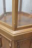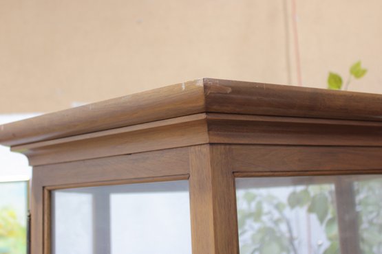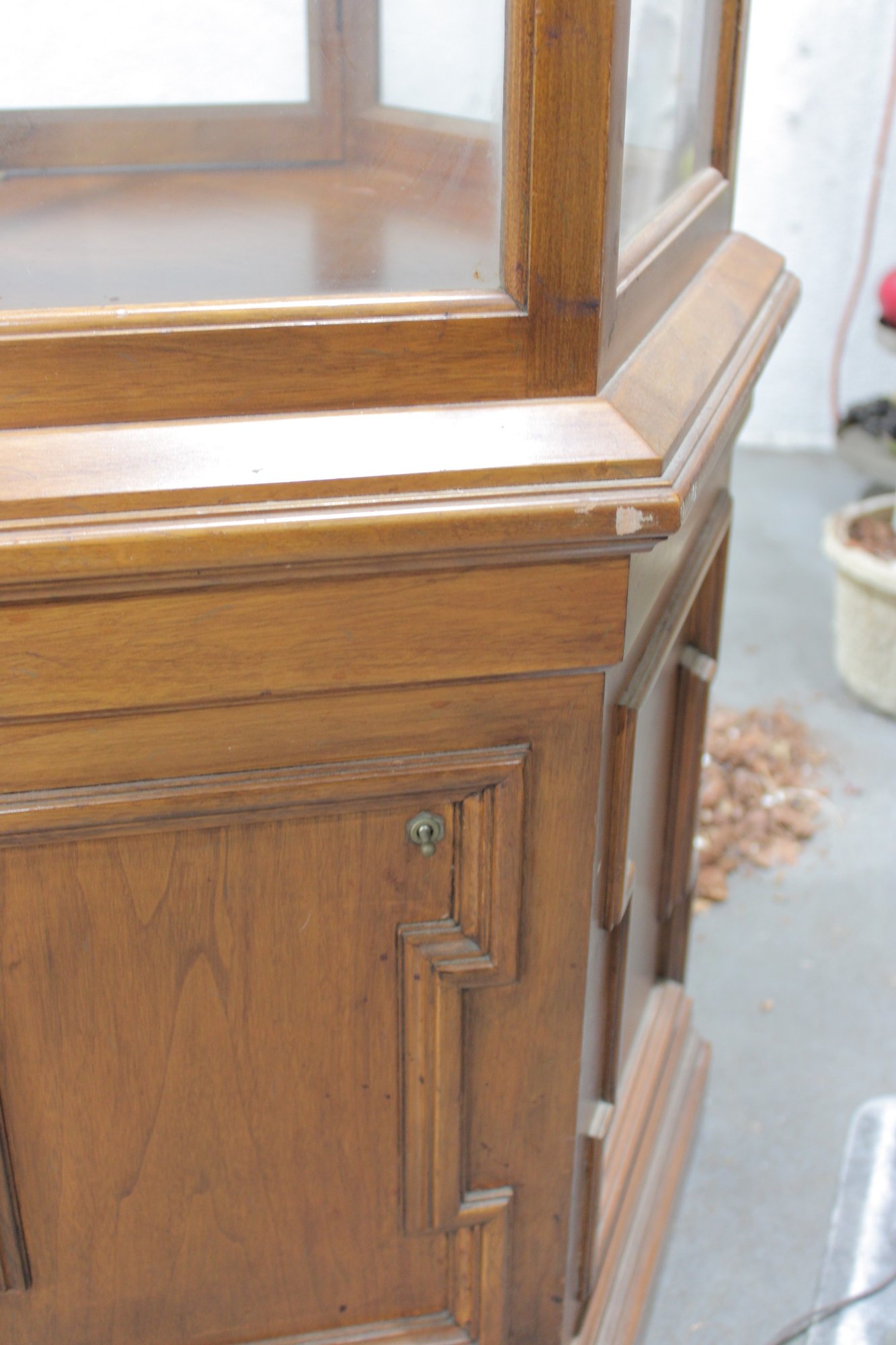 The upper display section opens with double glass doors and includes glass shelving, allowing light to pass through and highlight everything inside. The mirrored interior panels enhance visibility and add depth to the display. Below, the solid wood base offers additional enclosed storage with double doors—perfect for keeping accessories, linens, or extra pieces neatly tucked away.