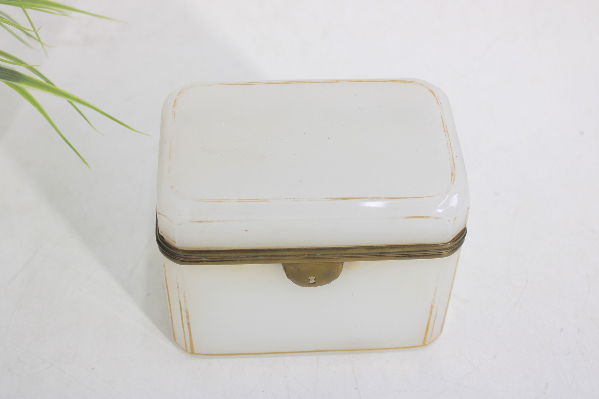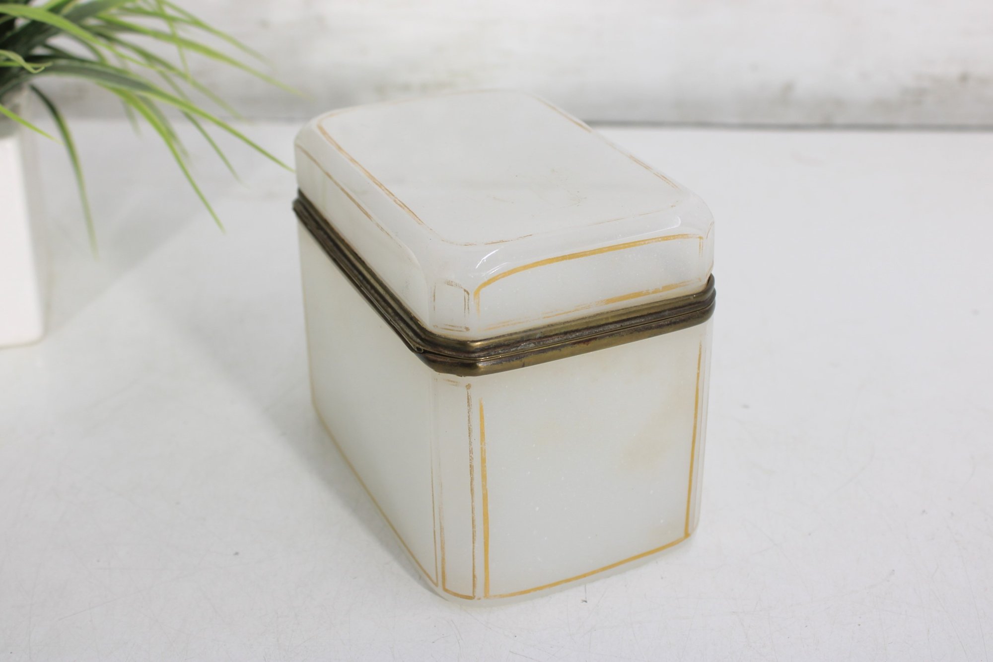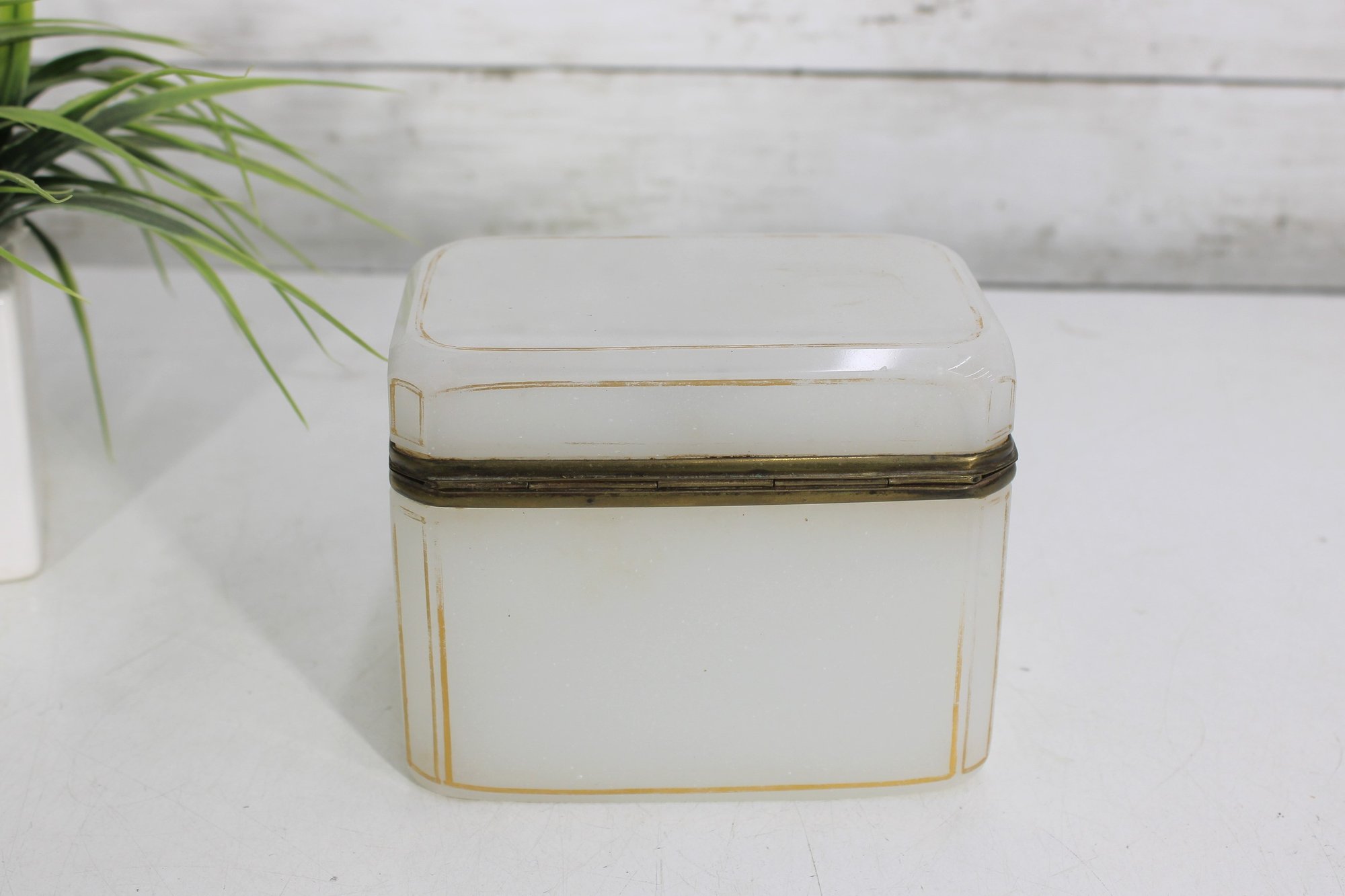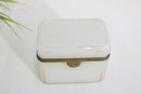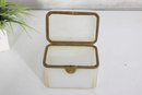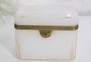 Striking vintage milk glass storage box, featuring clean lines, a softly translucent white body, and a hinged lid with metal trim and latch. Its tall, slender profile gives it a dramatic apothecary or display-cabinet presence, perfect for collectors, interior designers, or anyone looking for an unusual accent piece.