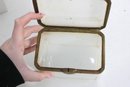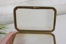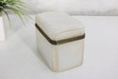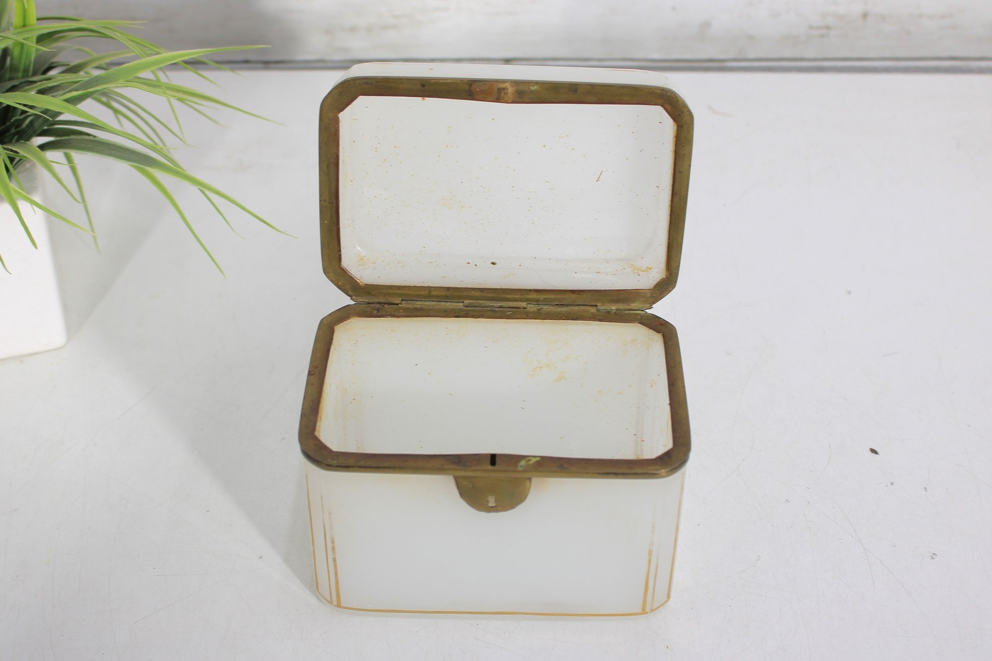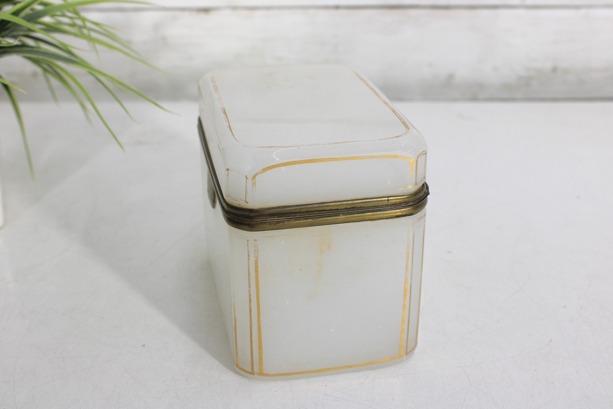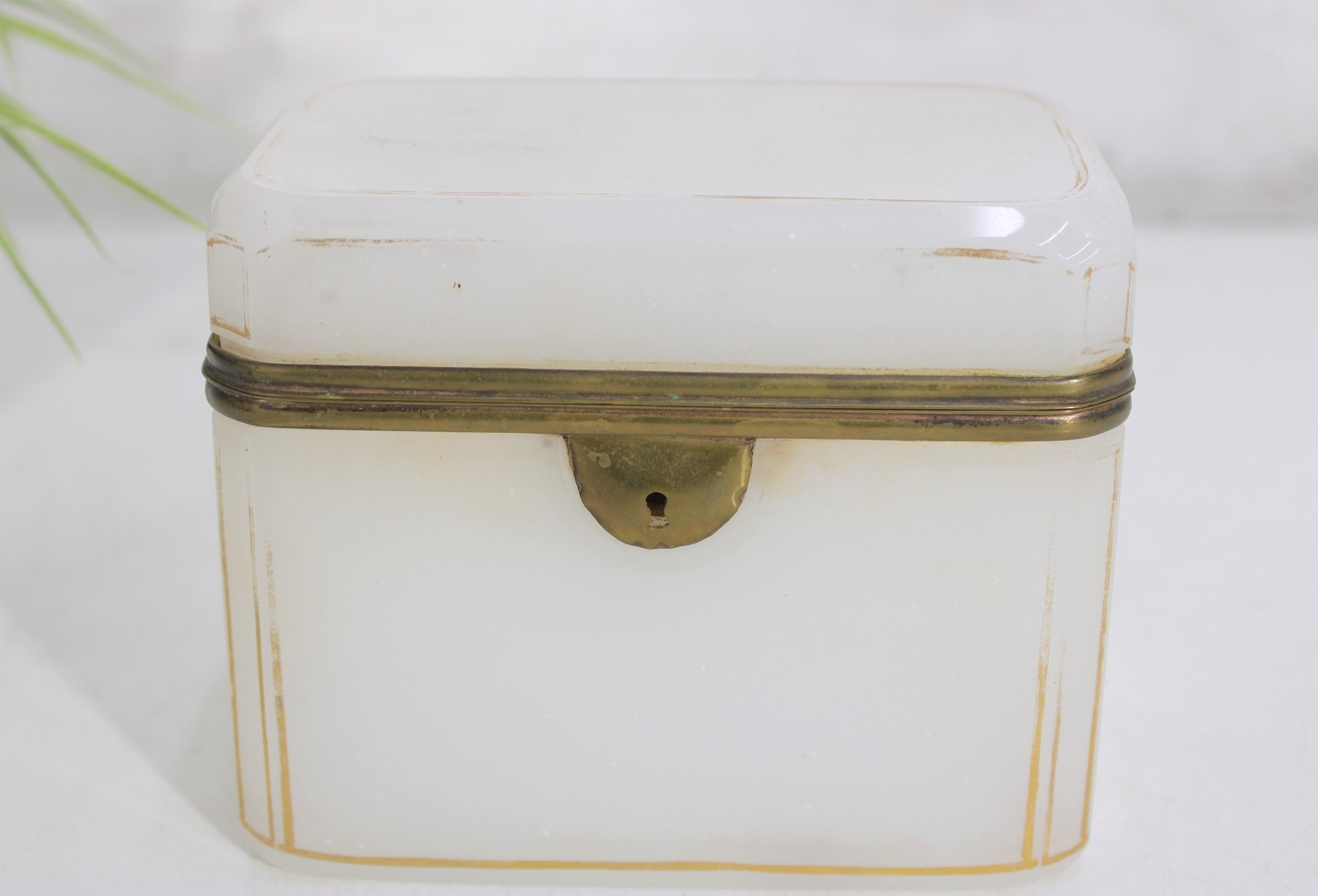 Striking vintage milk glass storage box, featuring clean lines, a softly translucent white body, and a hinged lid with metal trim and latch. Its tall, slender profile gives it a dramatic apothecary or display-cabinet presence, perfect for collectors, interior designers, or anyone looking for an unusual accent piece.