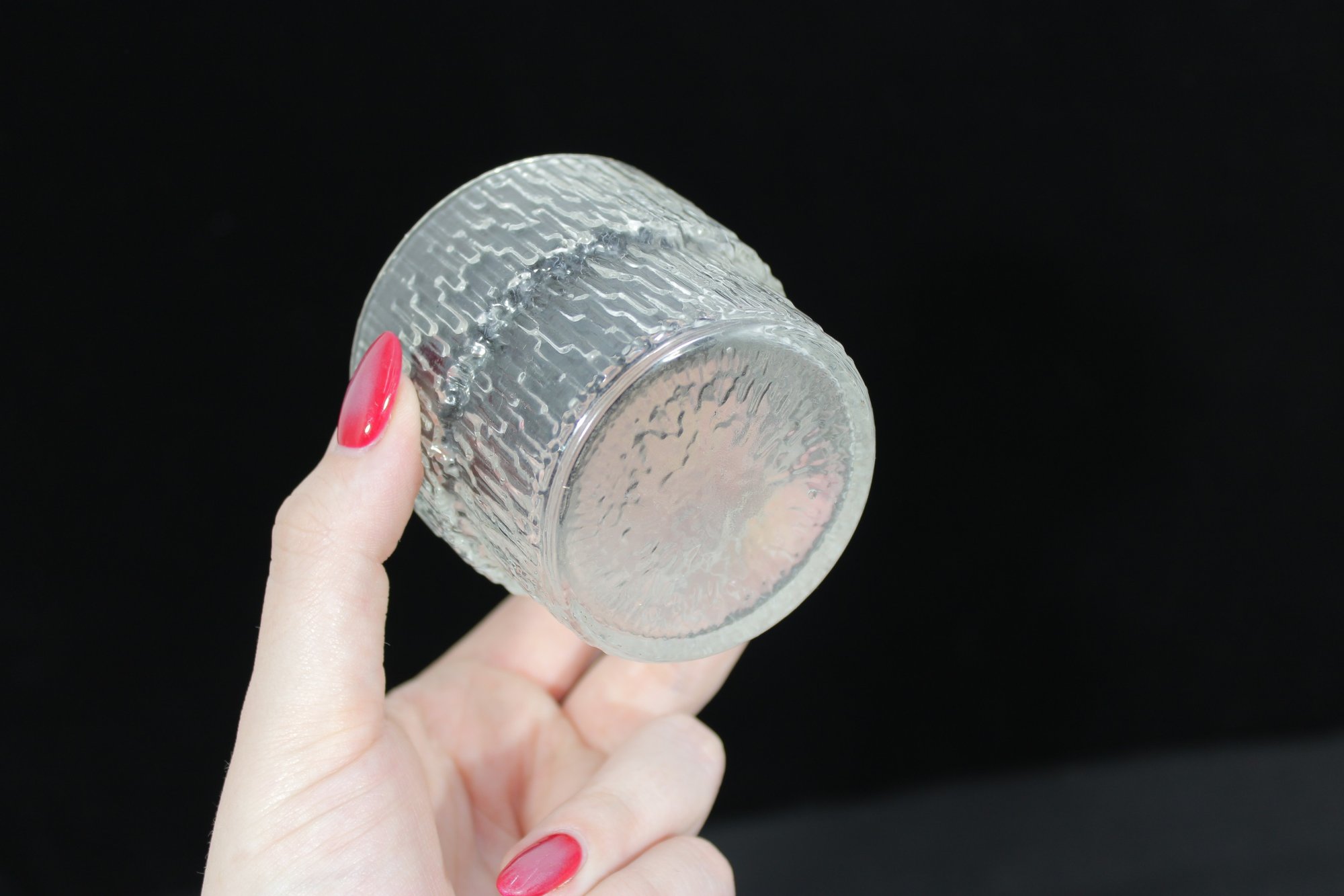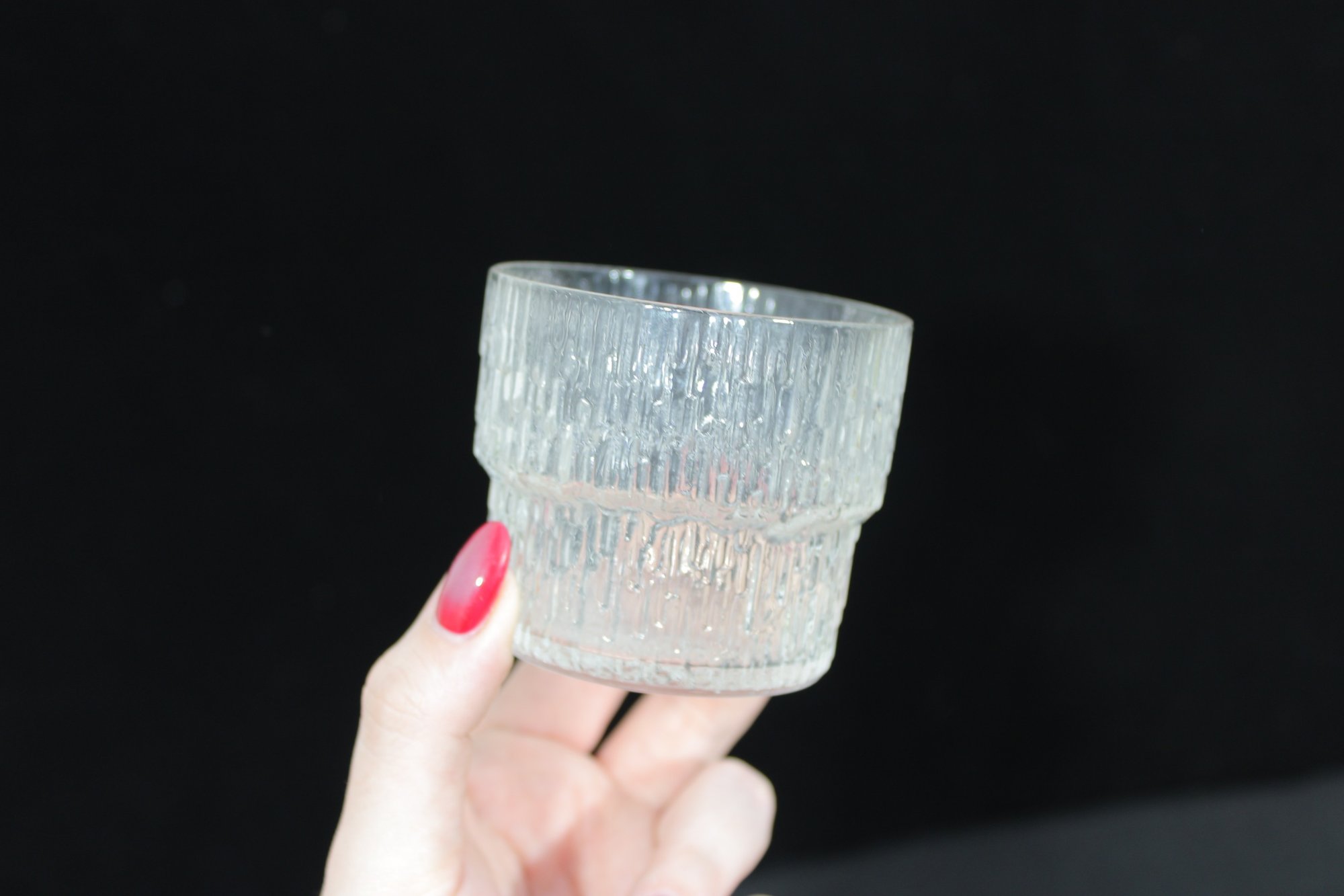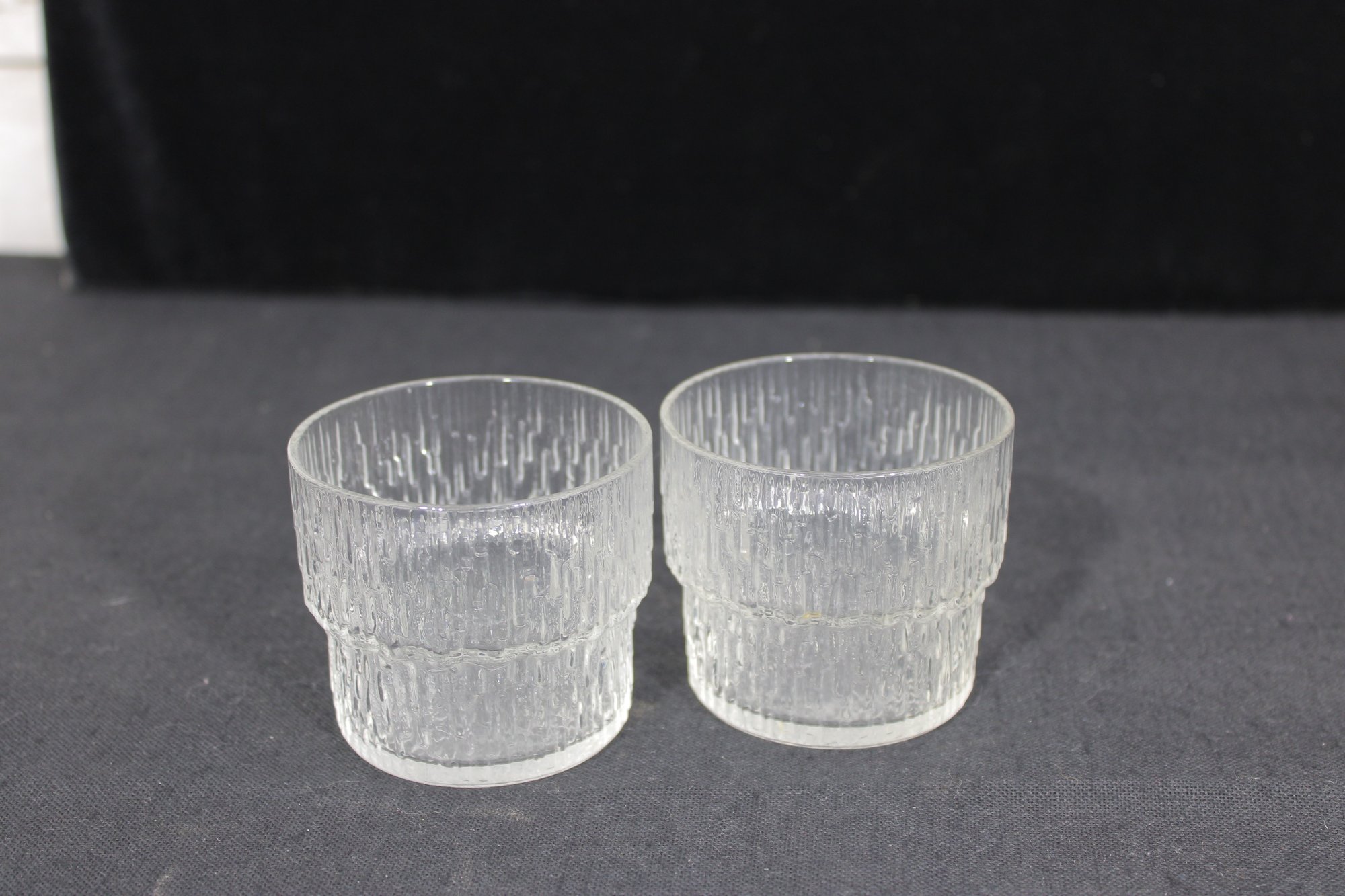 Iconic mid-century modern glassware set designed by Tapio Wirkkala for Iittala, featuring the highly collectible Ultima Thule pattern. Inspired by melting ice in Lapland, the textured surface creates a striking, organic look that beautifully diffuses light.