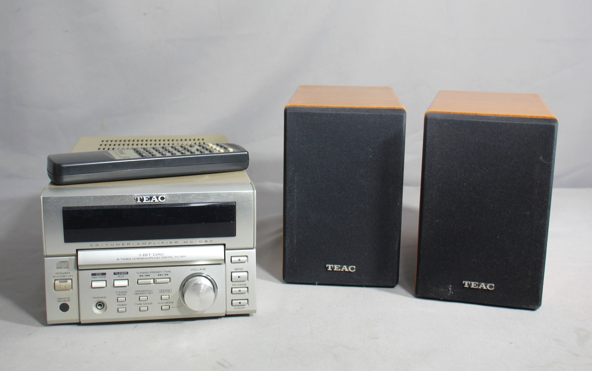 This vintage ensemble brings the nostalgic charm of the 90s audio experience to your living space. The system features a CD player, tuner, and amplifier, all encased in a classic silver finish that adds a retro touch to any room. The two speakers boast a sleek black design with wood accents, promising a combination of style and acoustic quality.