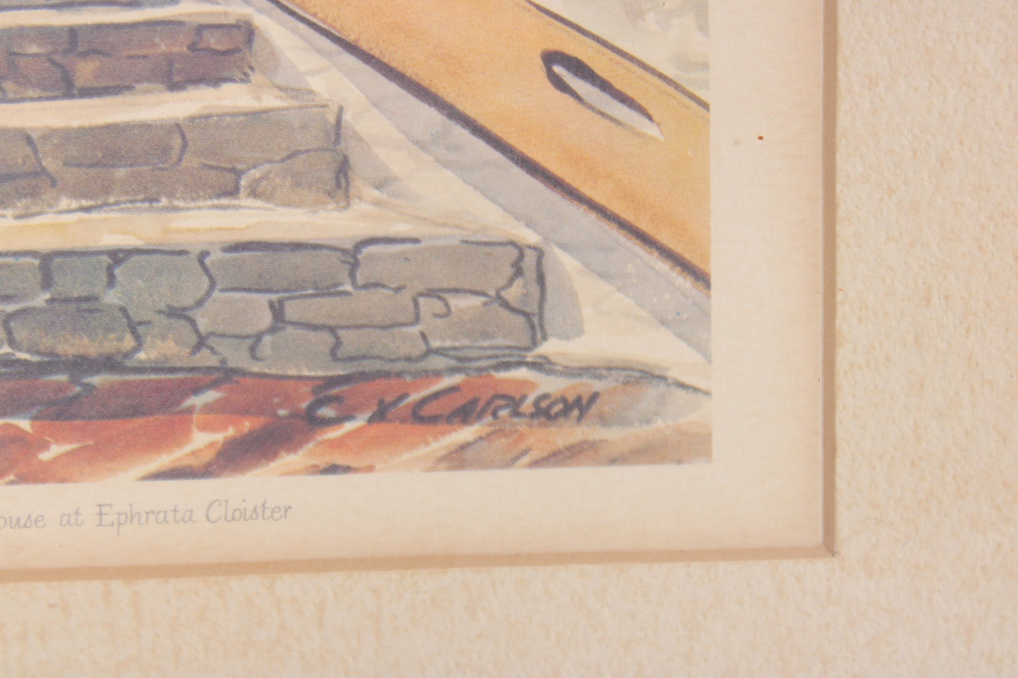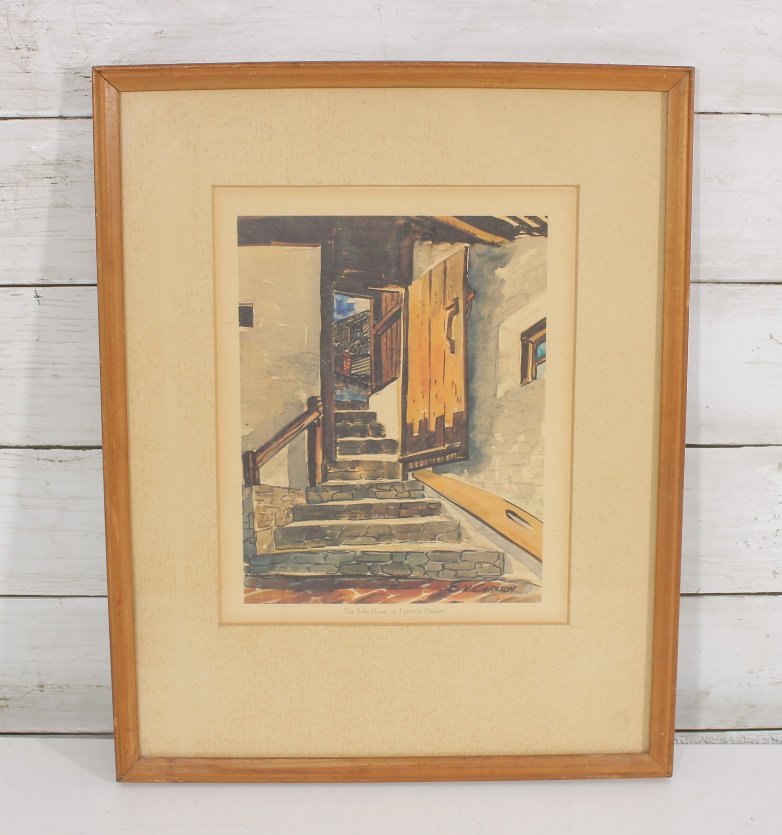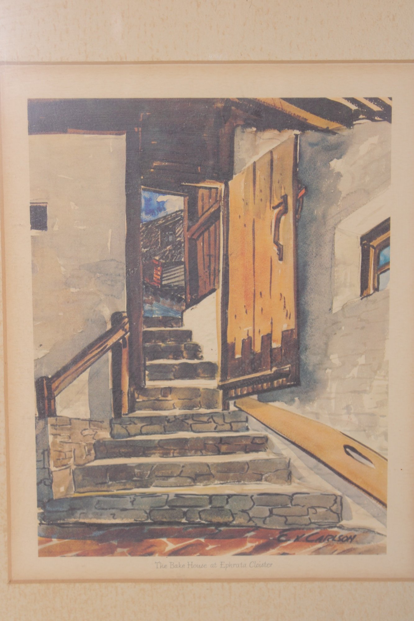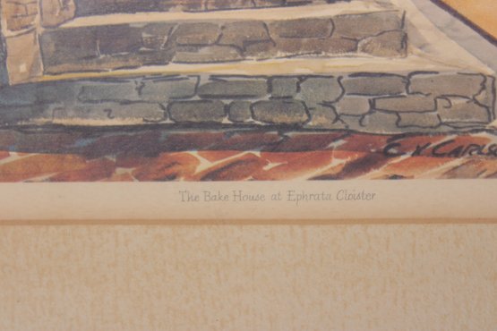 framed print titled “The Bake House at Ephrata Cloister,” depicting a historic architectural scene with stone steps, rustic doors, and warm-toned textures. The composition captures the character and atmosphere of the historic Ephrata Cloister, rendered in a painterly style with earthy hues and strong perspective.